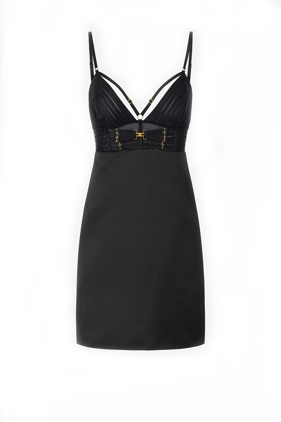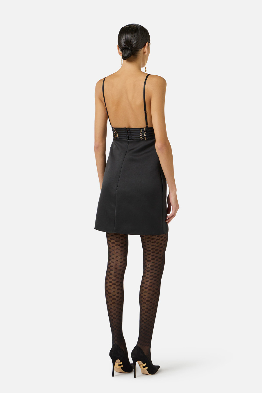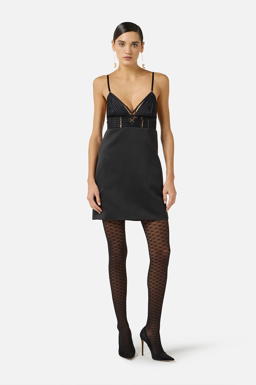 Elisabetta Franchi mini dress in duchesse satin with elasticated detailing, featuring thin straps and distinguished by a bodice embellished with lingerie-inspired elasticated trim, embroidered on the cups and across the bodice.