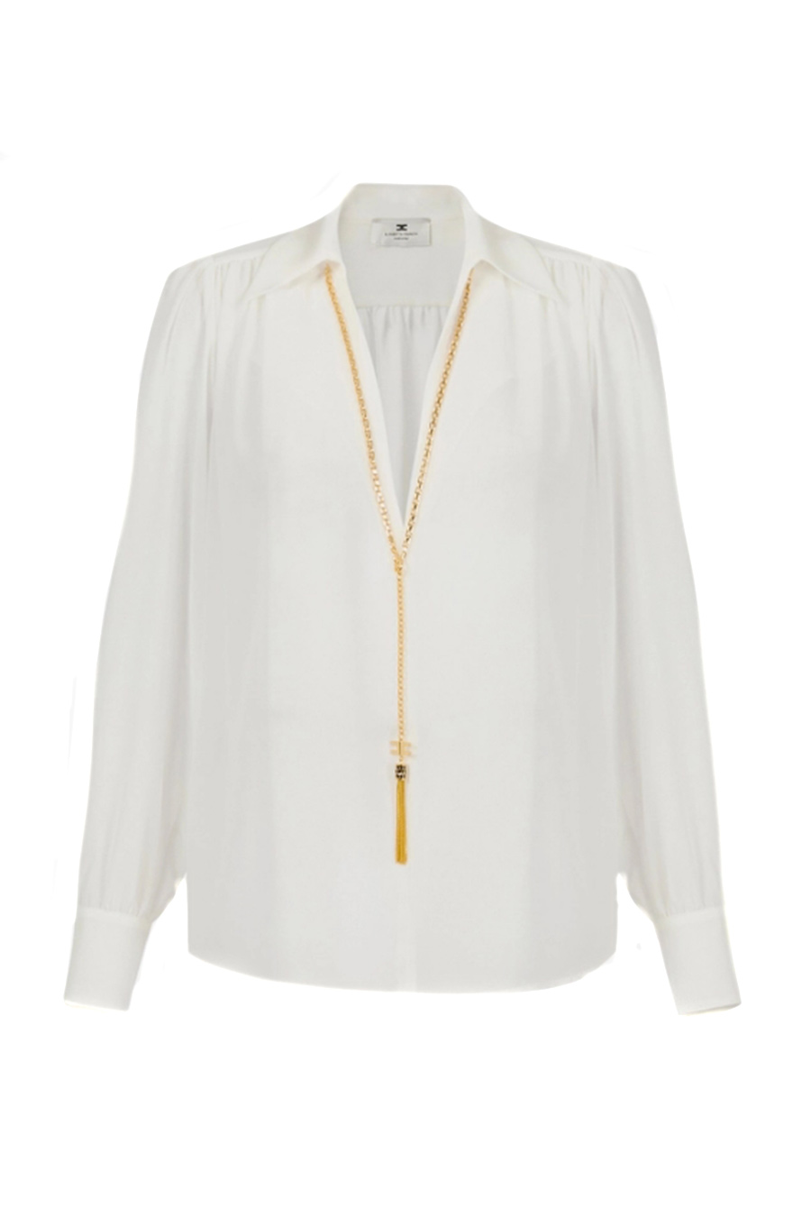 Georgette shirt with Elisabetta Franchi necklace, featuring a V-neck collar and long sleeves slightly gathered at the shoulder, with a chain necklace featuring the logo and tassels.