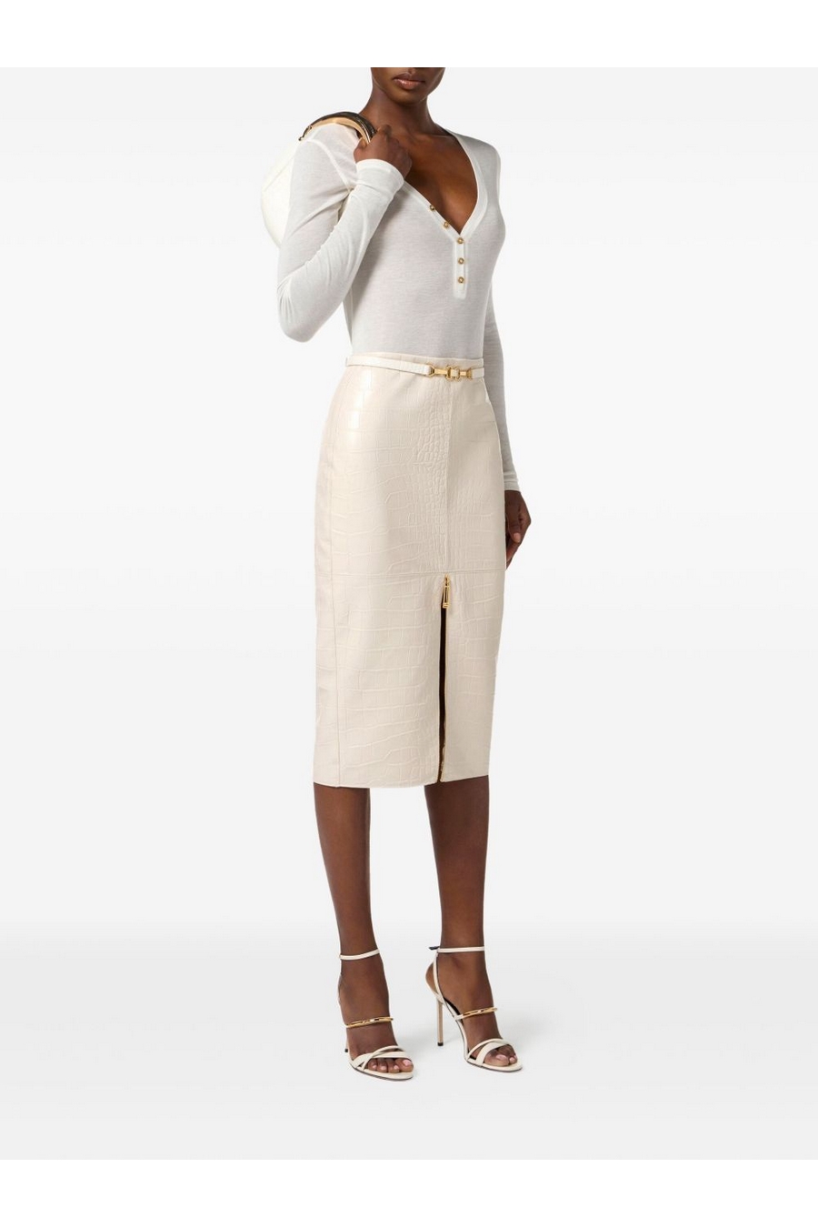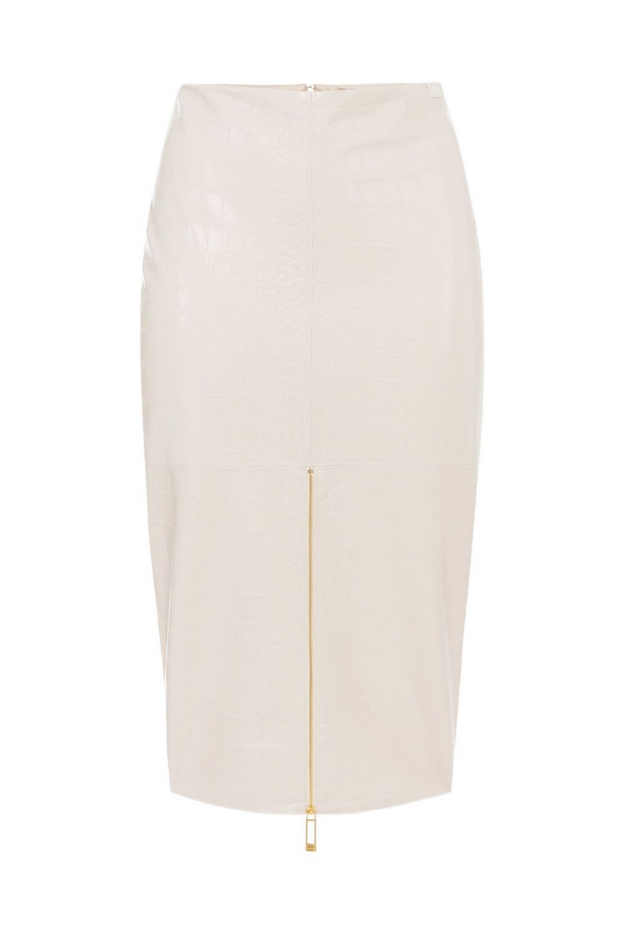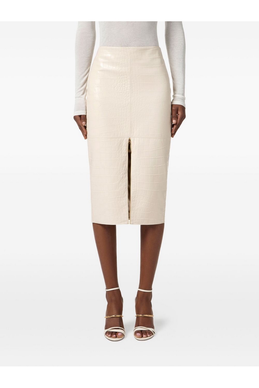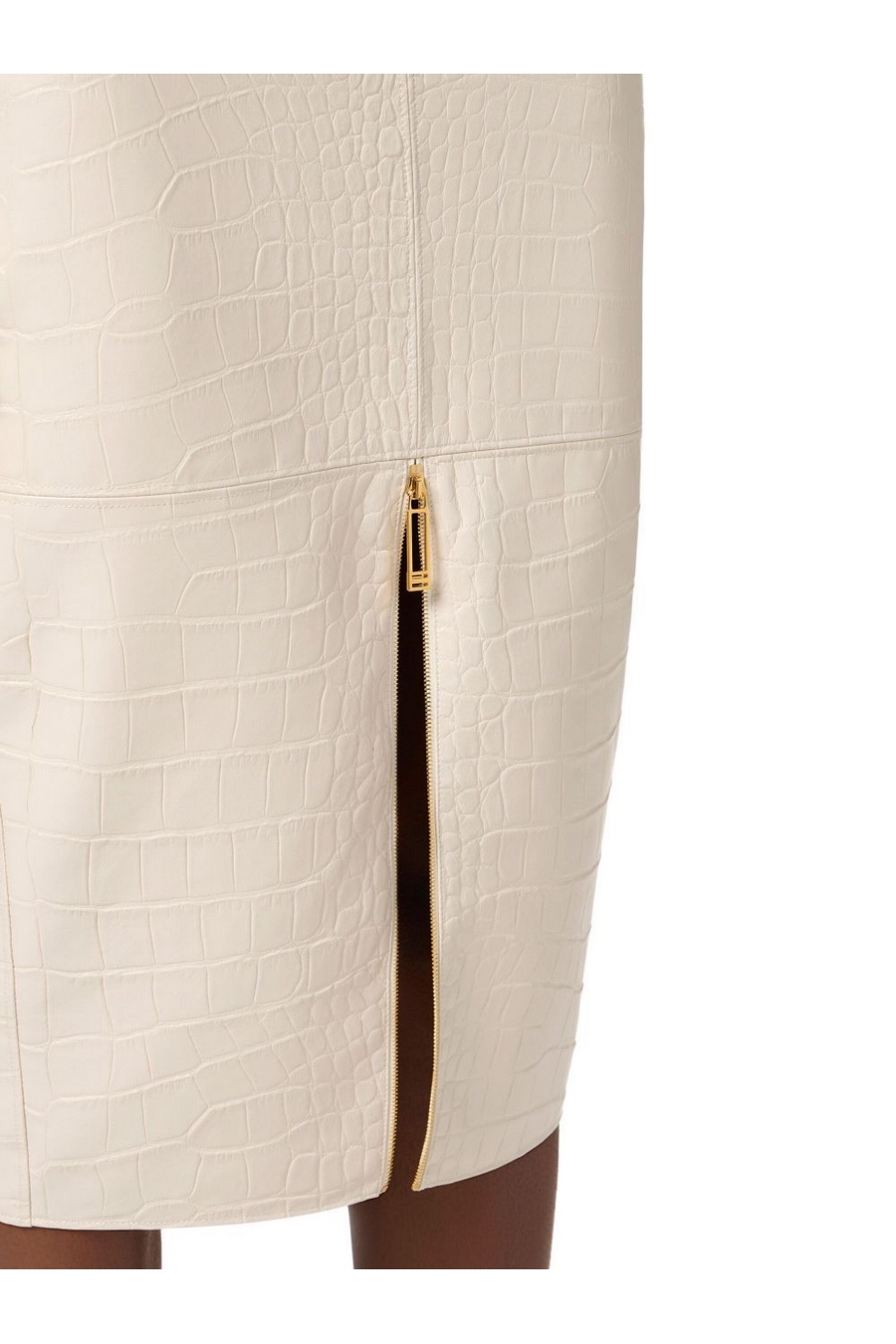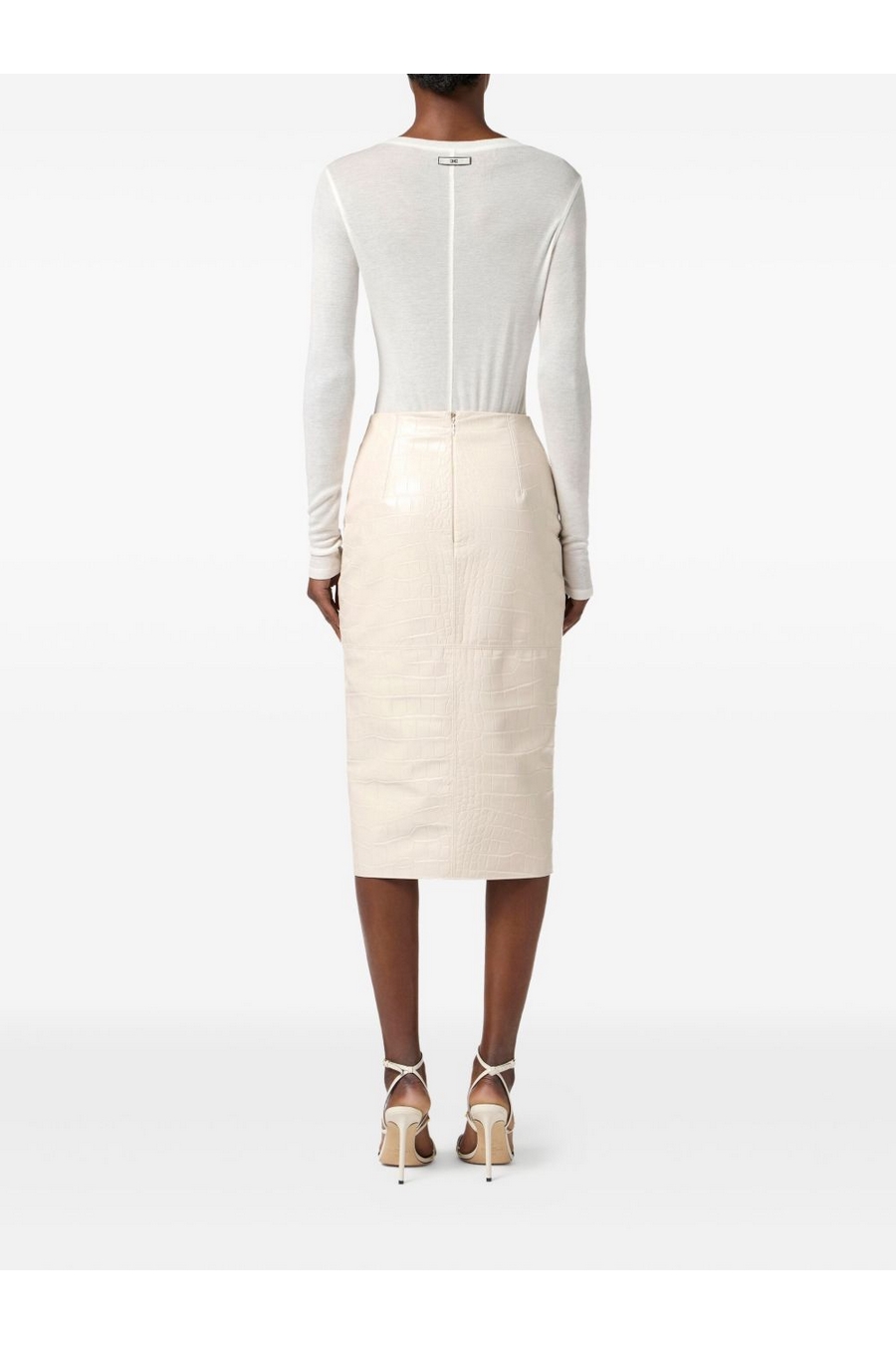 Elisabetta Franchi pencil skirt with crocodile print texture in synthetic leather-effect material, gold metal zip that illuminates the front slit.