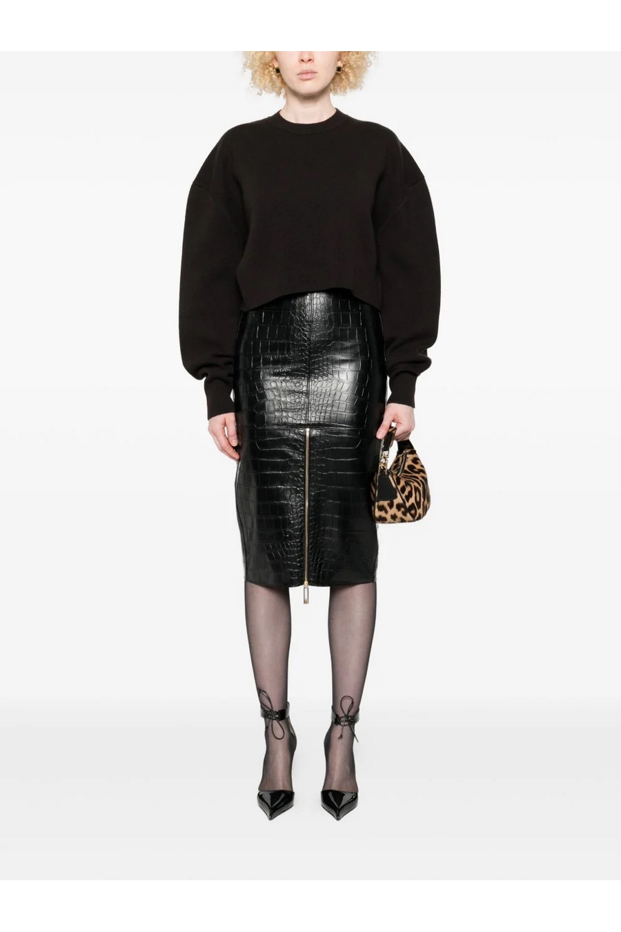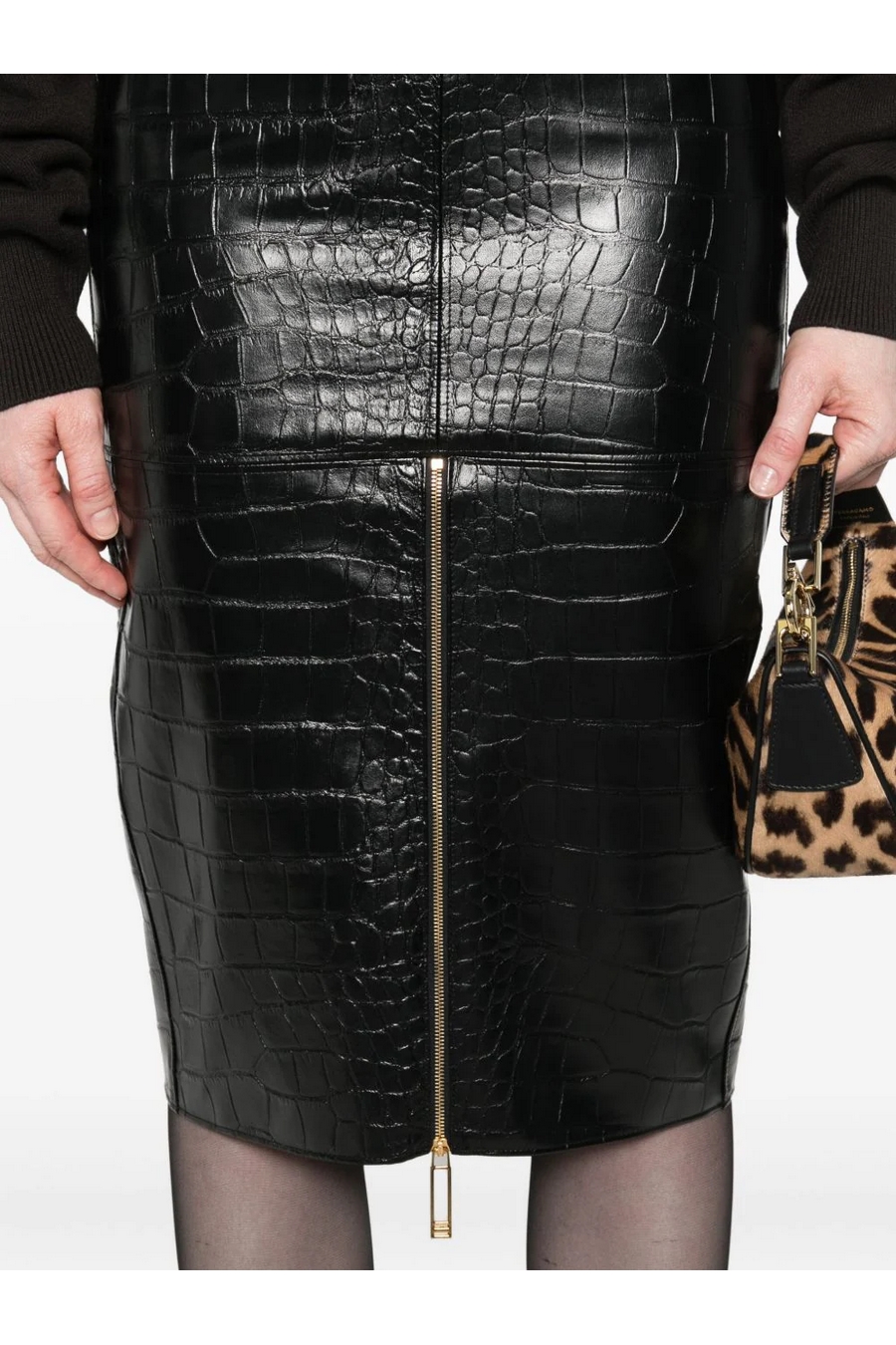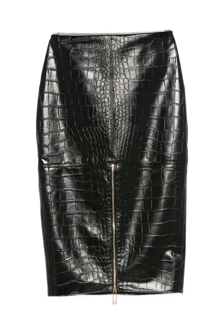 Elisabetta Franchi pencil skirt with crocodile print texture in synthetic leather-effect material, gold metal zip that illuminates the front slit.