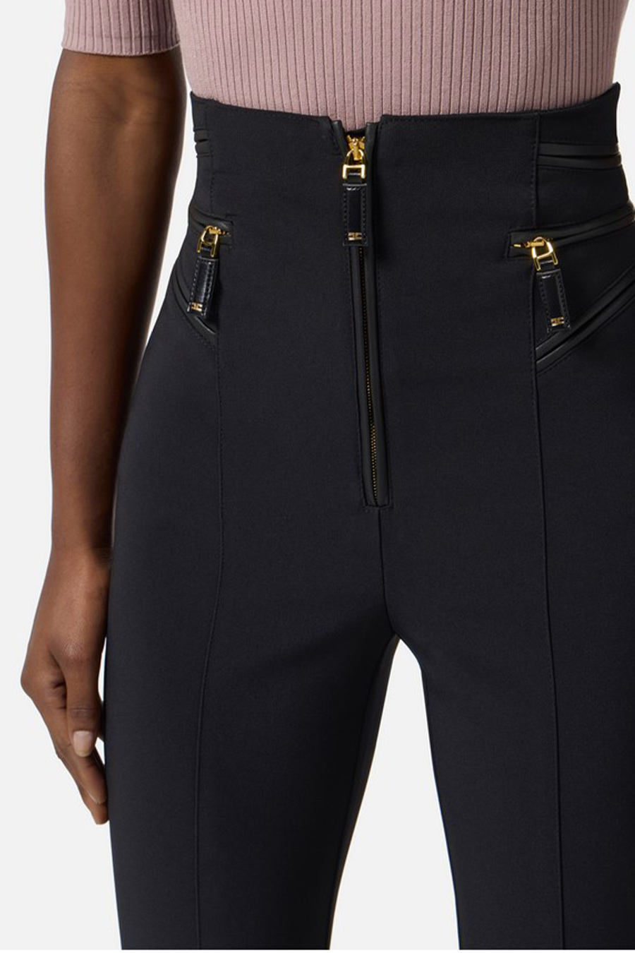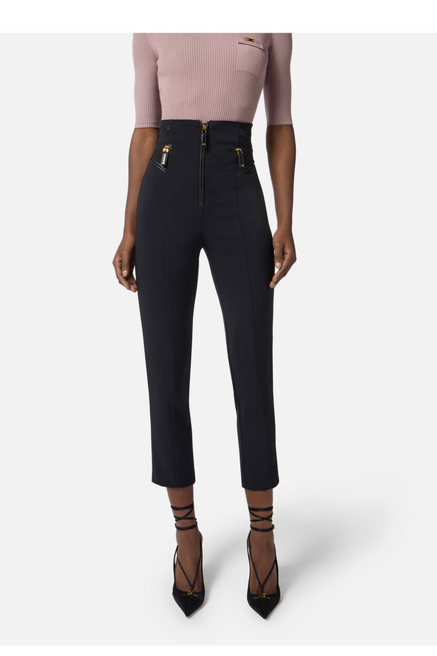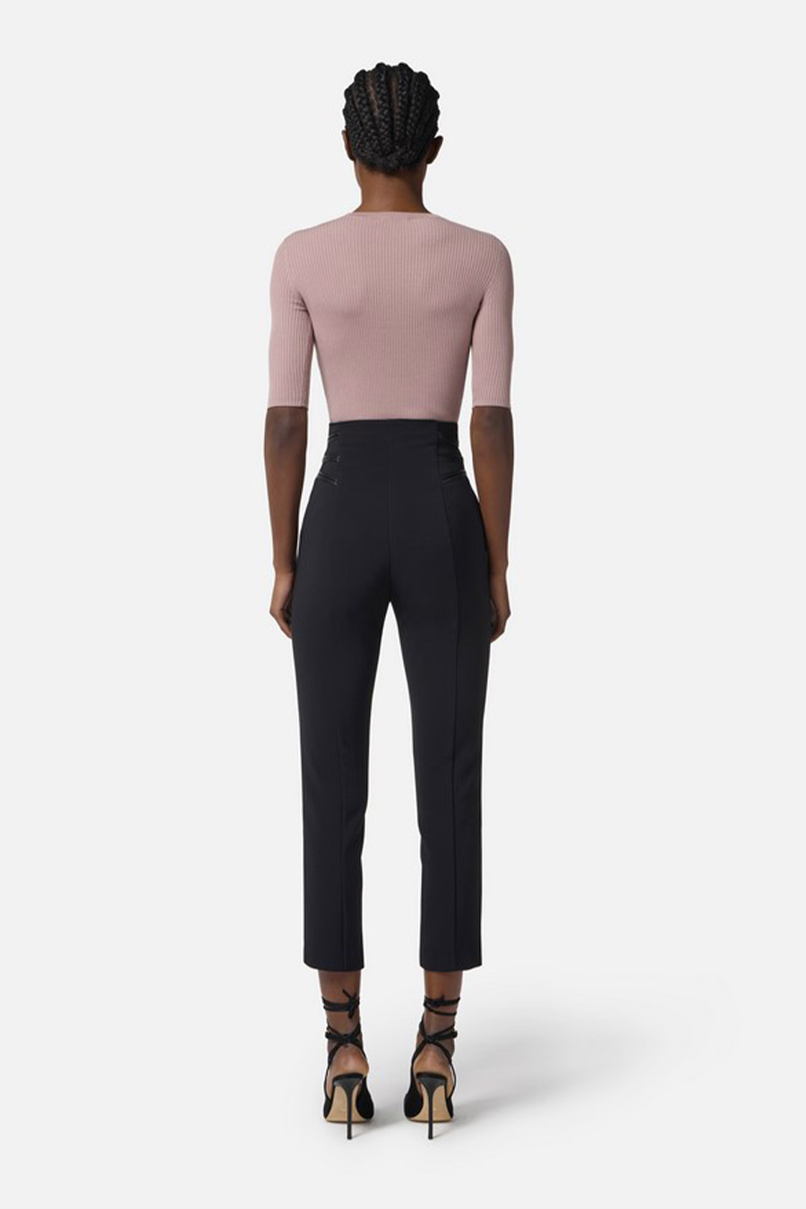 Elisabetta Franchi cool wool double-breasted jacket with front flap and welt pockets, featuring spear lapels with dot stitching.
