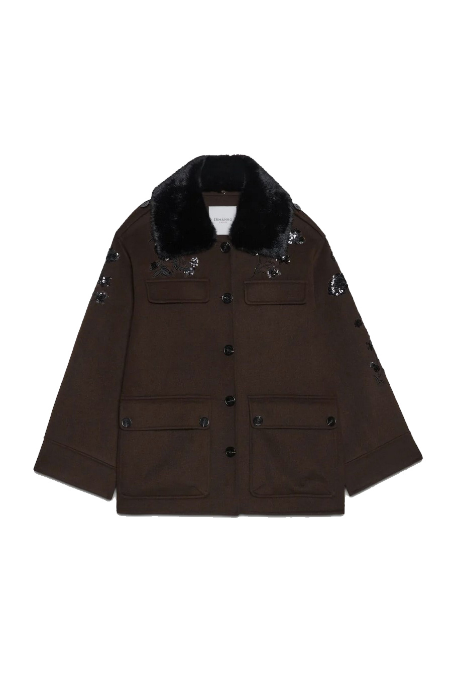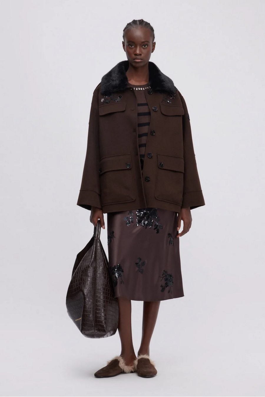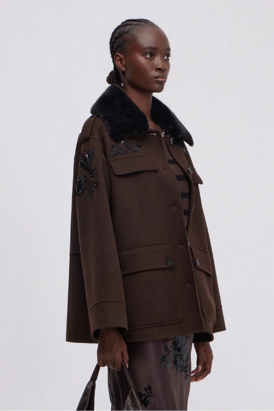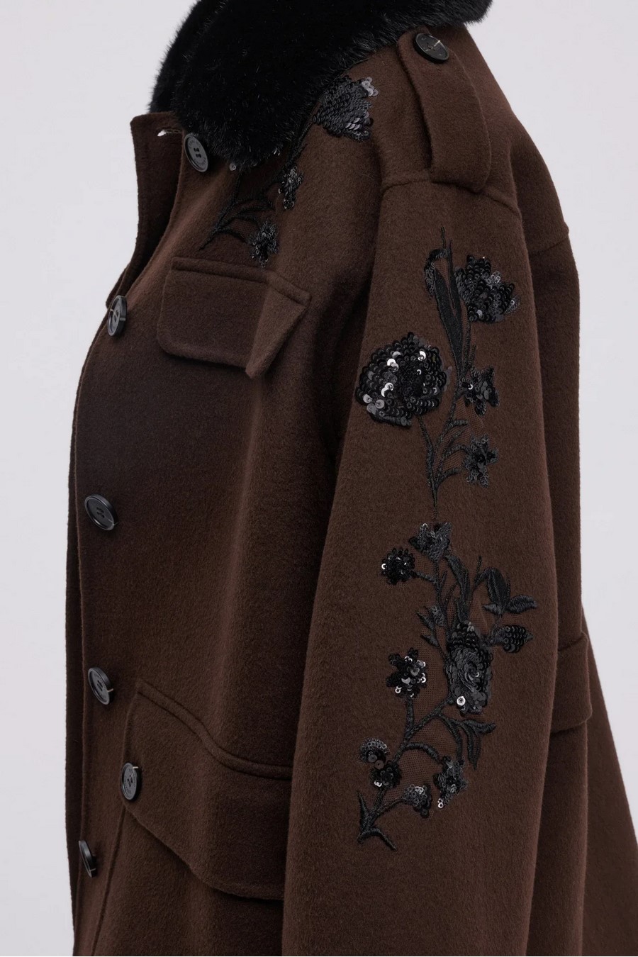 Ermanno Scervino unlined double wool pea coat with a detachable black faux mink collar and exquisite black sequin embroidery. It features a soft, cape-like fit with wide side slits and front patch pockets. This piece has a slightly oversized fit we recommend sizing down for a more regular fit.