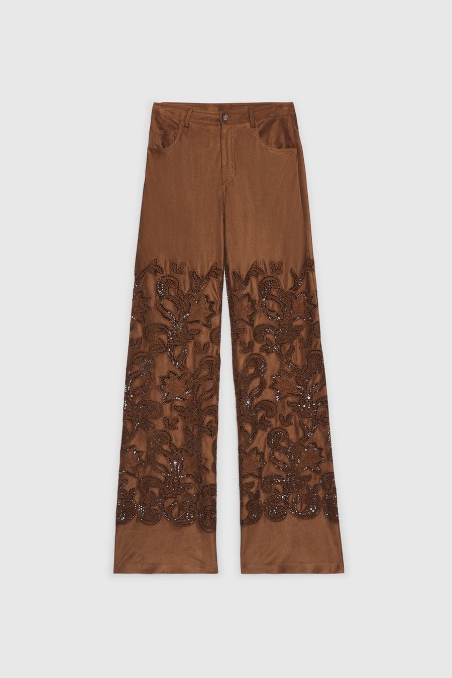 5-pocket flare trousers in suede-effect leather with intricate broderie anglaise. Low-rise