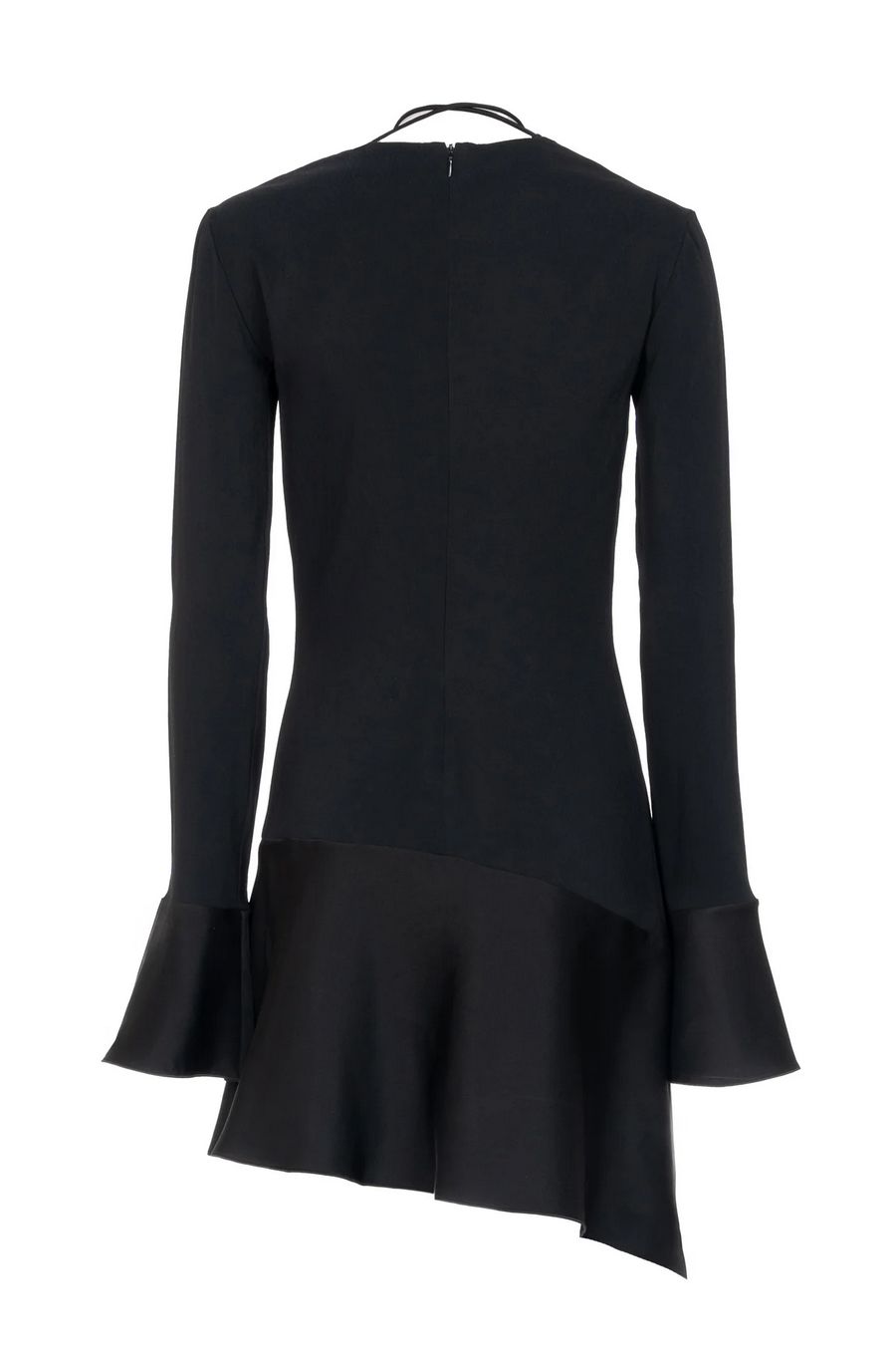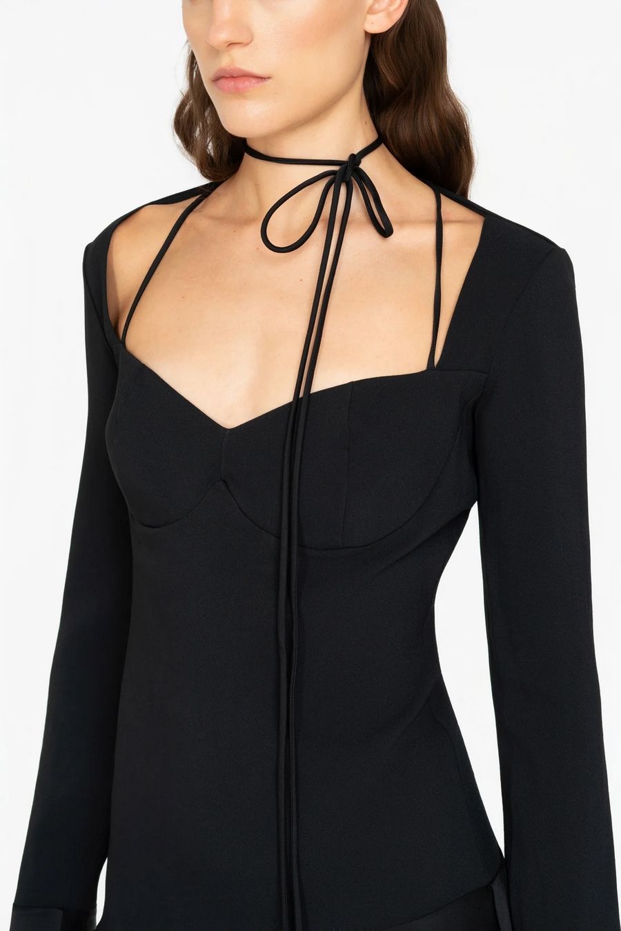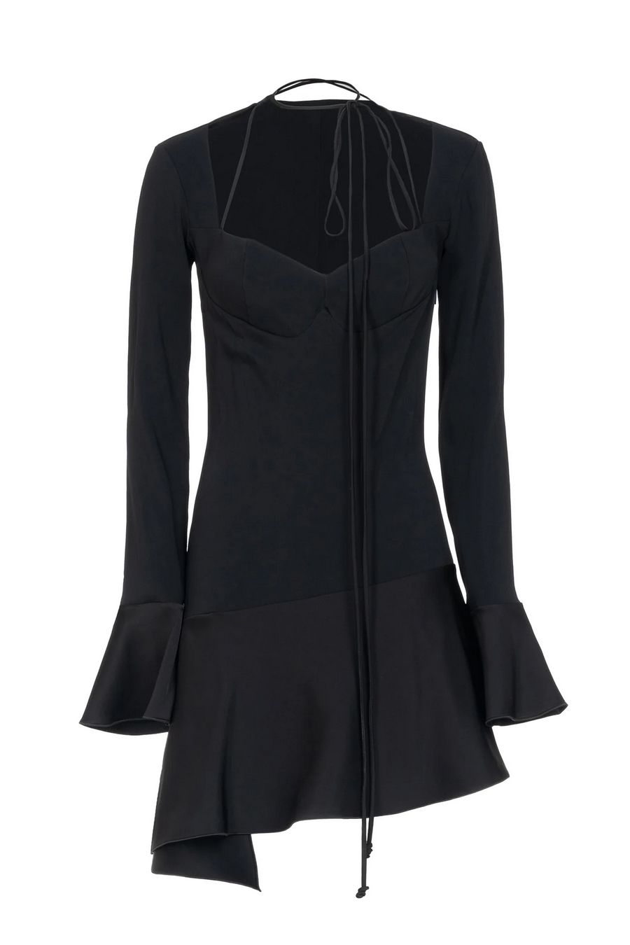 Les filles d'Eva short dress in stretch fabric with a fitted silhouette. Square neckline, long sleeves, tie closure at the neck and flared hem.