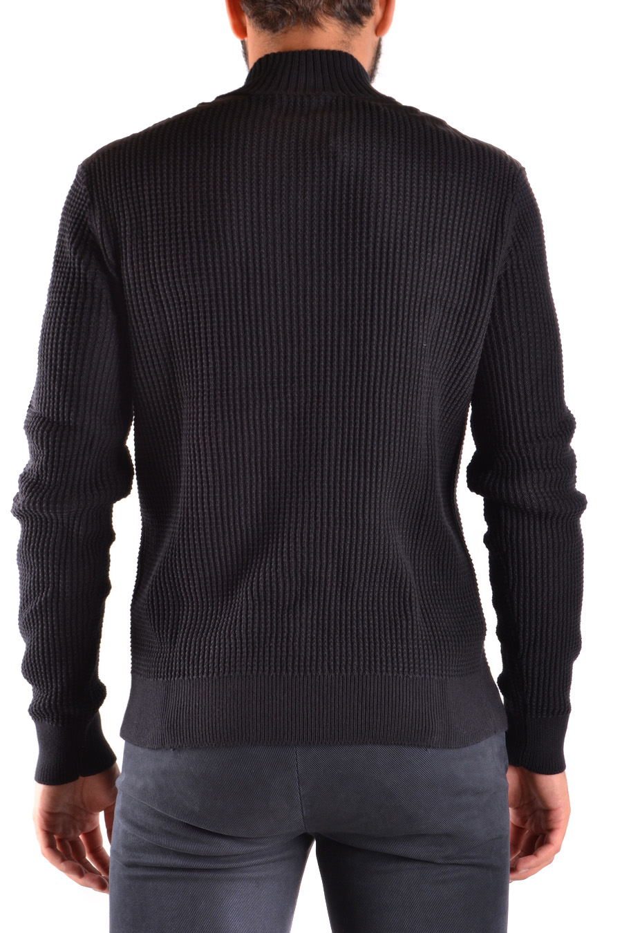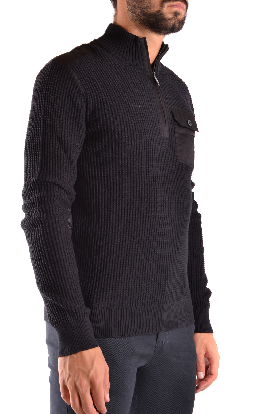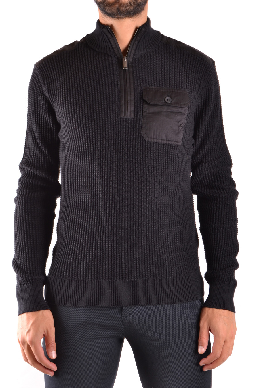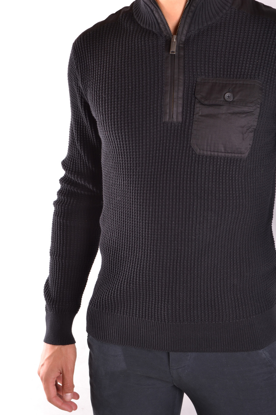 zipped hig neck knitted cotton sweater with pocket applied in front and different fabric inserts at the shoulder