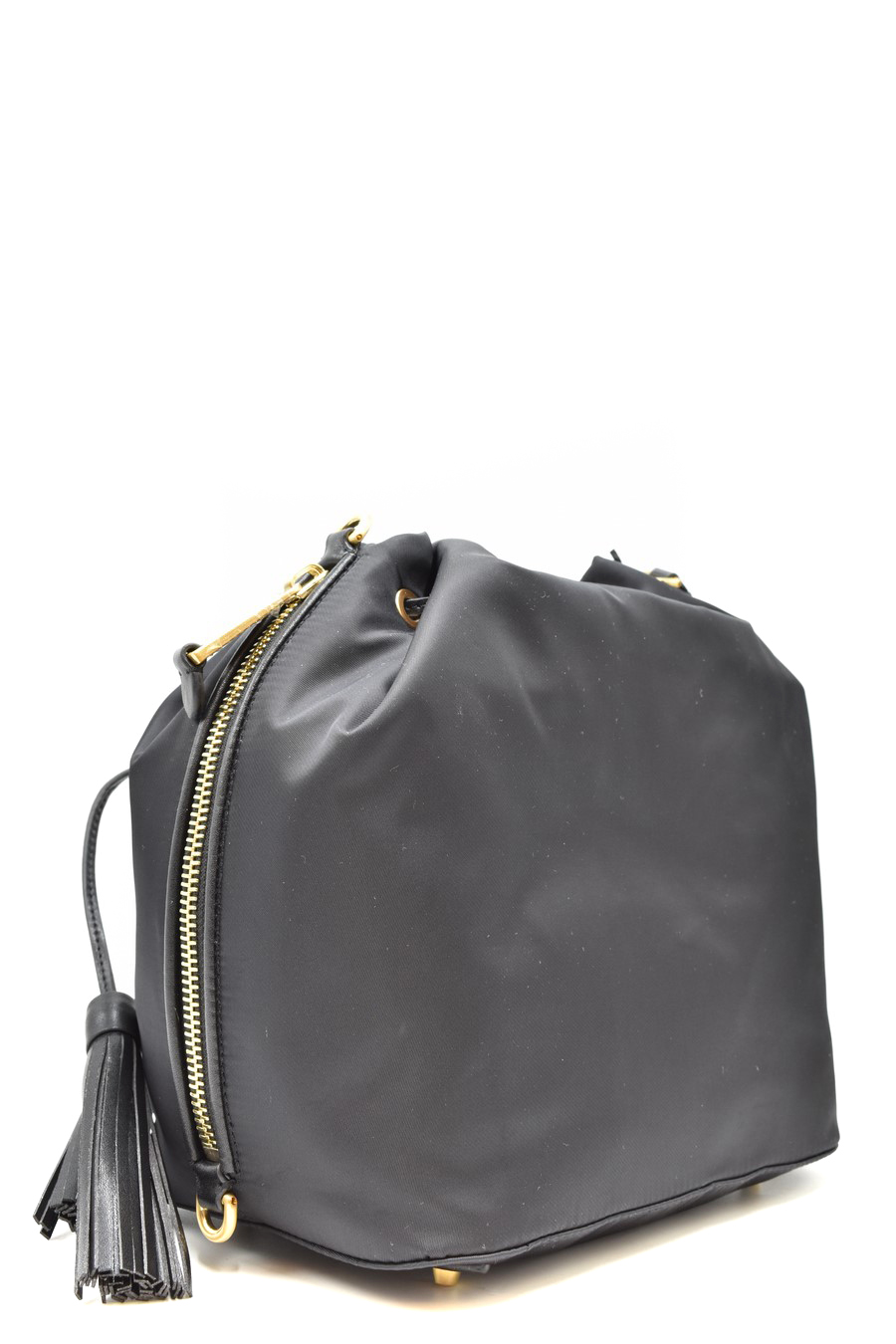 black bucket-bag from Moschino featuring shoulder strap, drawstring fastening, gold-tone hardware and fron logo plaque