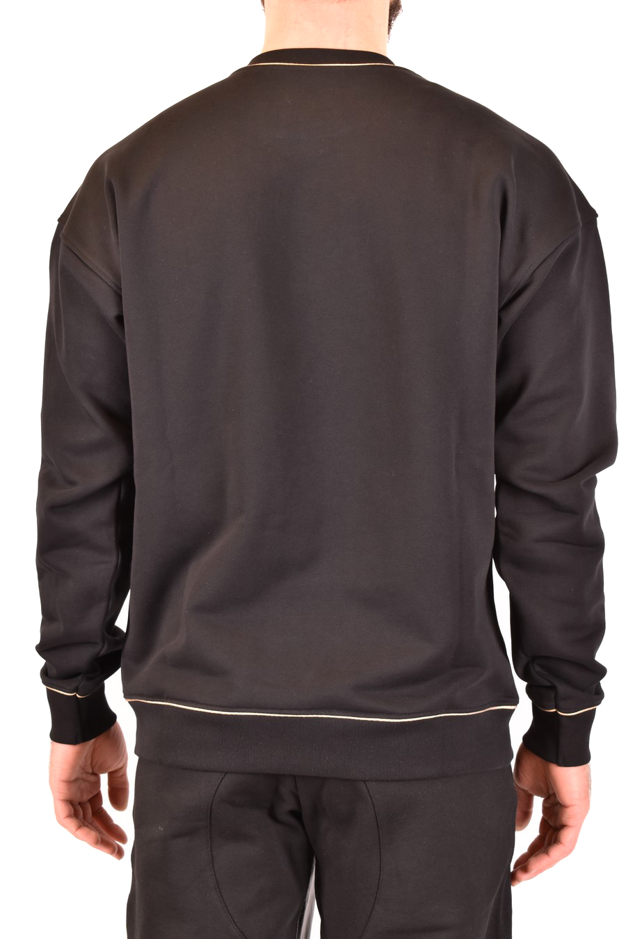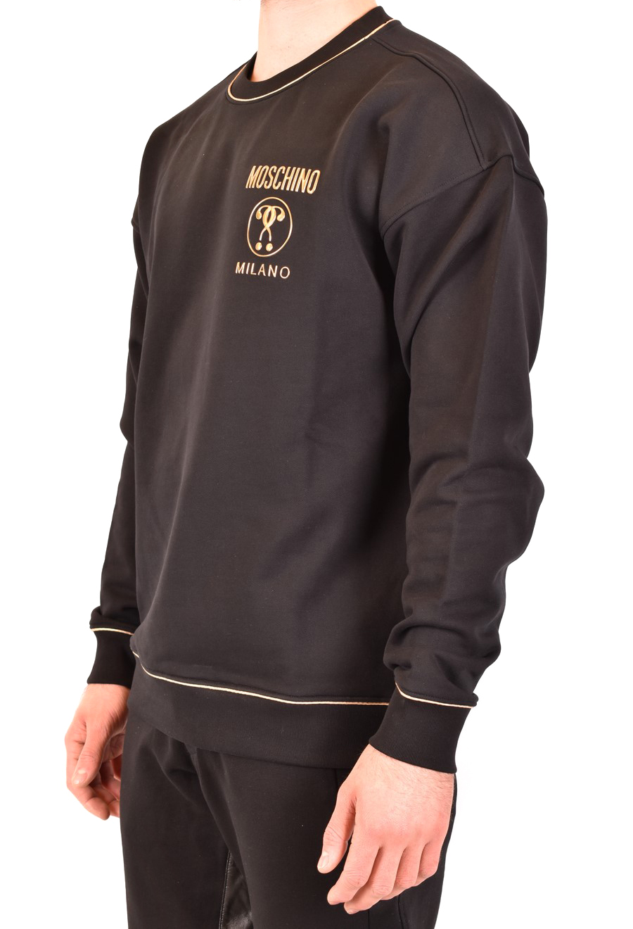 black cotton sweatshirt from Moschino featuring round neck, long sleeves, drop shoulder, gold tone logo lettering at the chest, gold tone strips detail, ribbed edges