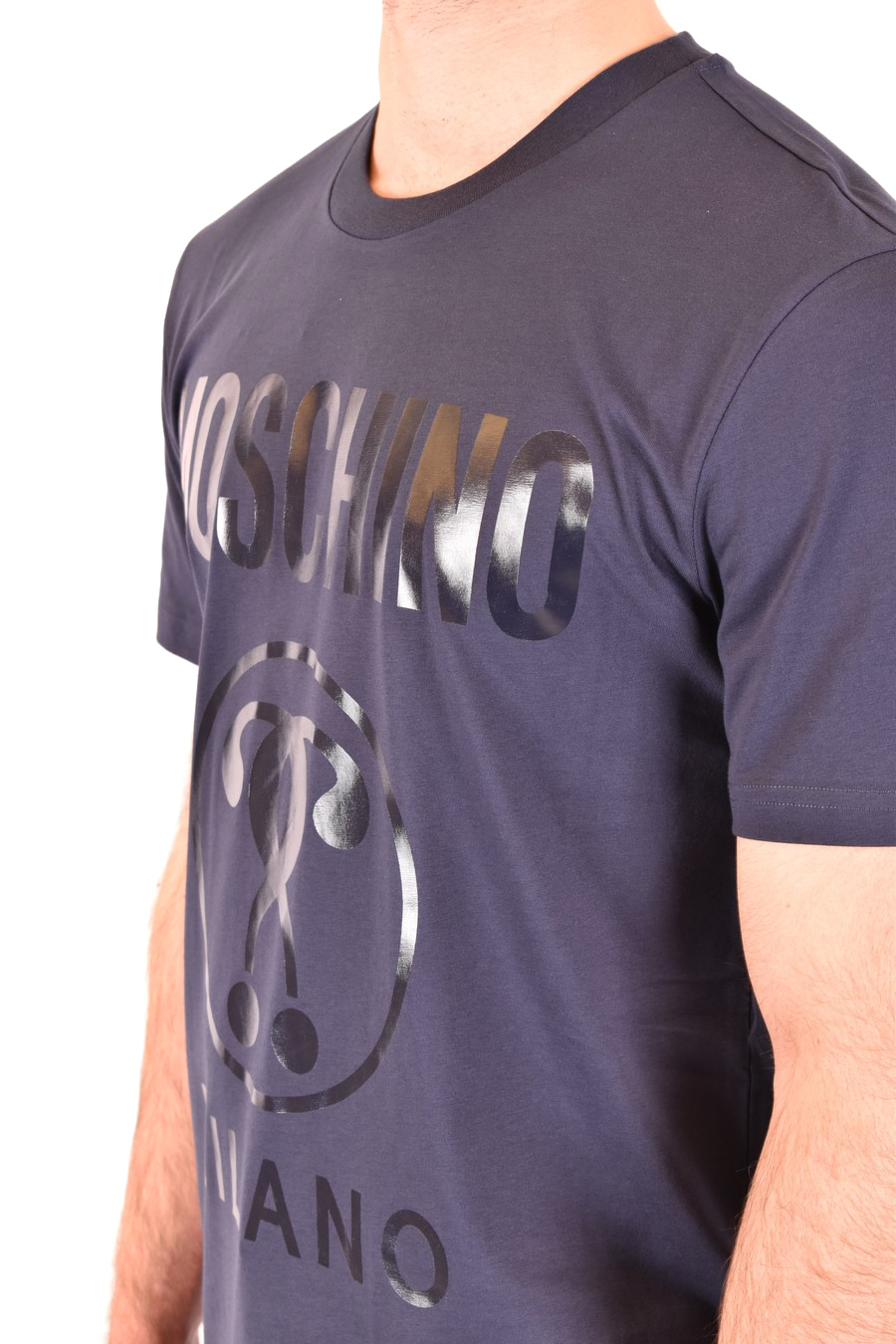 navy cotton t-shirt from Moschino featuring round neck, short sleeves, double question mark shine print to the chest, straight hem