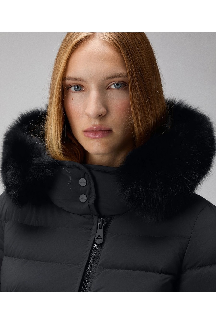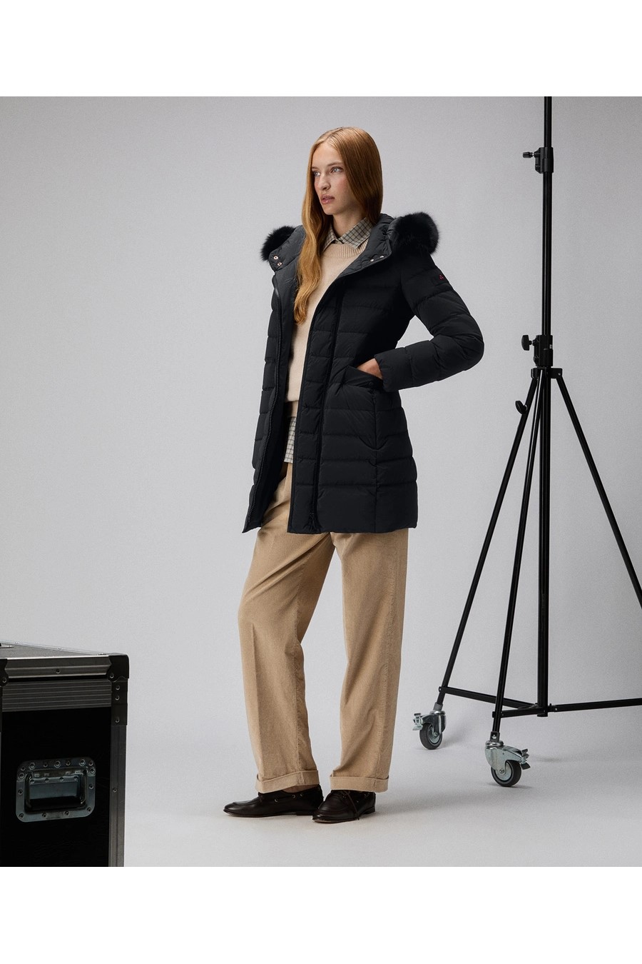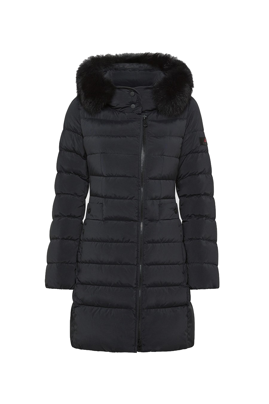 Peuterey long quilted down jacket in lightweight nylon poplin and polyester microfibre, natural down padding, with a central double-slider zip, wraparound collar with tone-on-tone press studs and hood with fox fur trim, removable, side pockets with press studs.