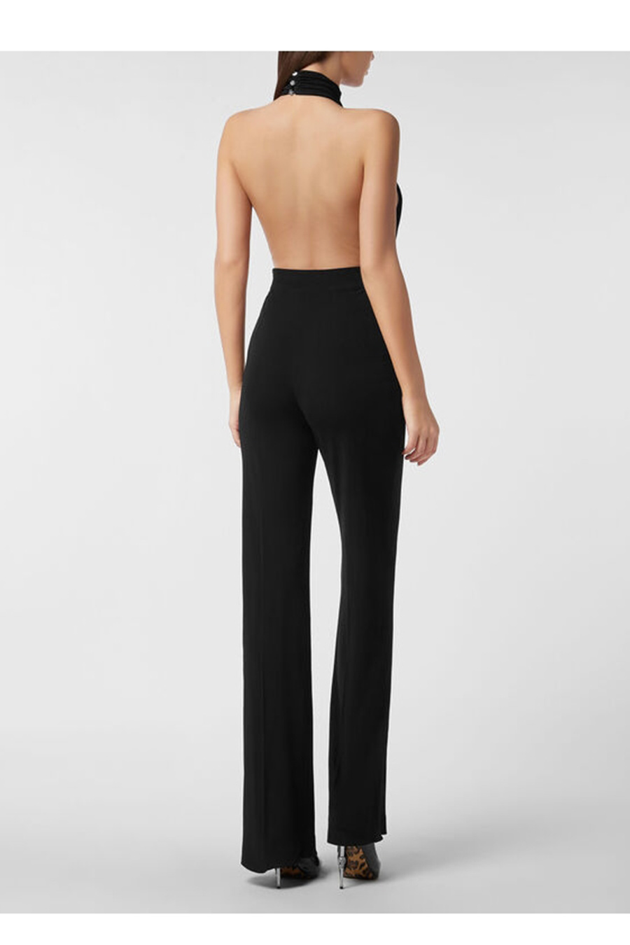 Philipp Plein Halter Neck Backless Jumpsuit in stretch viscose jersey fabric, closed collar with buttons, two deep openings along the neckline and back, neckline with jewelled detail, invisible zip sewn into the side.