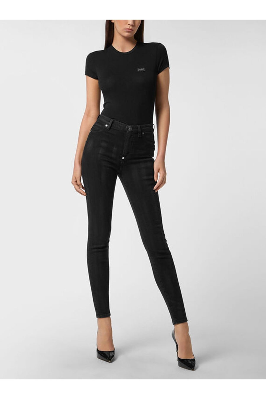 High Waist Jeggings Philipp Plein five-pocket denim featuring a basic fit and shiny details. ? Stretch denim fabric, leather label sewn on the back, adjustable waistband with metal button.