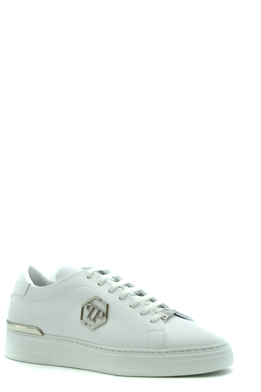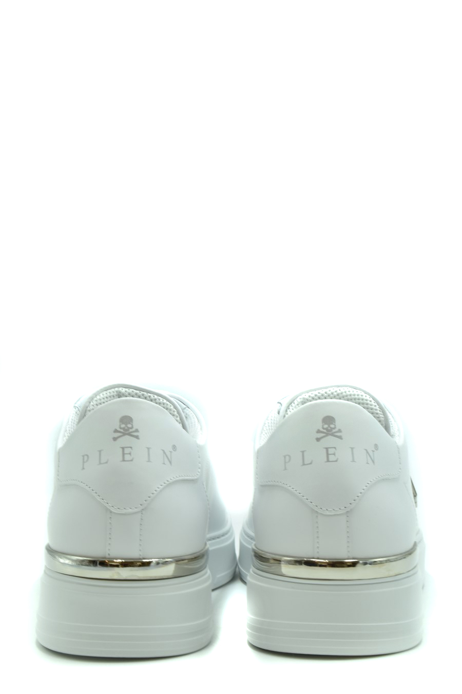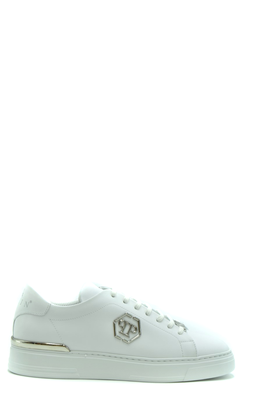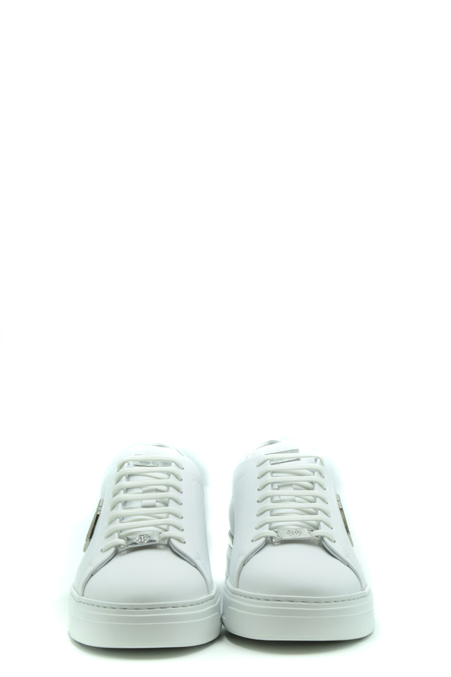 white low sneakers from Philipp PLein featuring lace-up fastening, round toe, logo patch to the tongue, rubber sole, silver tone logo to the side