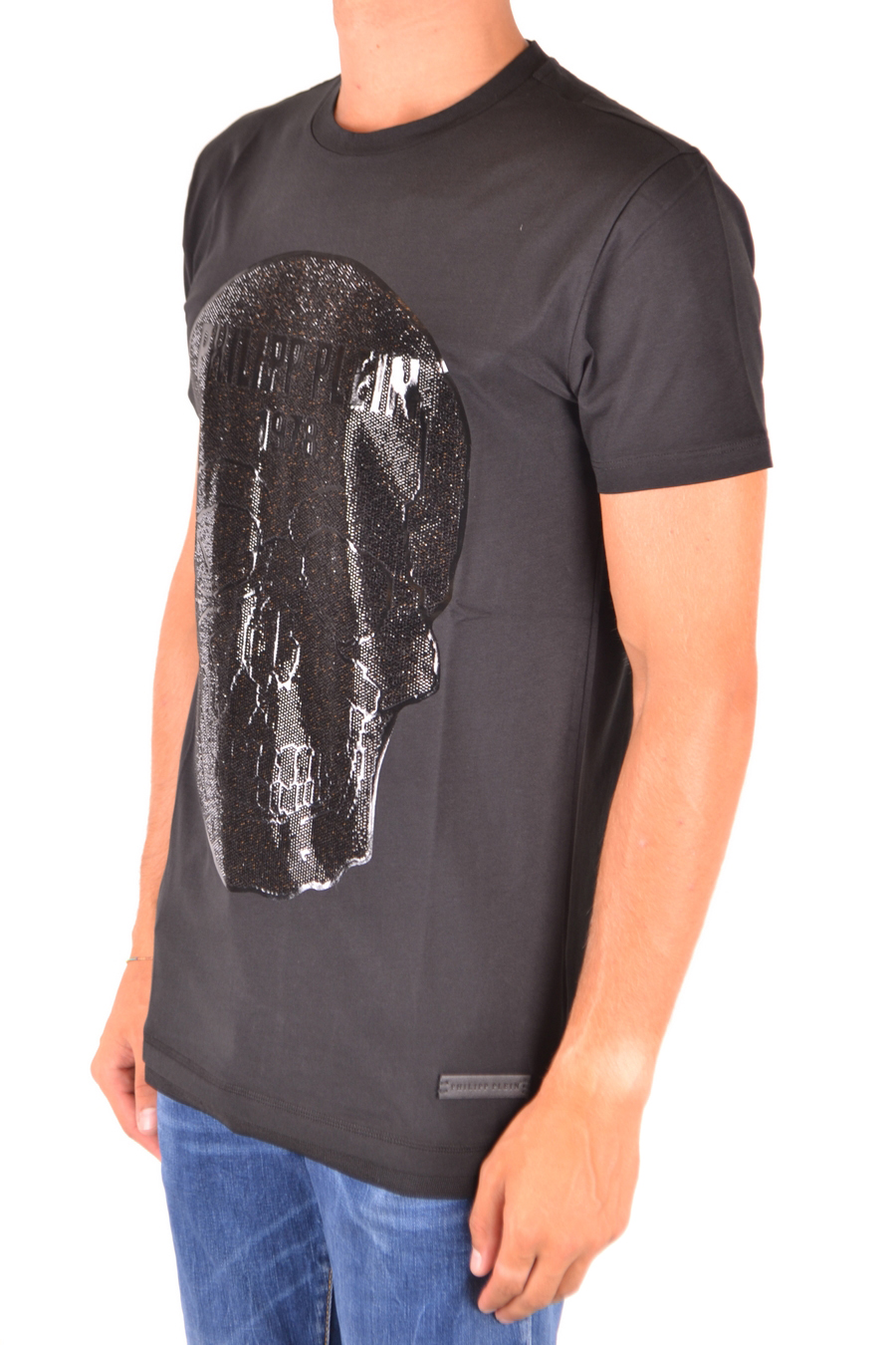 black cotton t-shirt from philipp plein featuring round neck, short sleeves, rhinstones skull decoration in front, stright hem slim fit