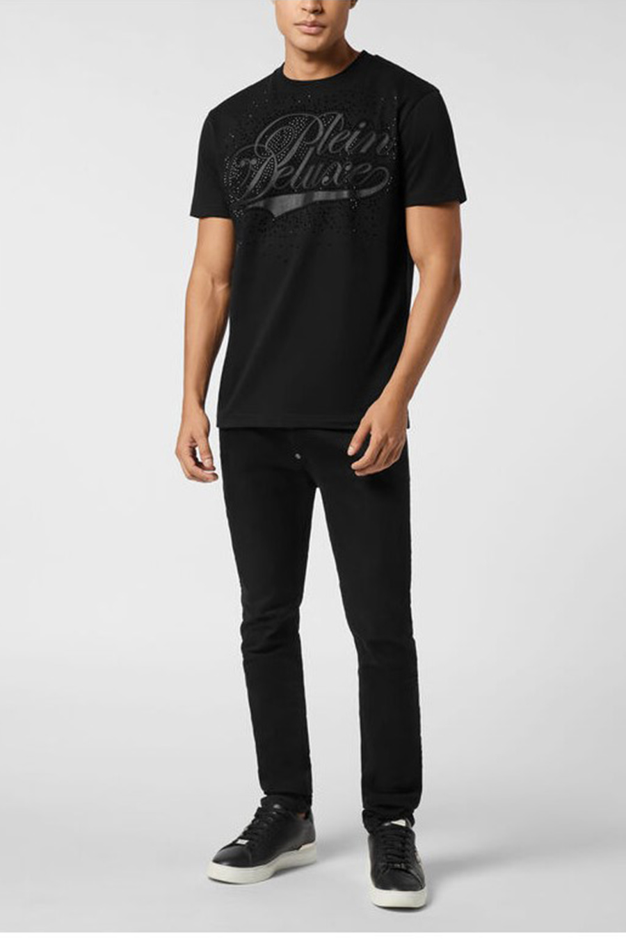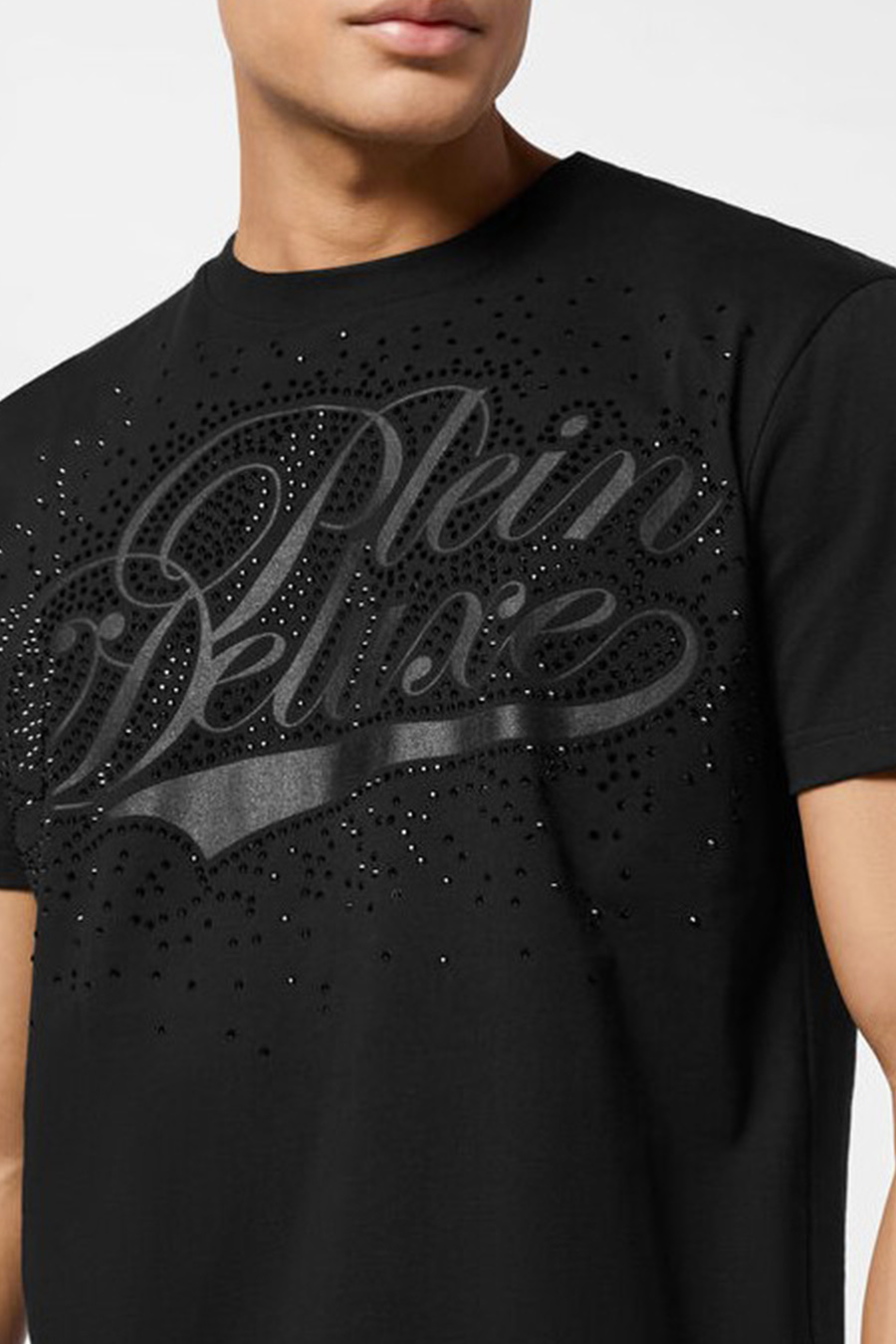 Philipp Plein Deluxe Stones crew neck T-shirt in cotton jersey fabric with crystals printed on the front, logo patch sewn on the yoke, ribbed crew neck, the edges are finished with two needles.