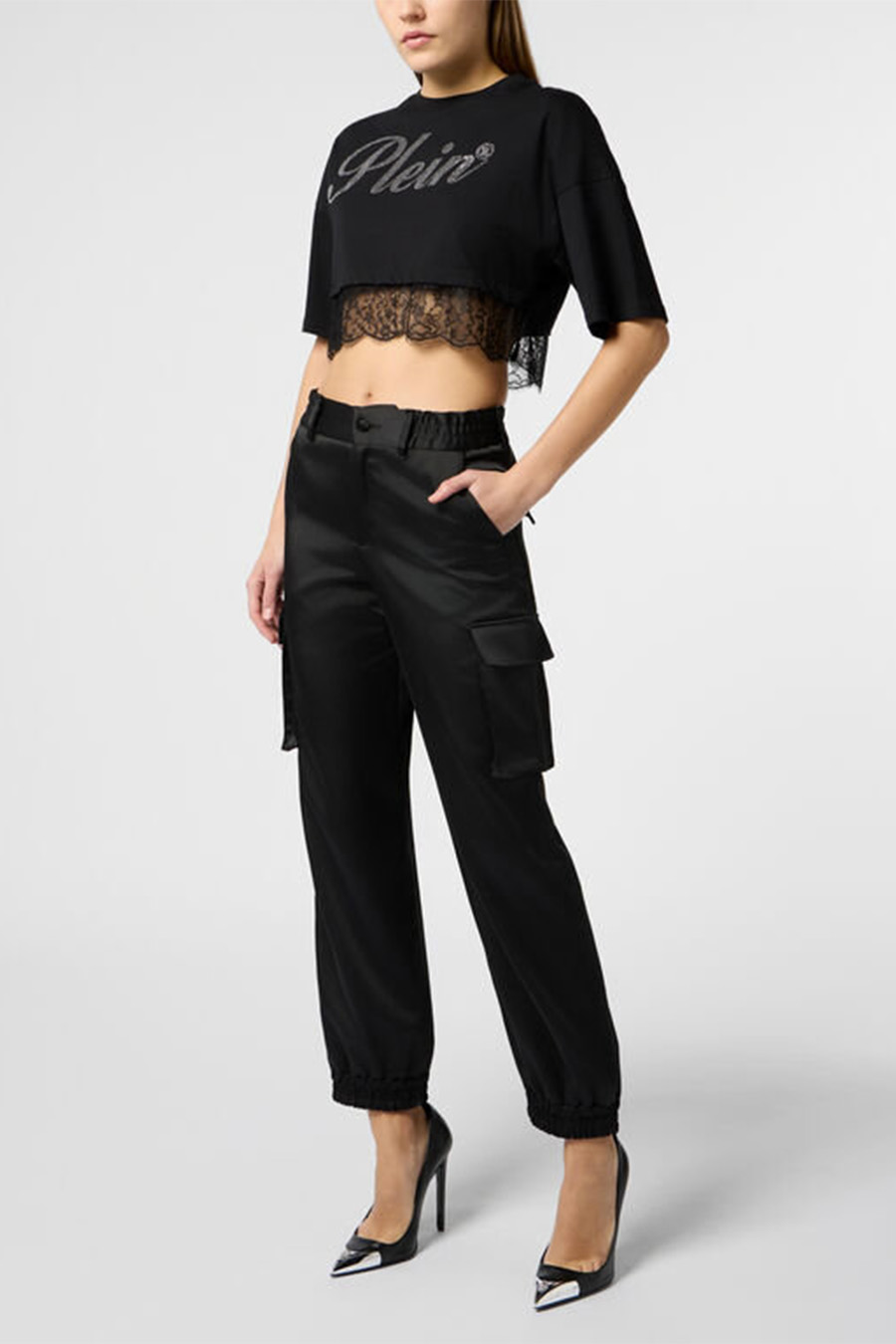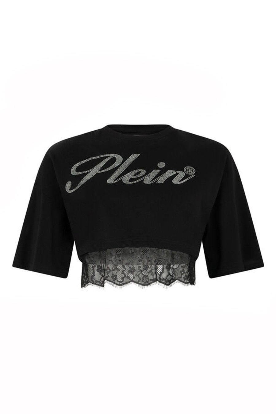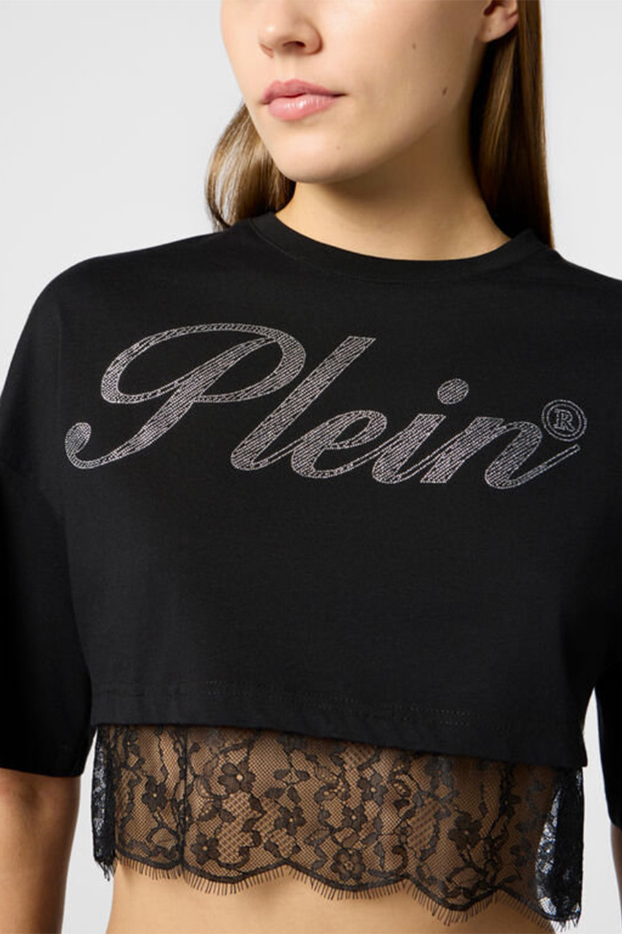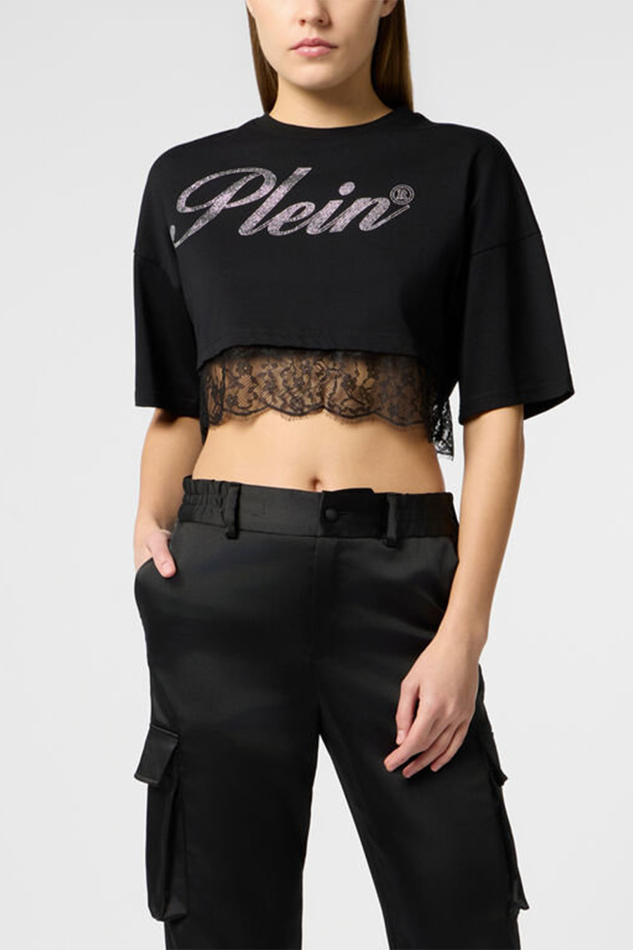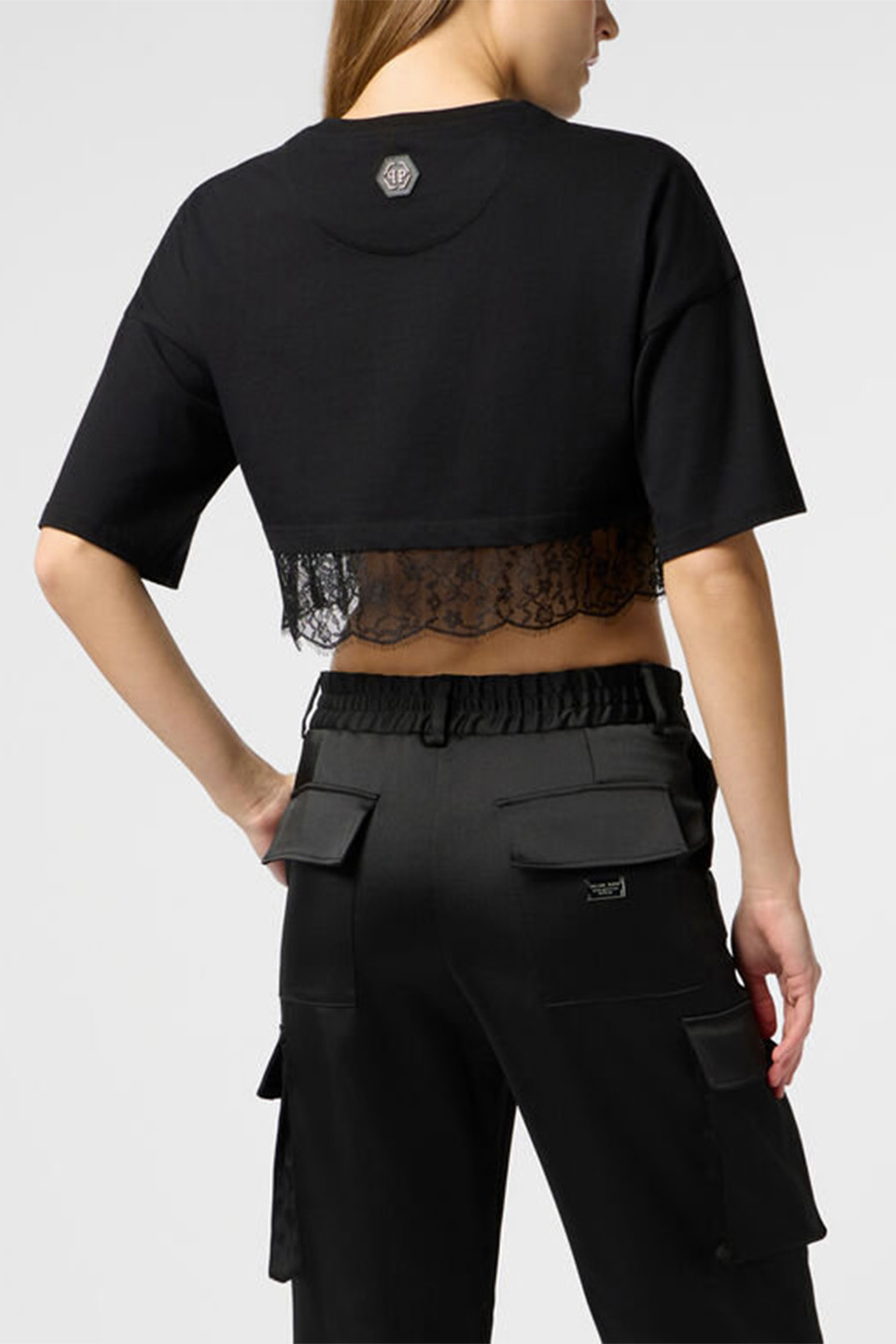 Philipp Plein cropped lace T-shirt with lace trim, crystals printed on the front, logo patch sewn onto the yoke, ribbed crew neck, double-needle stitching on the edges.