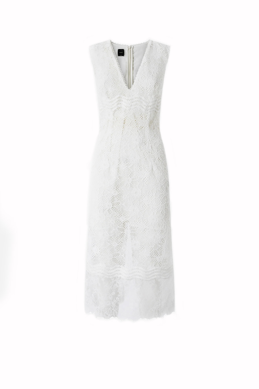 Pinko sleeveless midi dress in lace with a V-neckline, slightly fitted silhouette with a slight flare at the bottom and a central slit at the back, featuring an invisible zip fastening at the back. The design is entirely decorated with an elaborate mix of different types of lace.