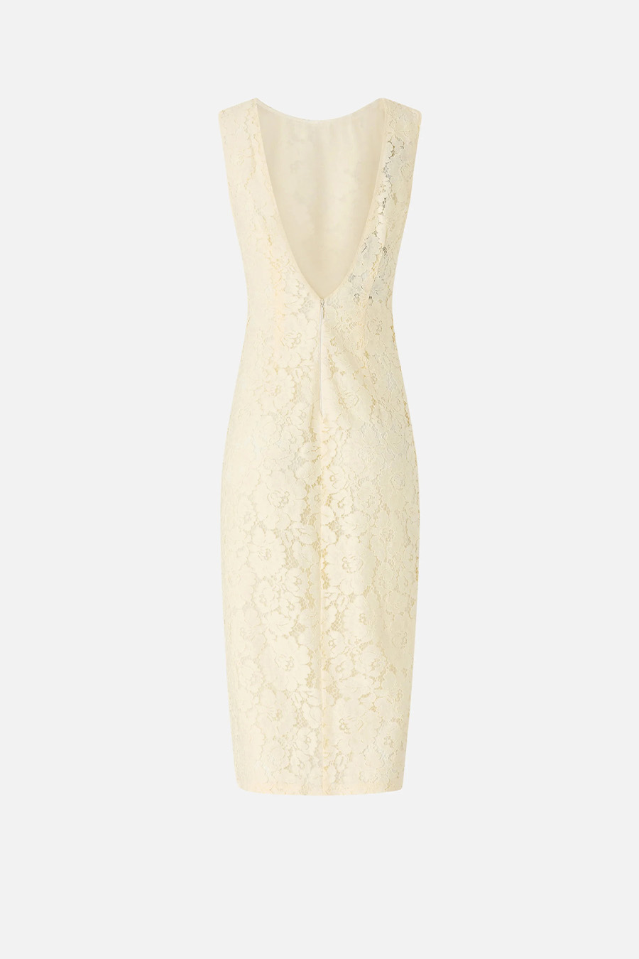 Floral lace dress with back neckline PINKO from the fitted line, sleeveless with a boat neckline at the front that opens into a deep V-neckline, the fabric is a sophisticated rebrodé lace with rich floral motifs embroidered to create a three-dimensional effect, featuring a convenient zipper at the back and an inner lining, finished with a pleated panel at the back that adds depth and a side slit at the front.