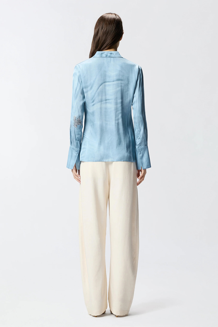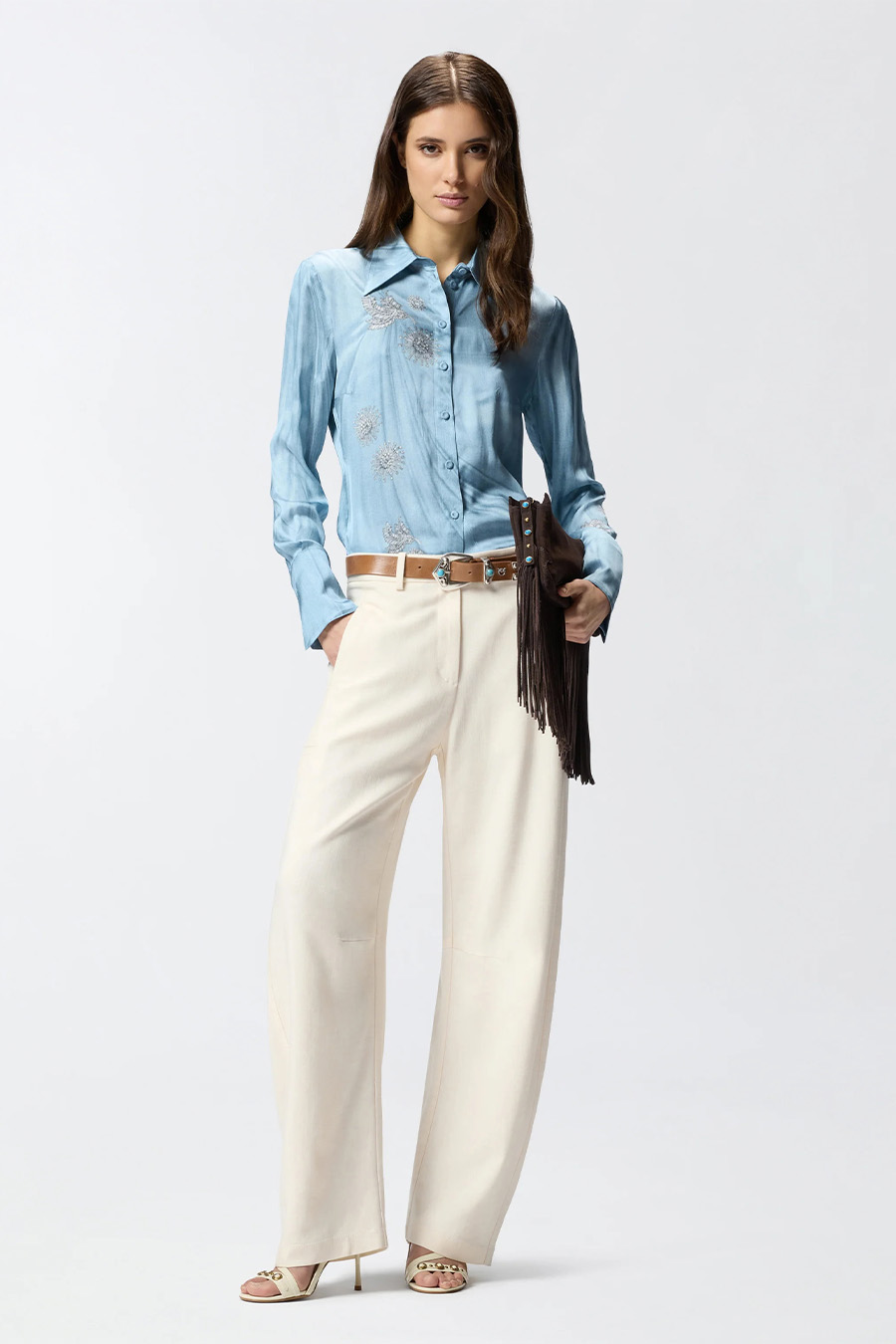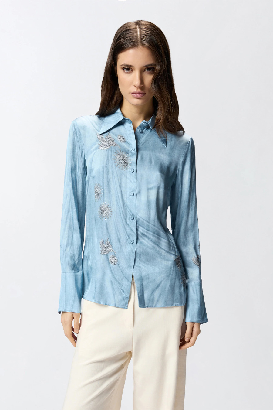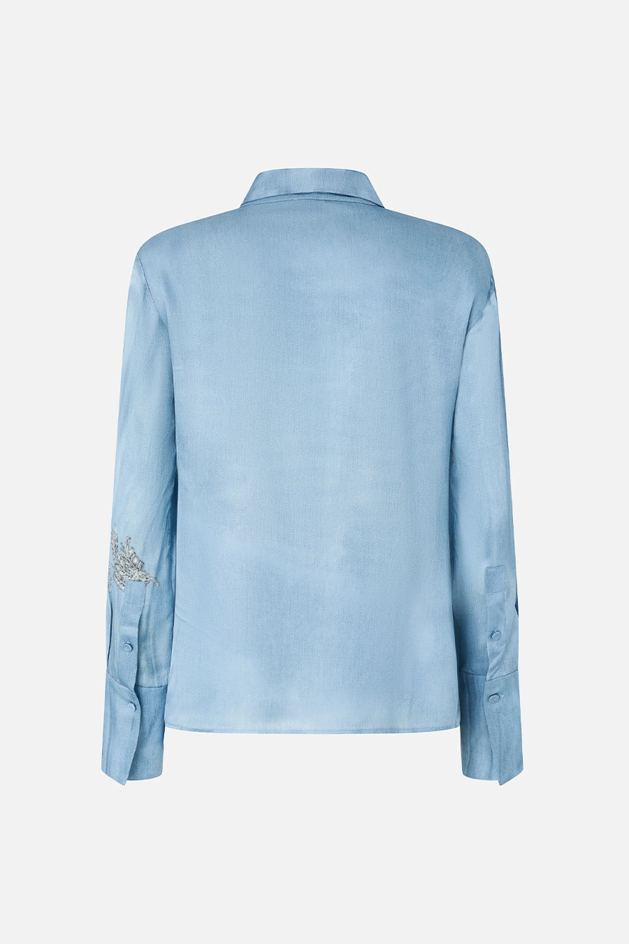 PINKO shirt with a relaxed fit, classic collar, long sleeves with high cuffs finished with buttons, and front closure with fabric-covered buttons. Made from fluid viscose satin with a trompe-l'œil print in a faded, draped denim effect, embellished with a jeweled brooch design.