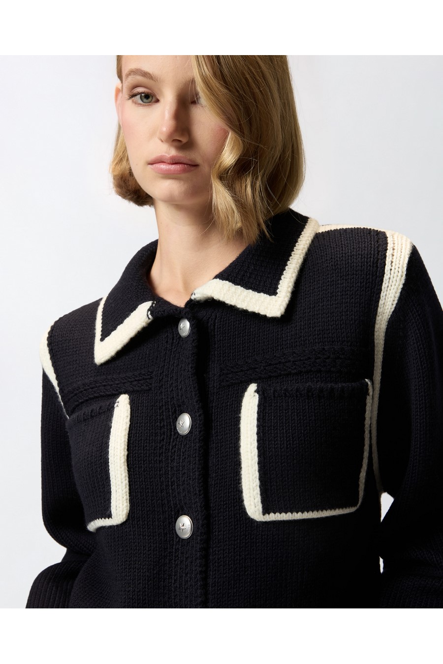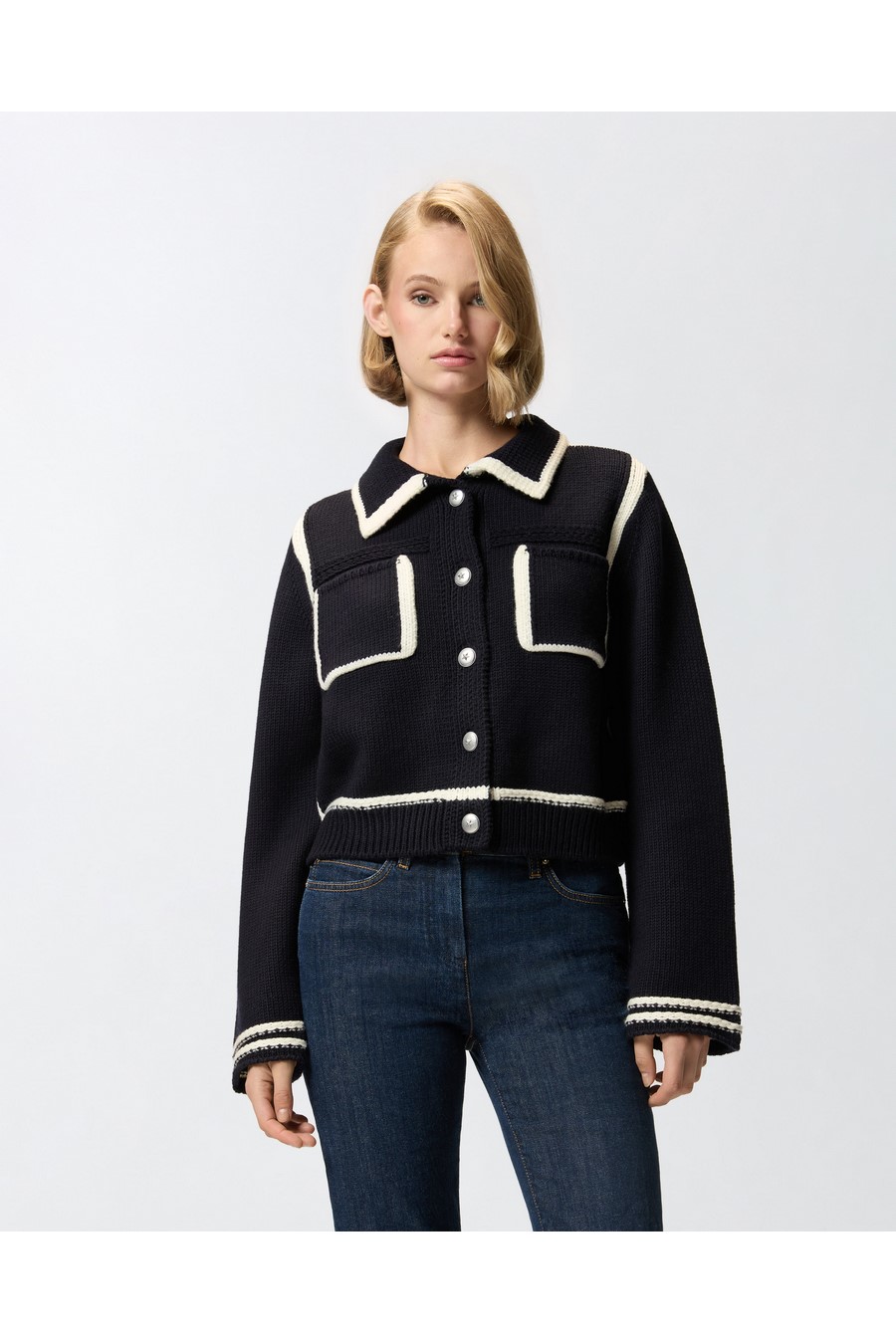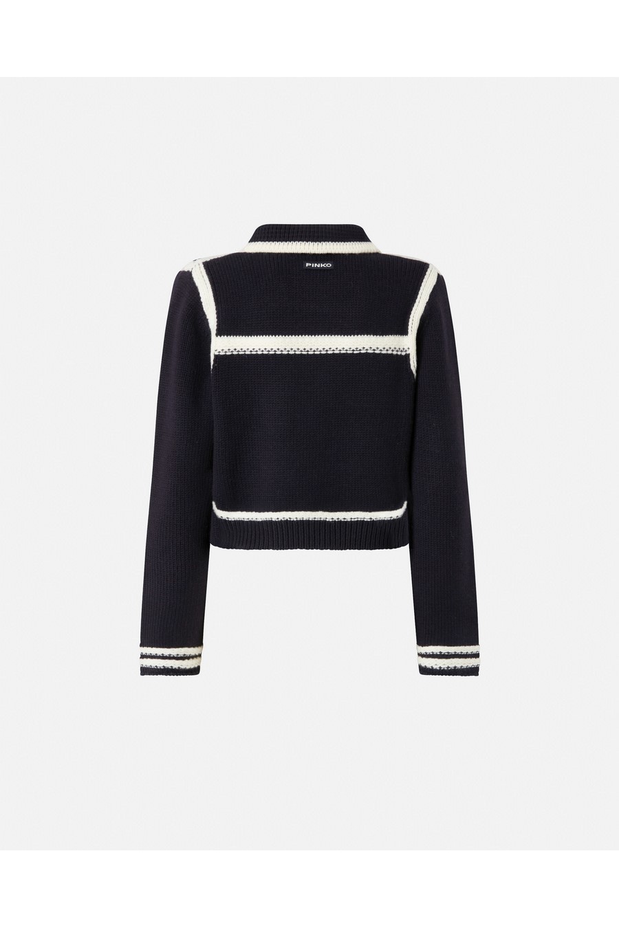 Pinko preppy-style cardigan in fine, soft merino wool, with contrasting yarn highlighting the cuffs, yoke, hem, collar and front pockets.