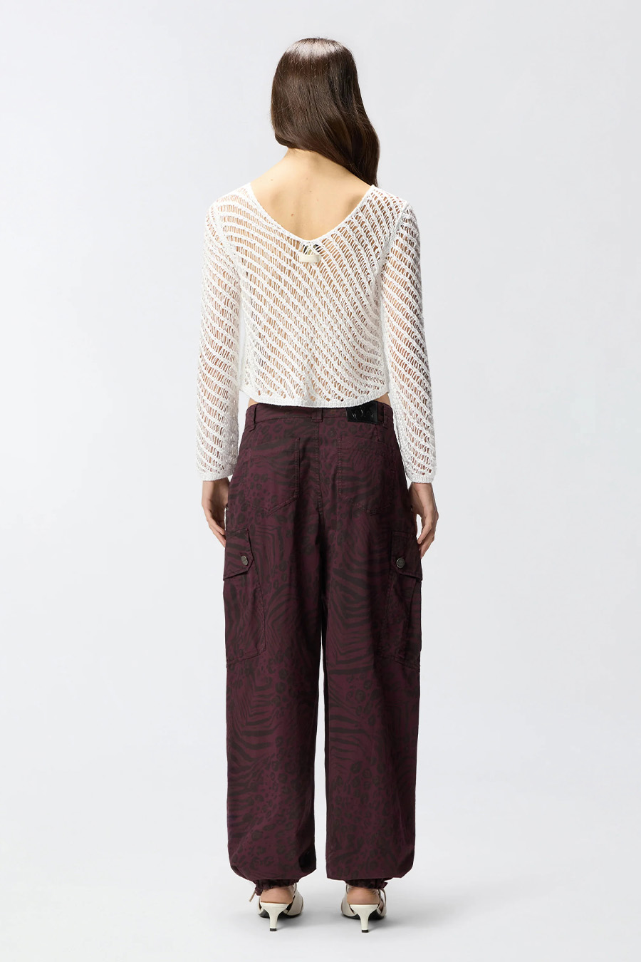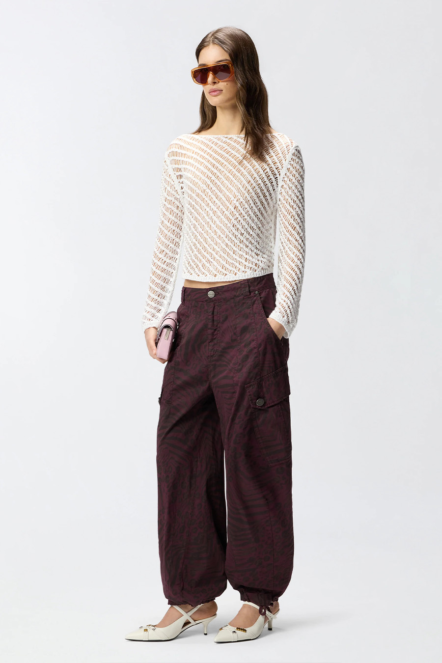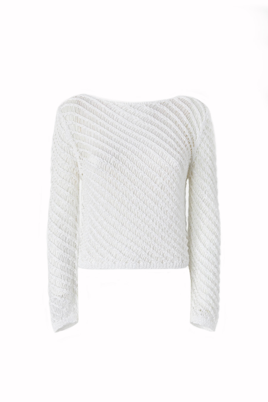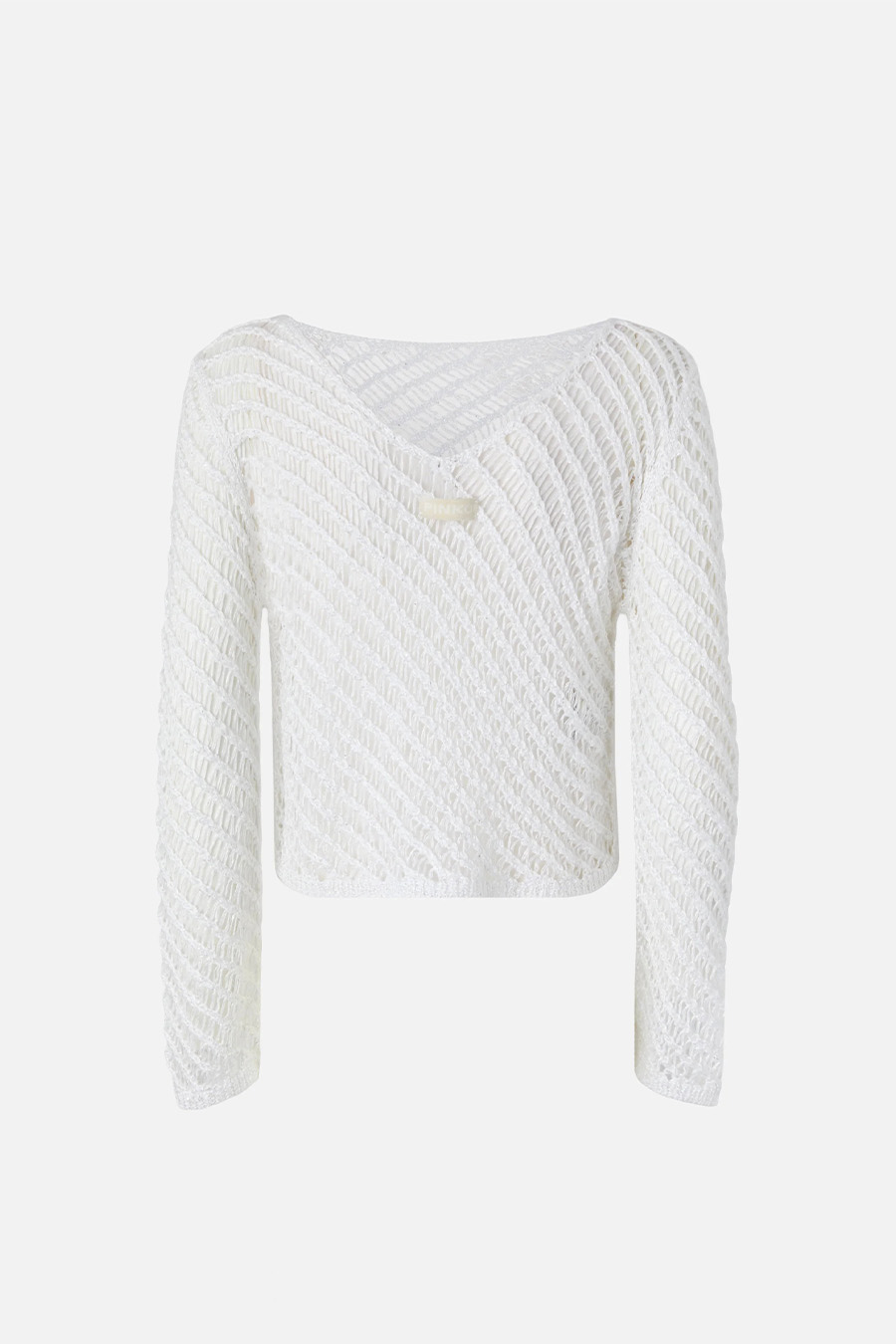 Pinko long-sleeved mesh top in crochet style with interwoven texture for a handmade look, embellished with tiny sequins applied to the thread, label with PINKO lettering logo in jacquard applied under the boat neckline at the back.