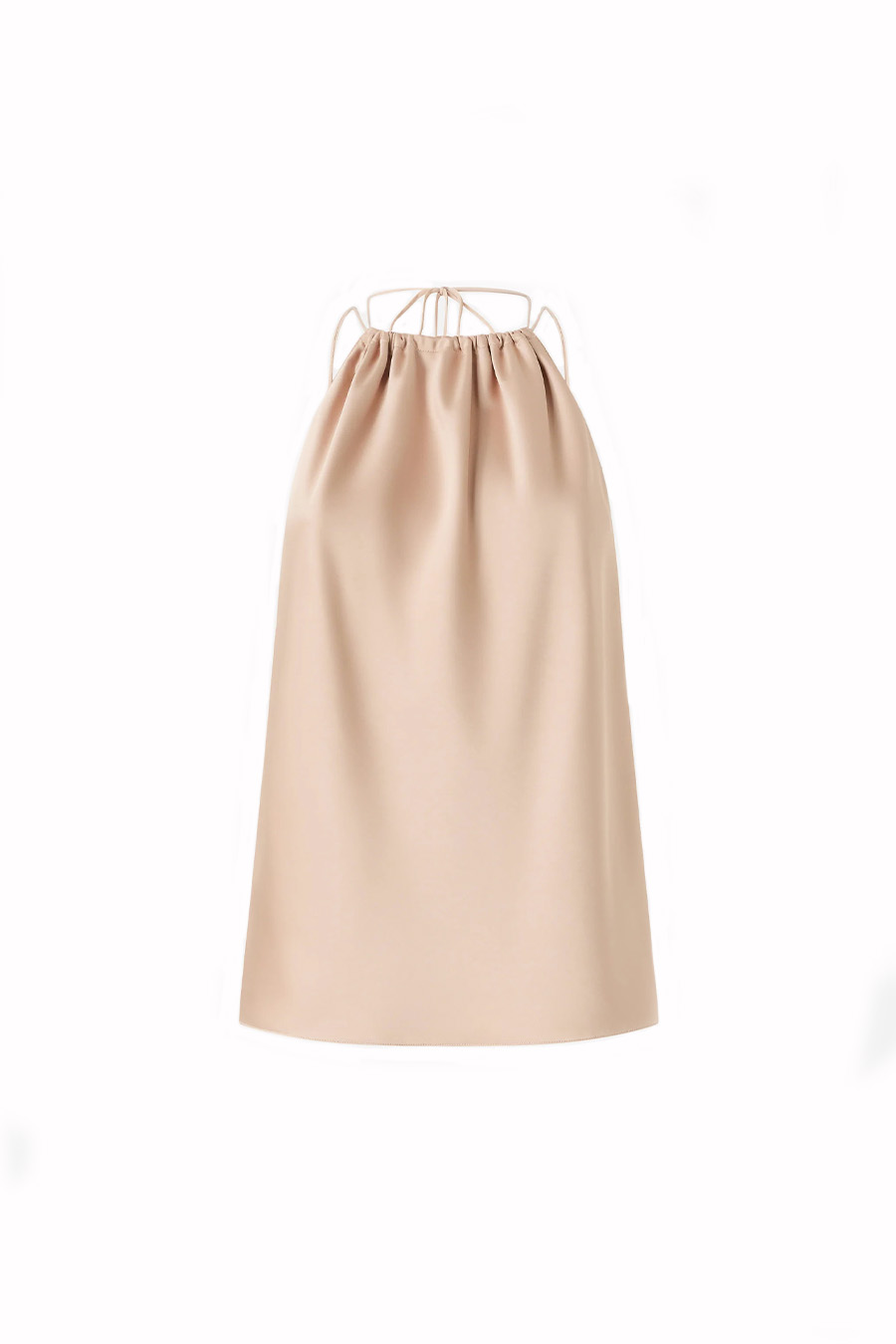 PINKO top from the soft line, featuring a halter neckline with adjustable drawstring finished with metal toggles that create refined gathers at the front and leave the upper back bare. It has thin straps that match the drawstring and can be worn either visible or hidden.