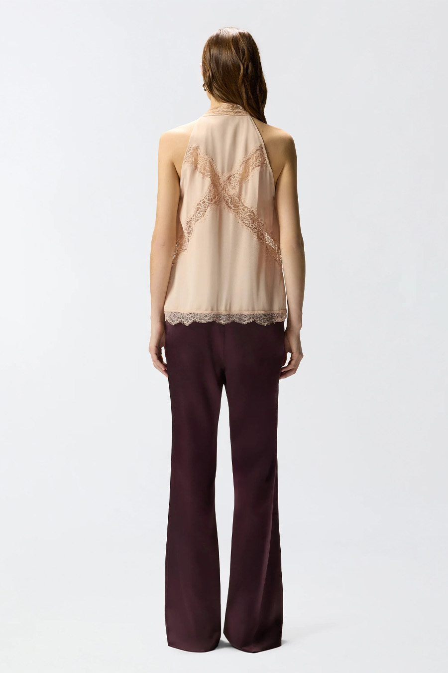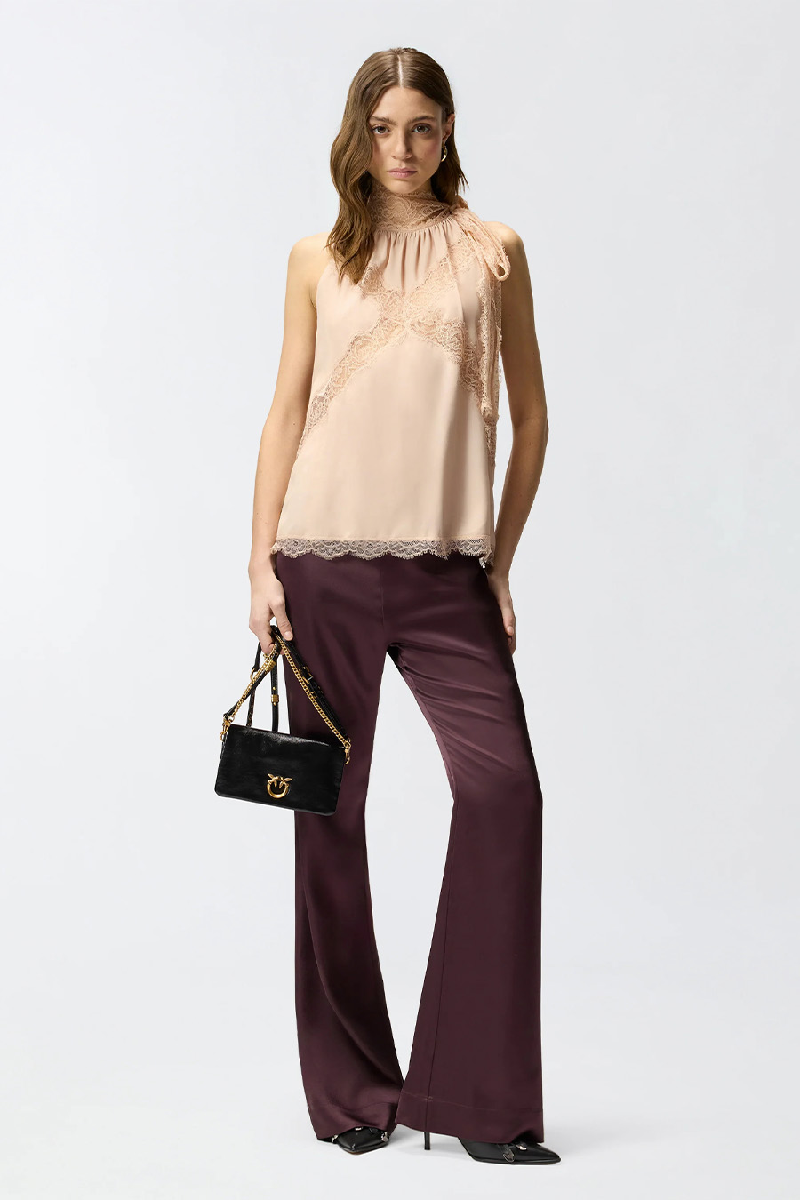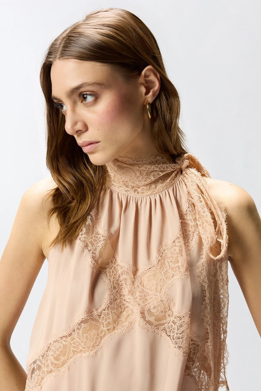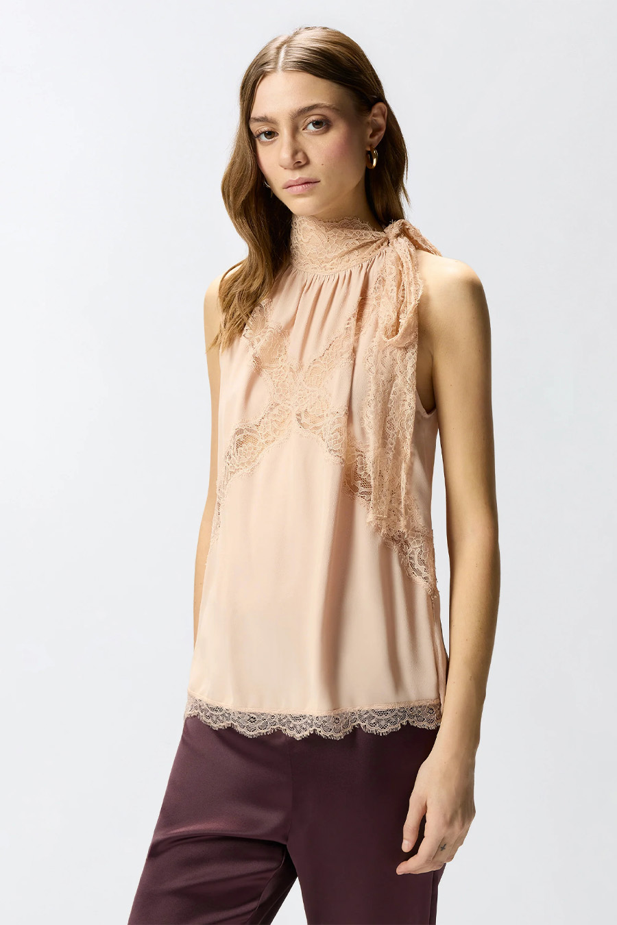 Sleeveless PINKO top with a flowing silhouette, crafted from soft silk blend crêpe de Chine, featuring a halter neckline and lace that wraps around the neck and falls into long tails to be tied, lace details.