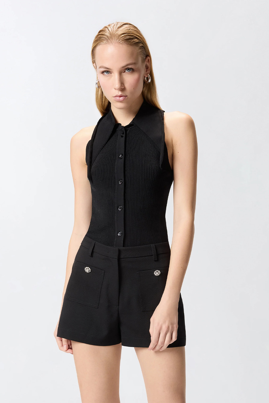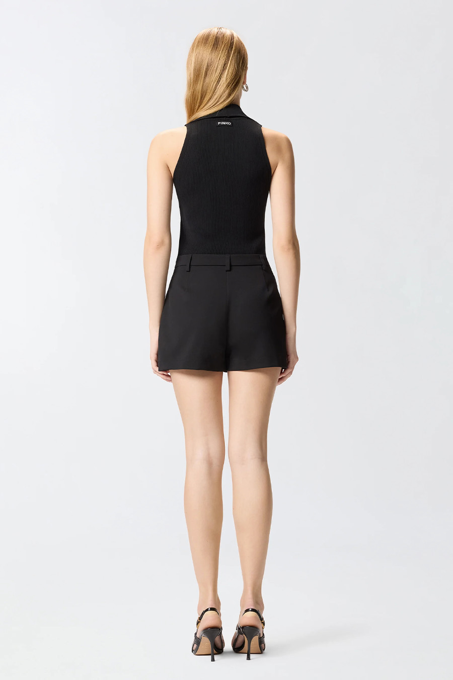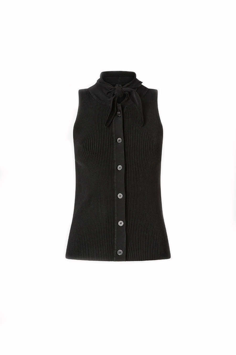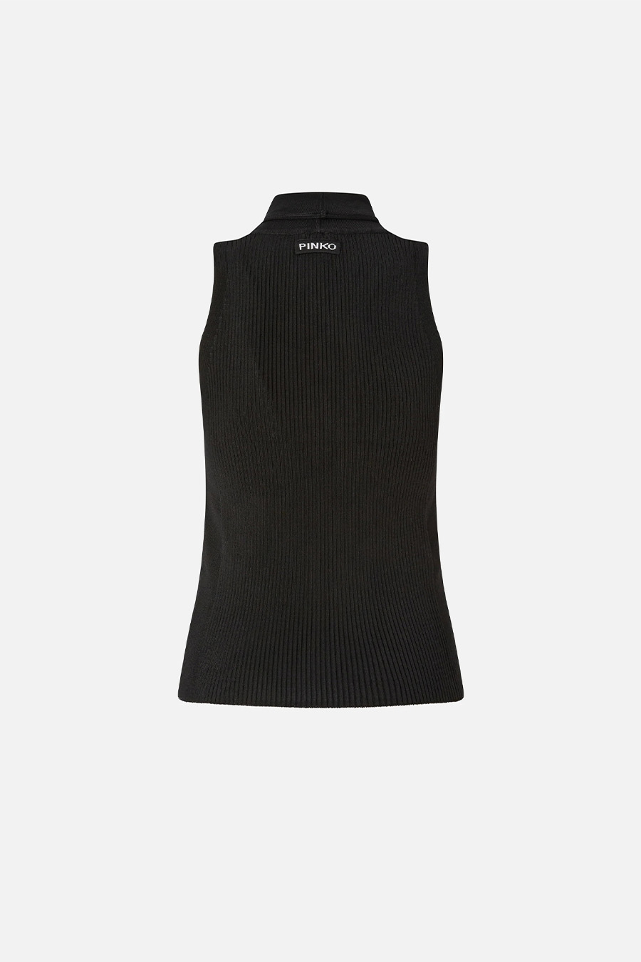 PINKO sleeveless top in lightweight ribbed stretch rayon, featuring a stand-up collar that ties at the front in a bandana style and a front button fastening, with a jacquard PINKO logo label on the back.