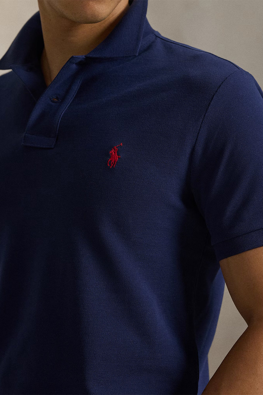 navy cotton polo from Polo Ralph Lauren featuring classic buttoned collar, short sleeves, straight hem, logo in red emboidered on the chest, straight hem
