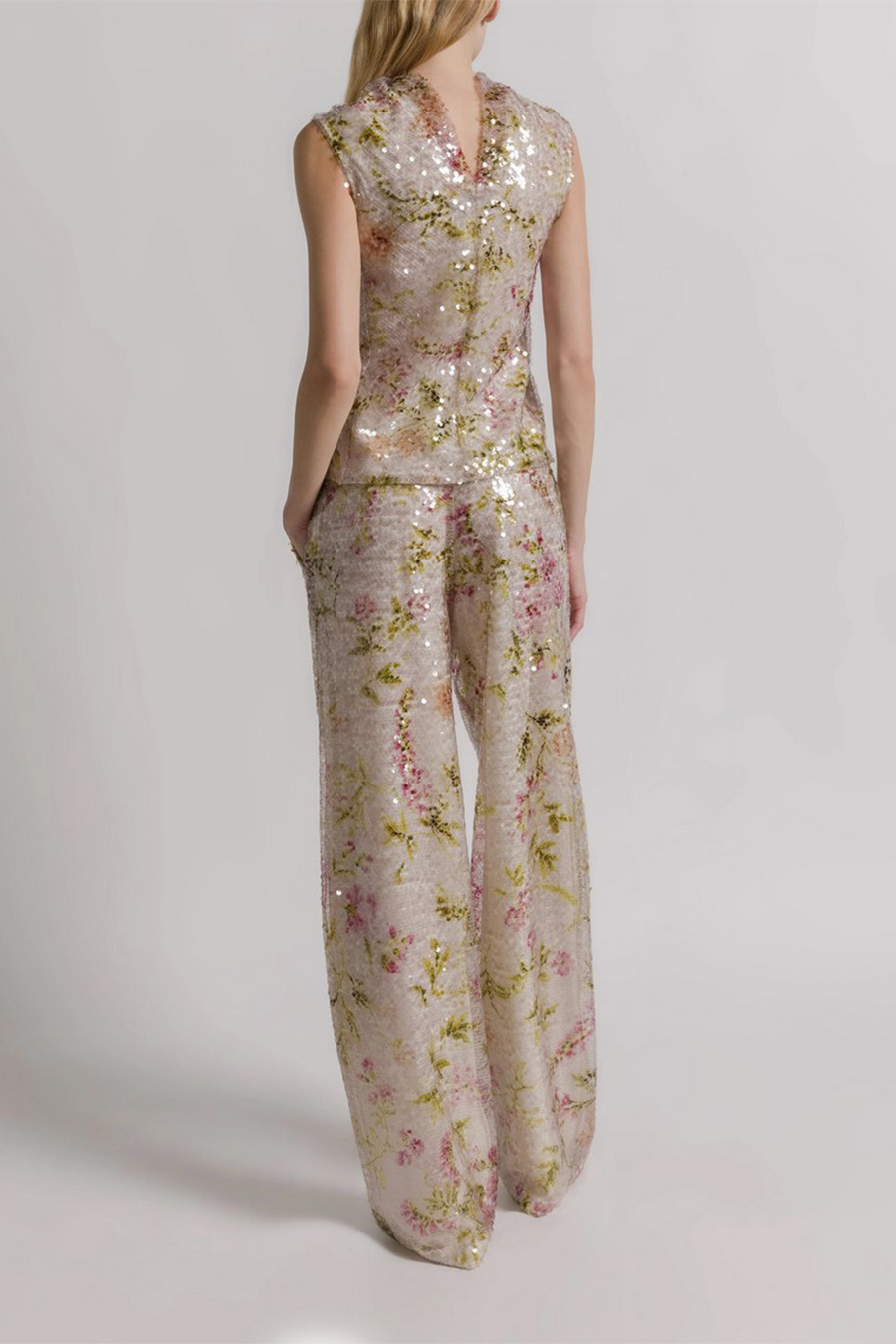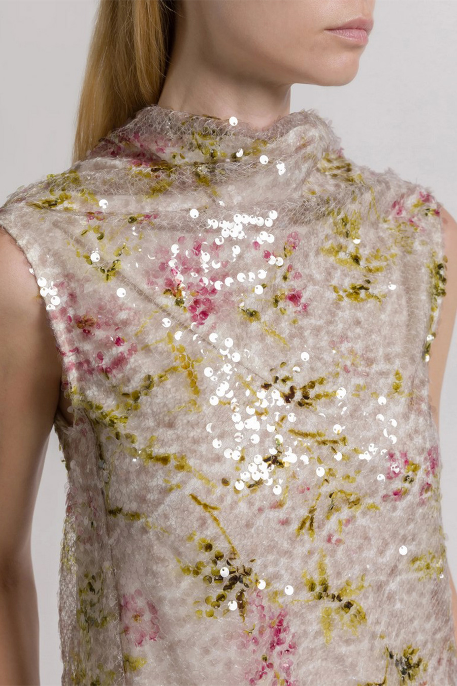 Alberta Ferretti top with floral sequin pattern and high neck.