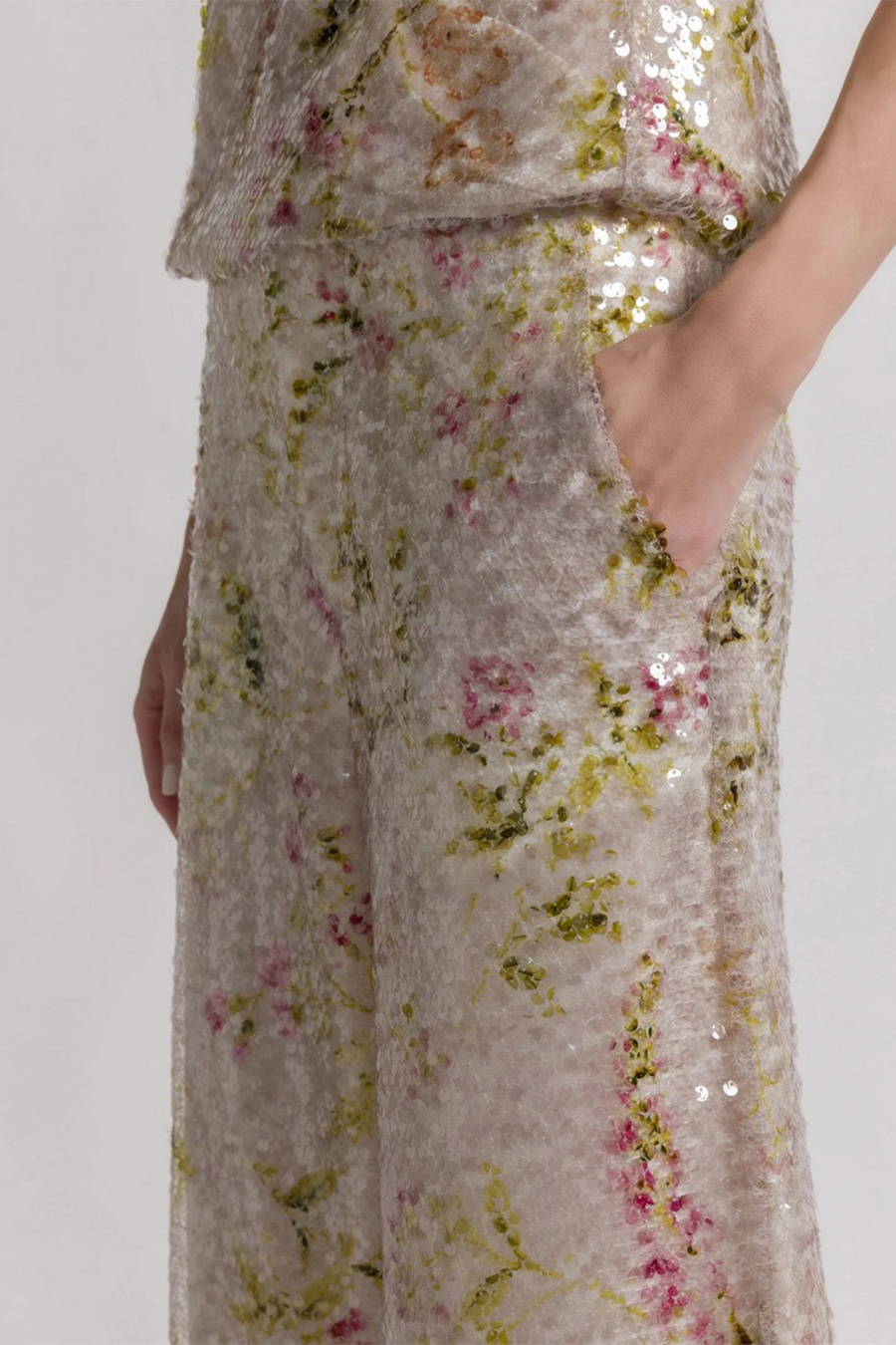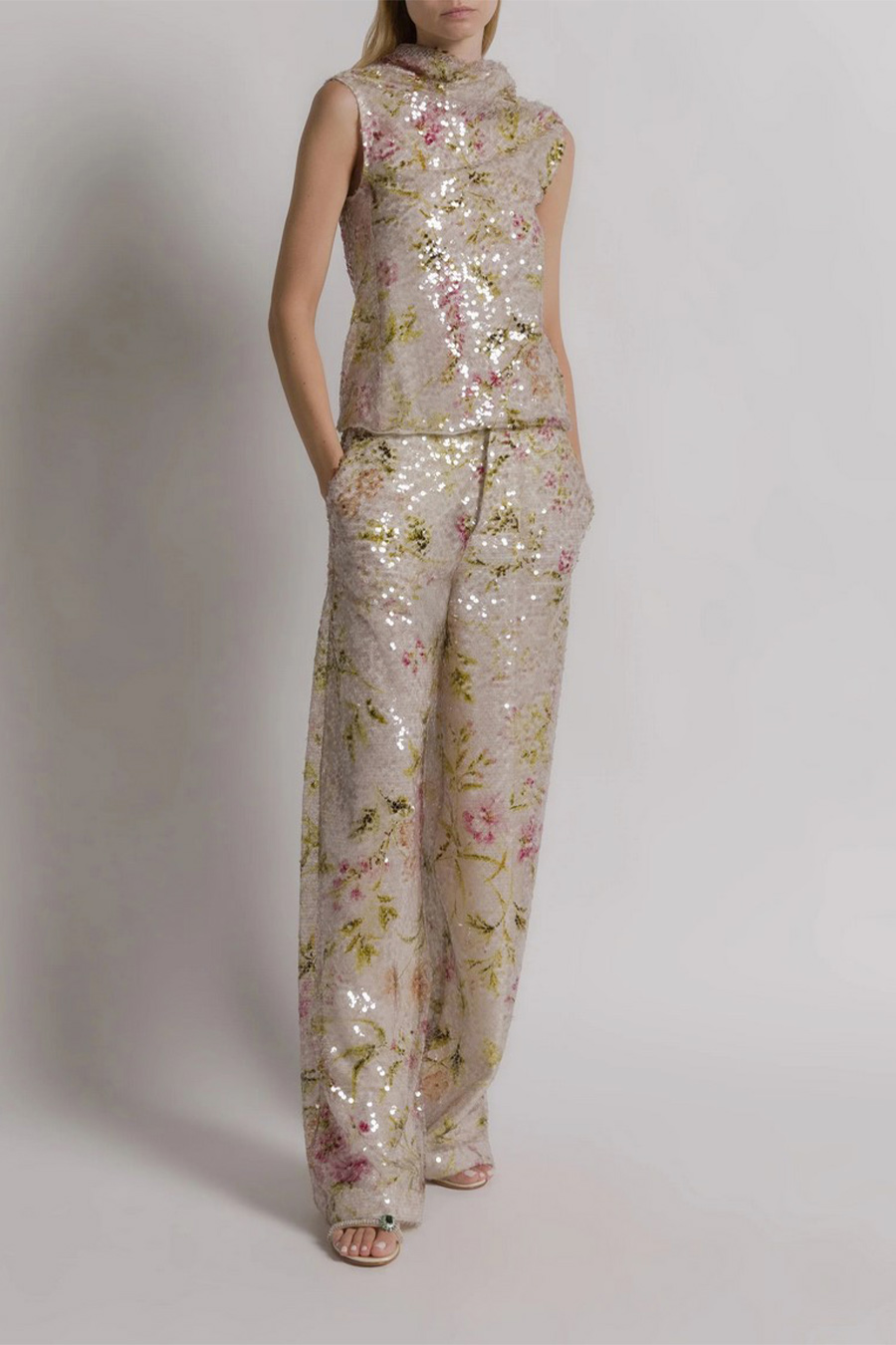 Alberta Ferretti trousers with floral print sequins, high waist, straight leg.