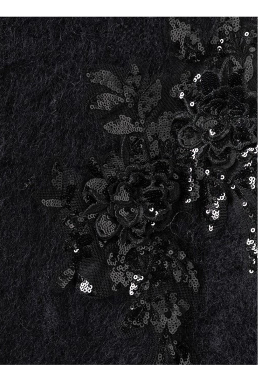 Blugirl dress in mohair blend with three-dimensional floral patch with thread embroidery and sequins, round neckline, V-neckline at the back, long sleeves, soft line, matching slip.