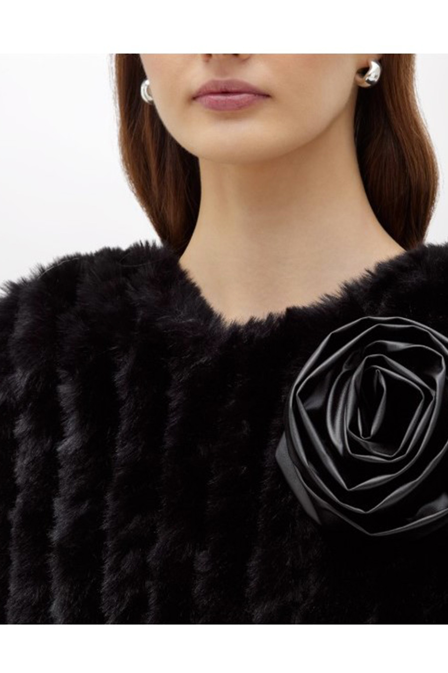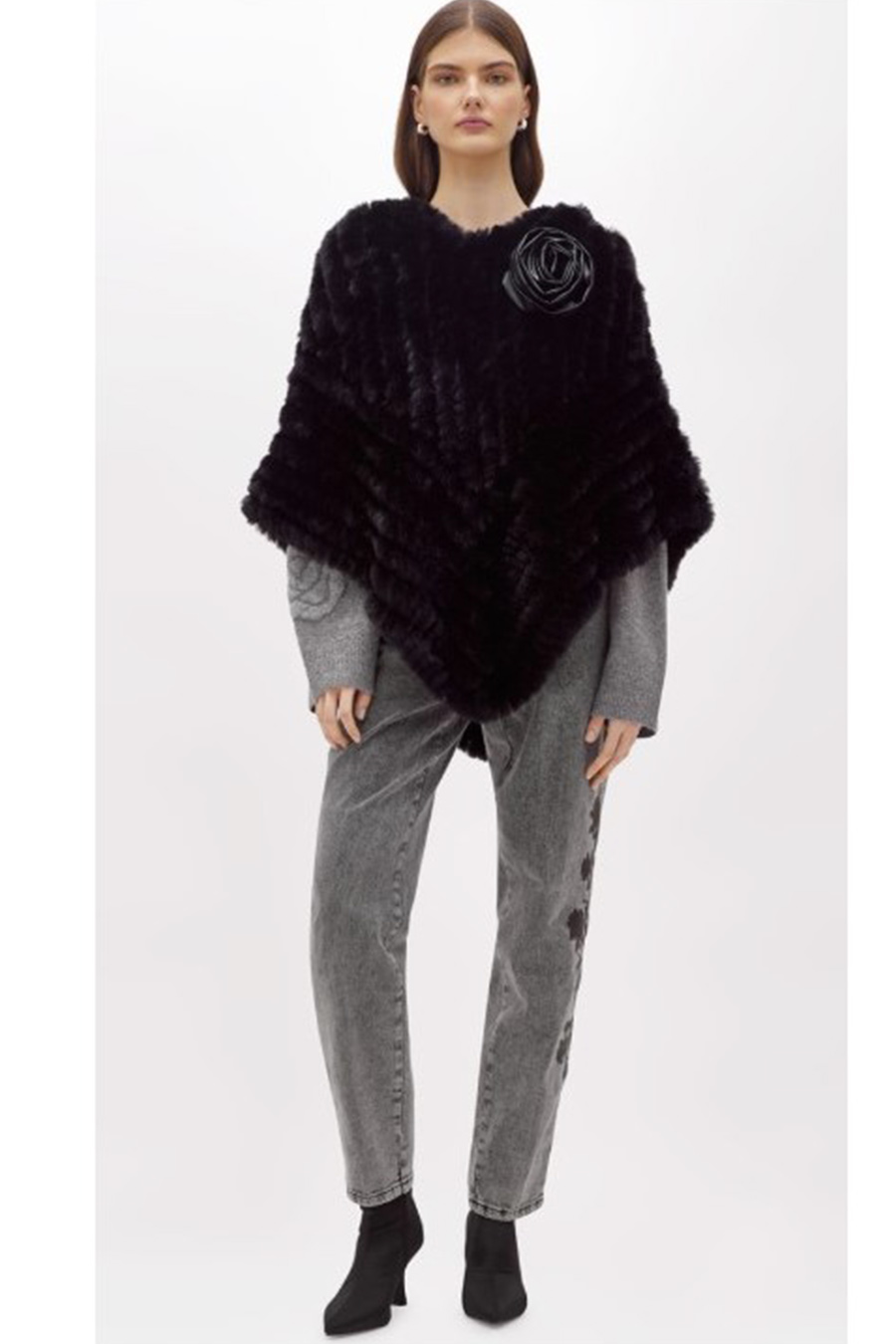 Faux fur poncho with round neckline and pointed hem.
