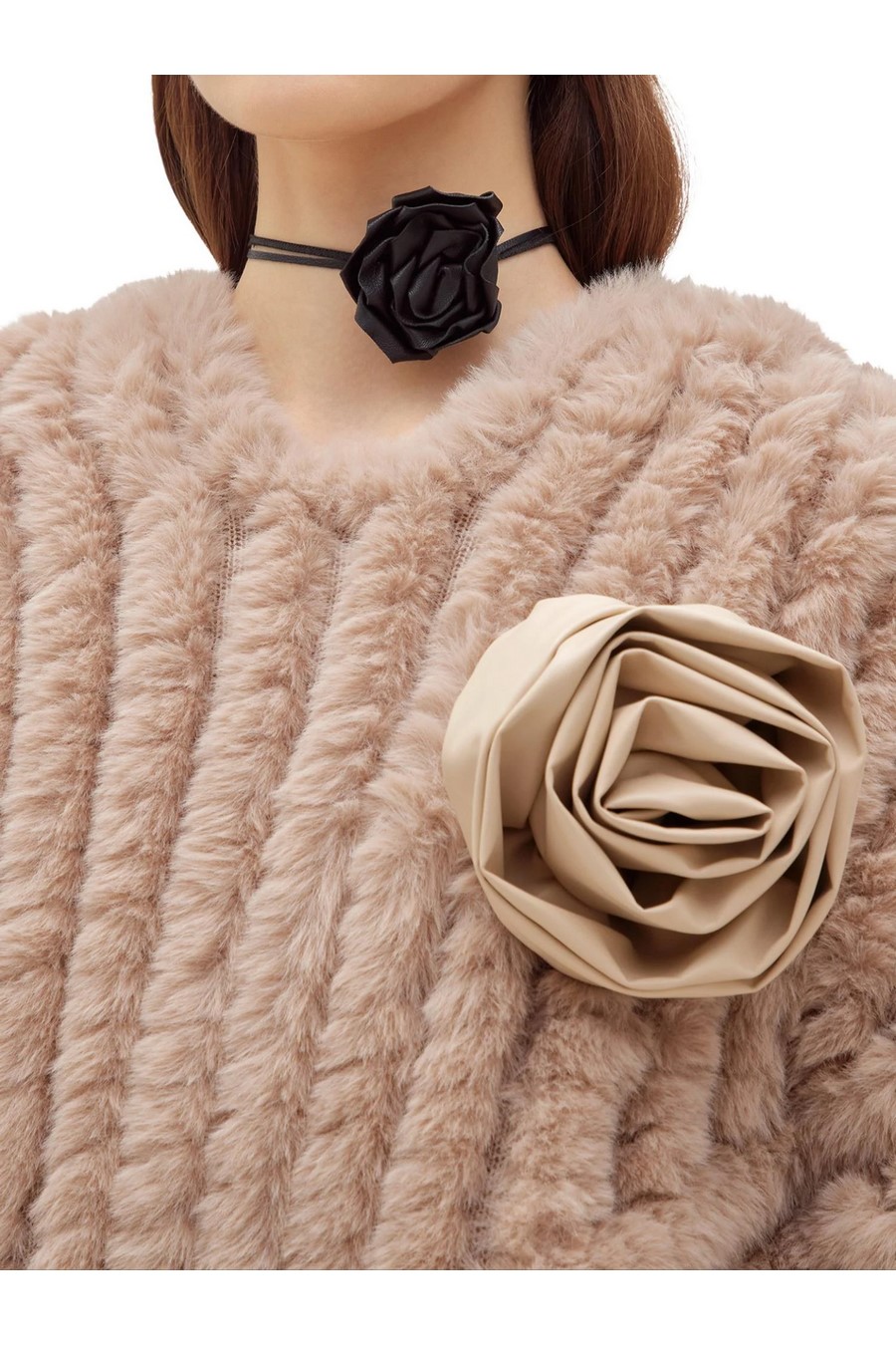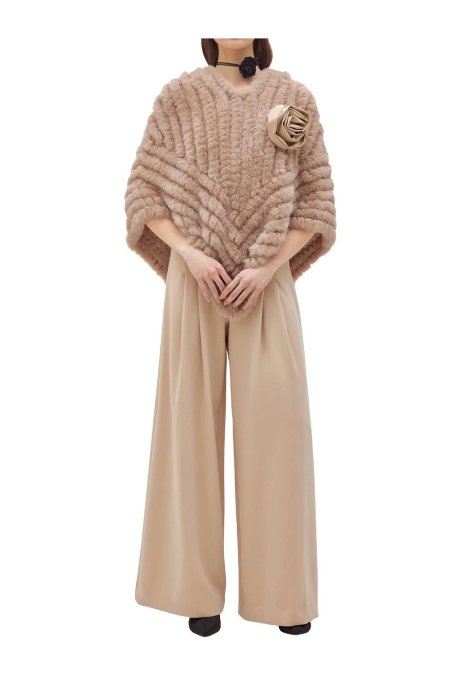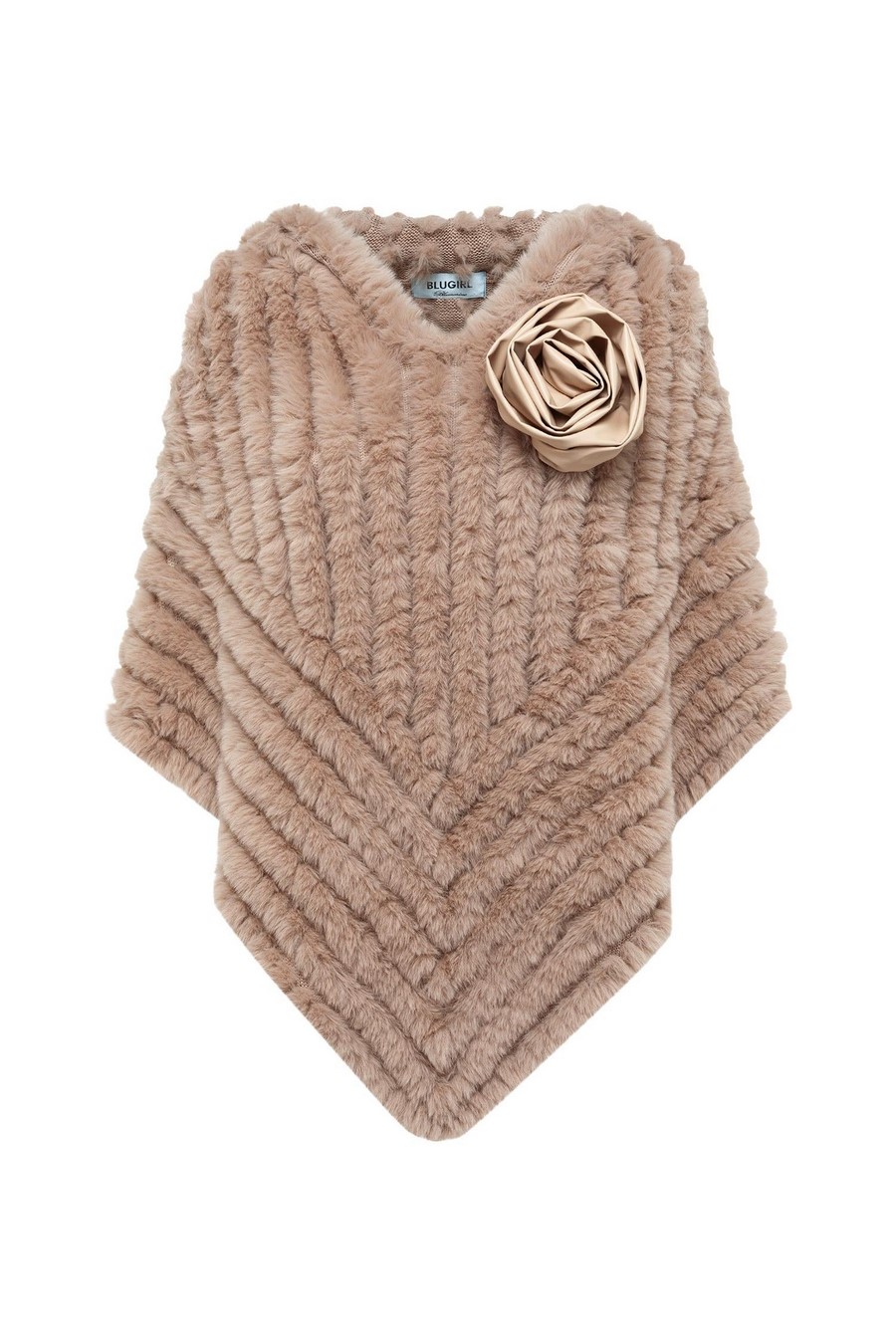 Faux fur poncho with round neckline and pointed hem.
