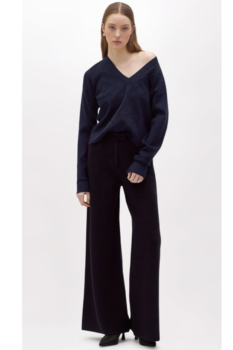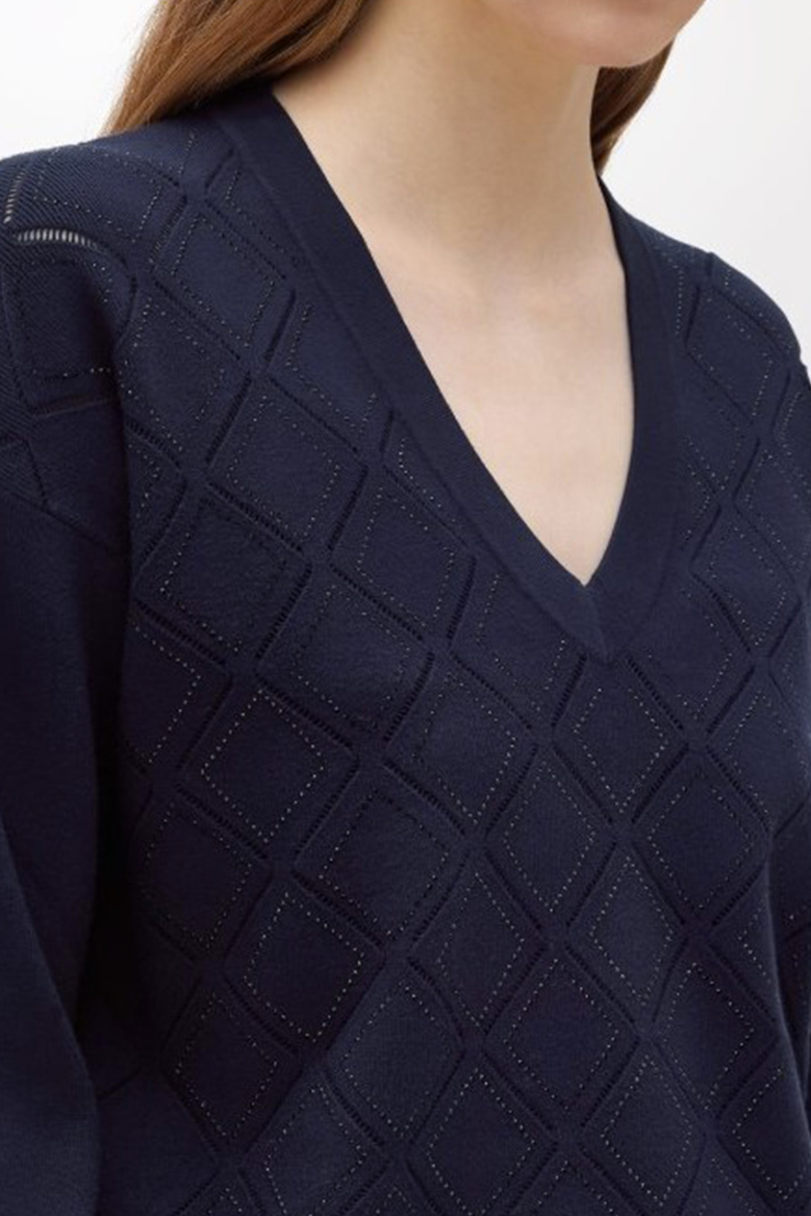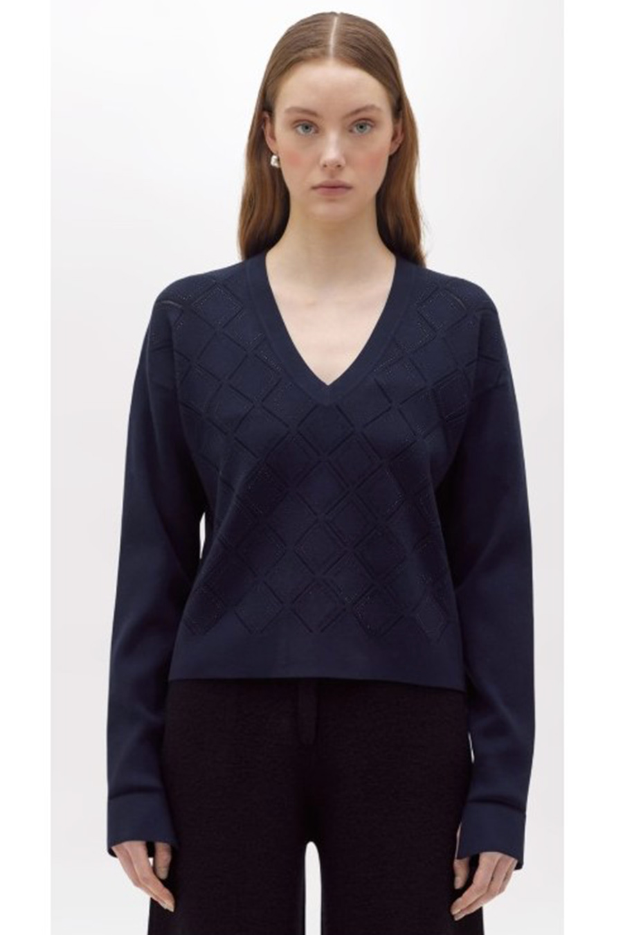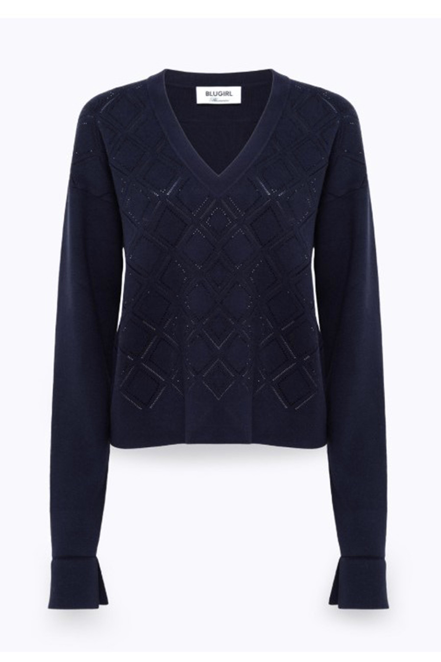 Blugirl viscose jumper with punched effect, diamond pattern illuminated by heat-activated rhinestones, V-neck, long sleeves with dropped shoulders, oversized fit.