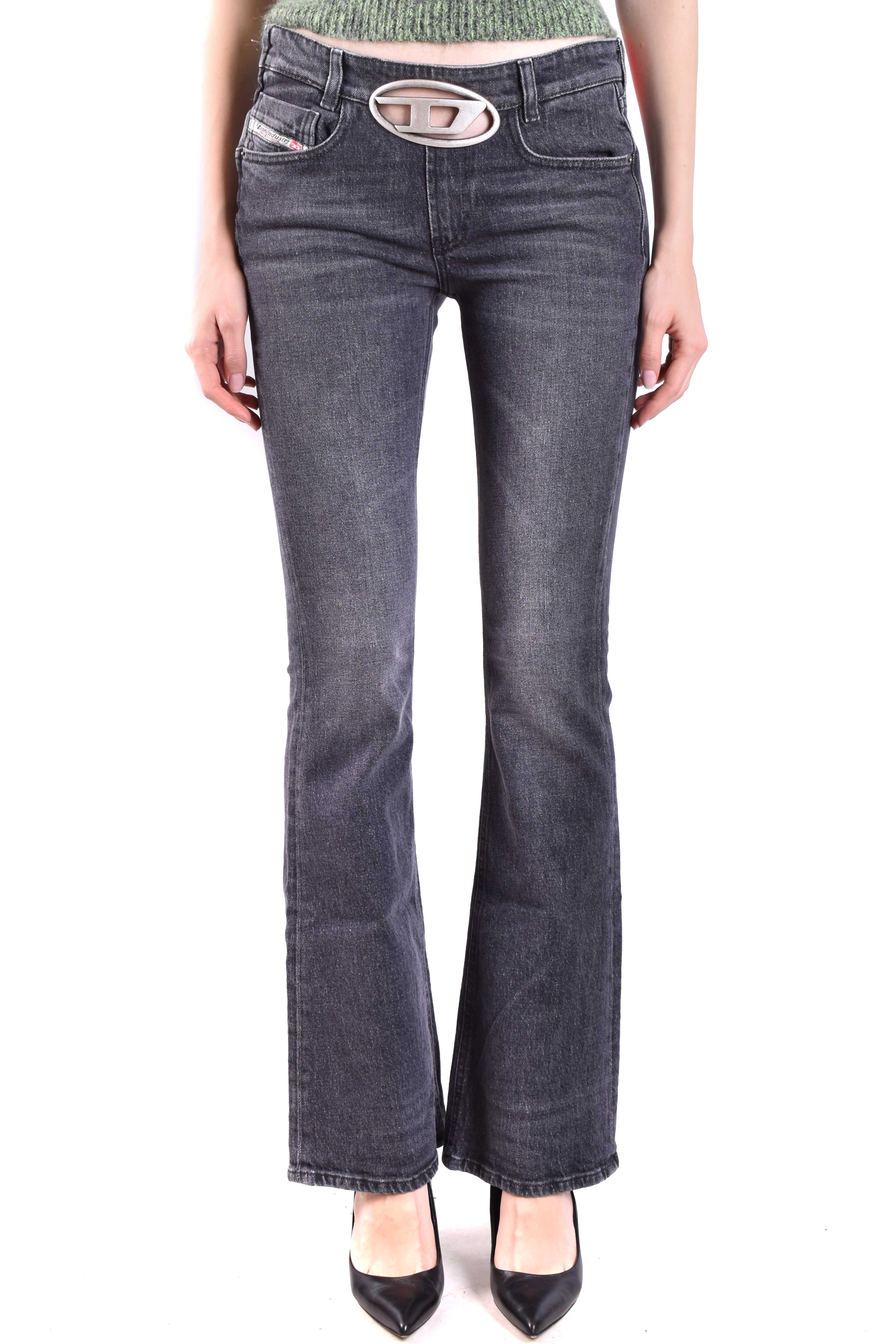 black jeans from Diesel featuring stretch-cotton, low-rise, flared, front zip fastening, classic five pockets.