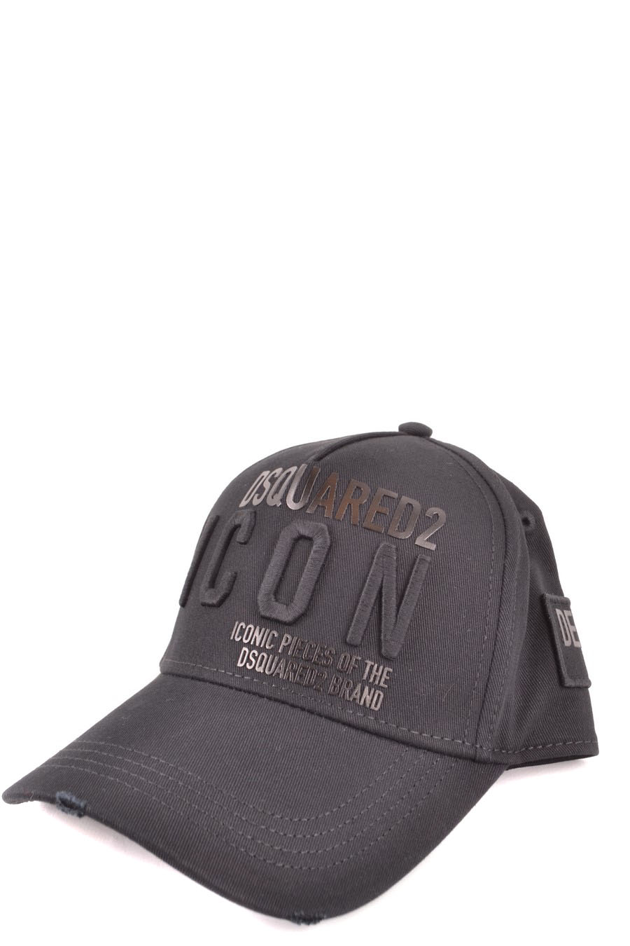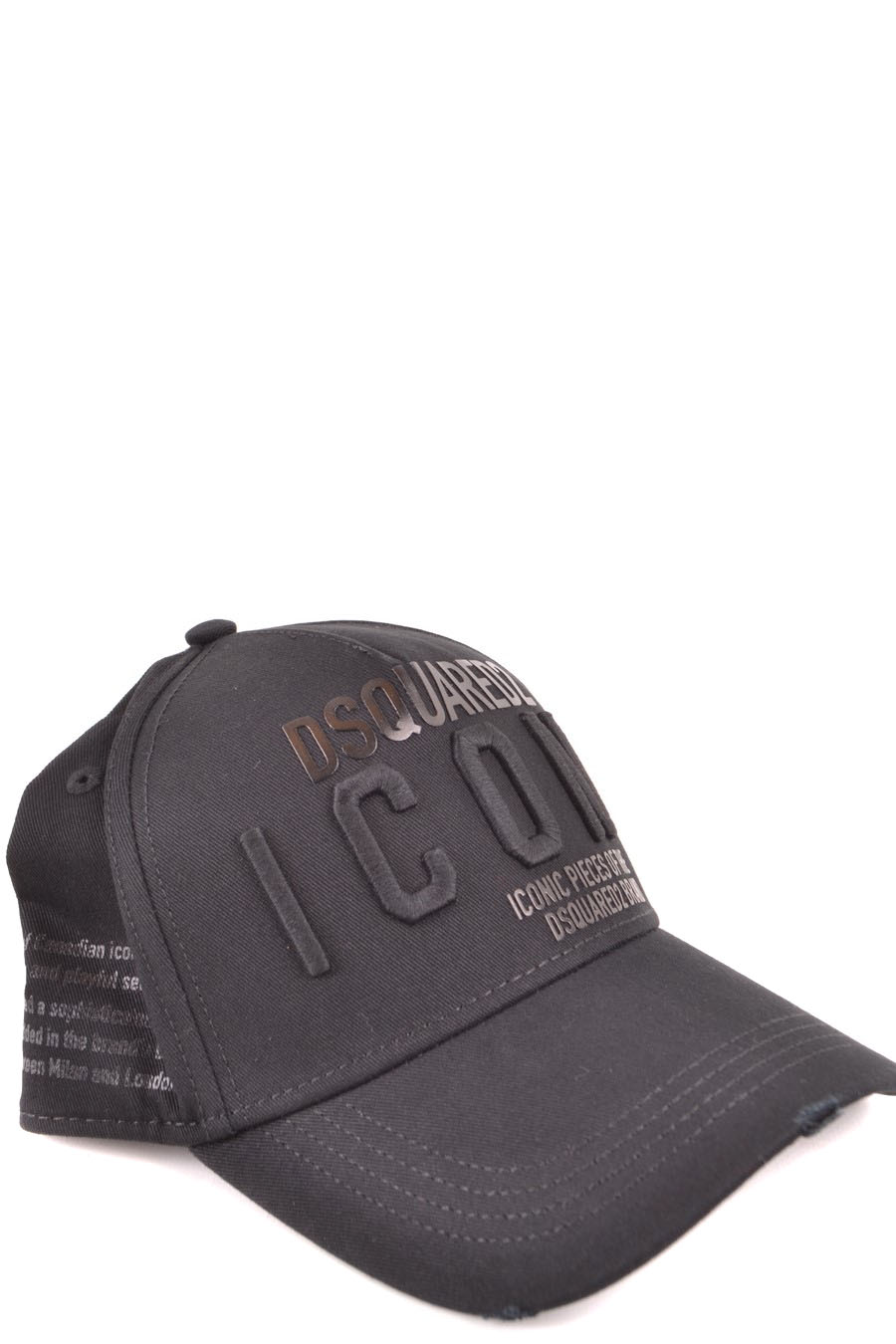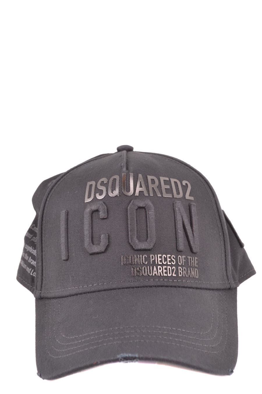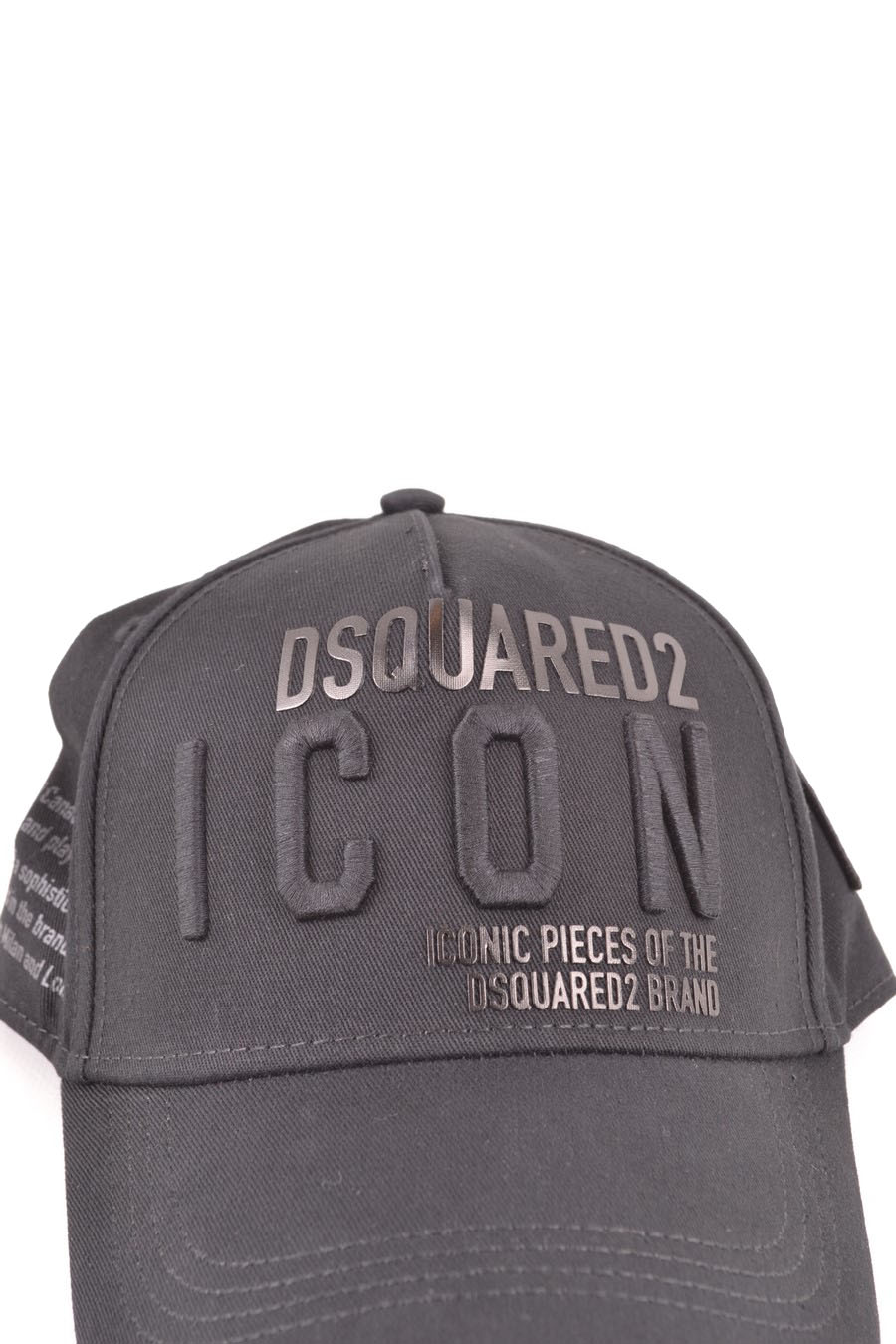 black cotton baseball cap from Dsdquared2, featuring distressed finish, 'Icon' embroidery in front, a patch applied at the side, adjustable strap back and printed at the side, embroidered logo to the back