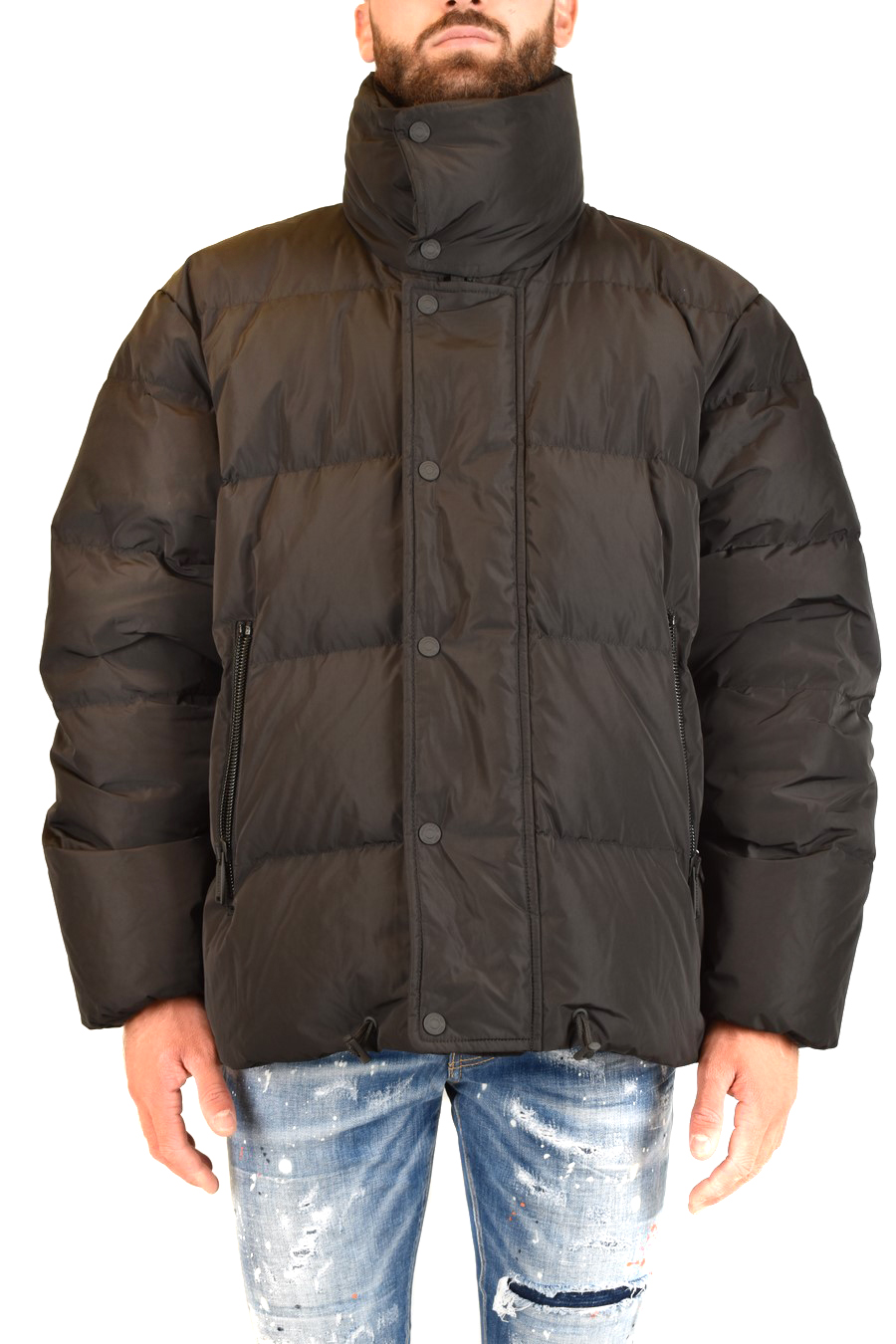 black feather jacket from Dsquared2 featuring high collar with rear print lettering, concealed front zip fastening, side zip pockets, quilted style, flared hem, oversize fit