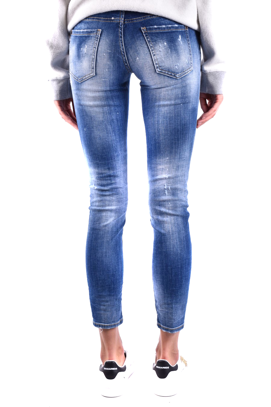 blue stretch-cotton jeans from Dsquared2 featuring belt loops, five pockets as design, front button and zip fastening, distressed effect, paint splatter design, straight leg, cropped lenght