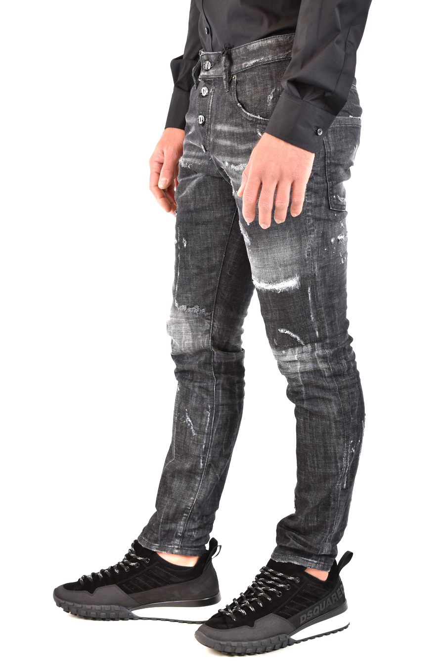 black cotton blend jeans from Dsquared2 featuring loops belt, five pockets as design, mid rise, front button fastening, ripped detailing.