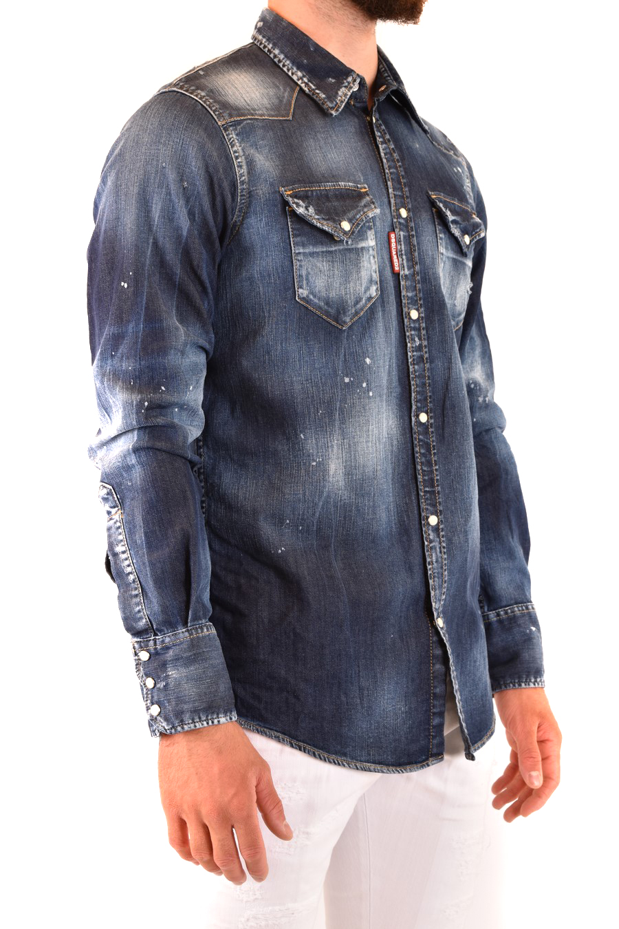 blue denim cotton blend shirt from Dsquared2 featuring classic collar, long sleeves. front snap button fastening, medium stone washed, curved hem