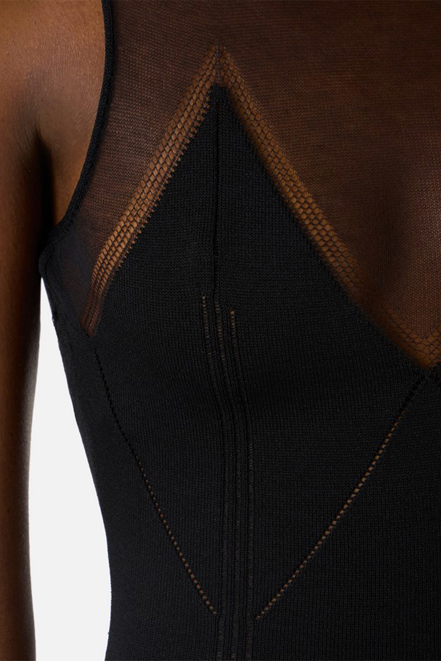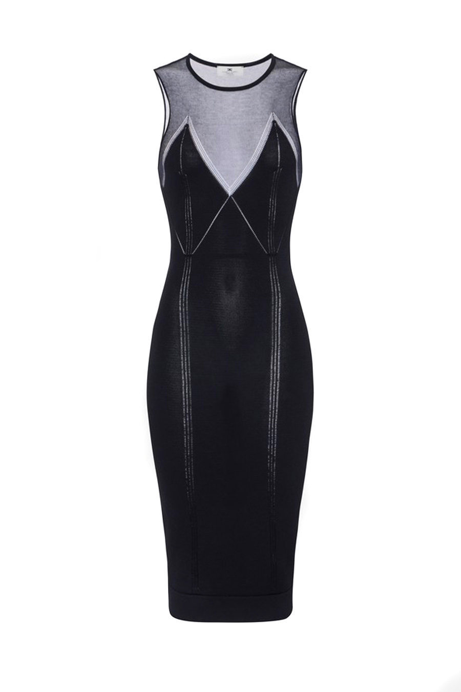 Elisabetta Franchi sheer knit dress with a round neckline and knee-length skirt, mesh yoke finished with openwork stitching to create a sensual sheer effect.