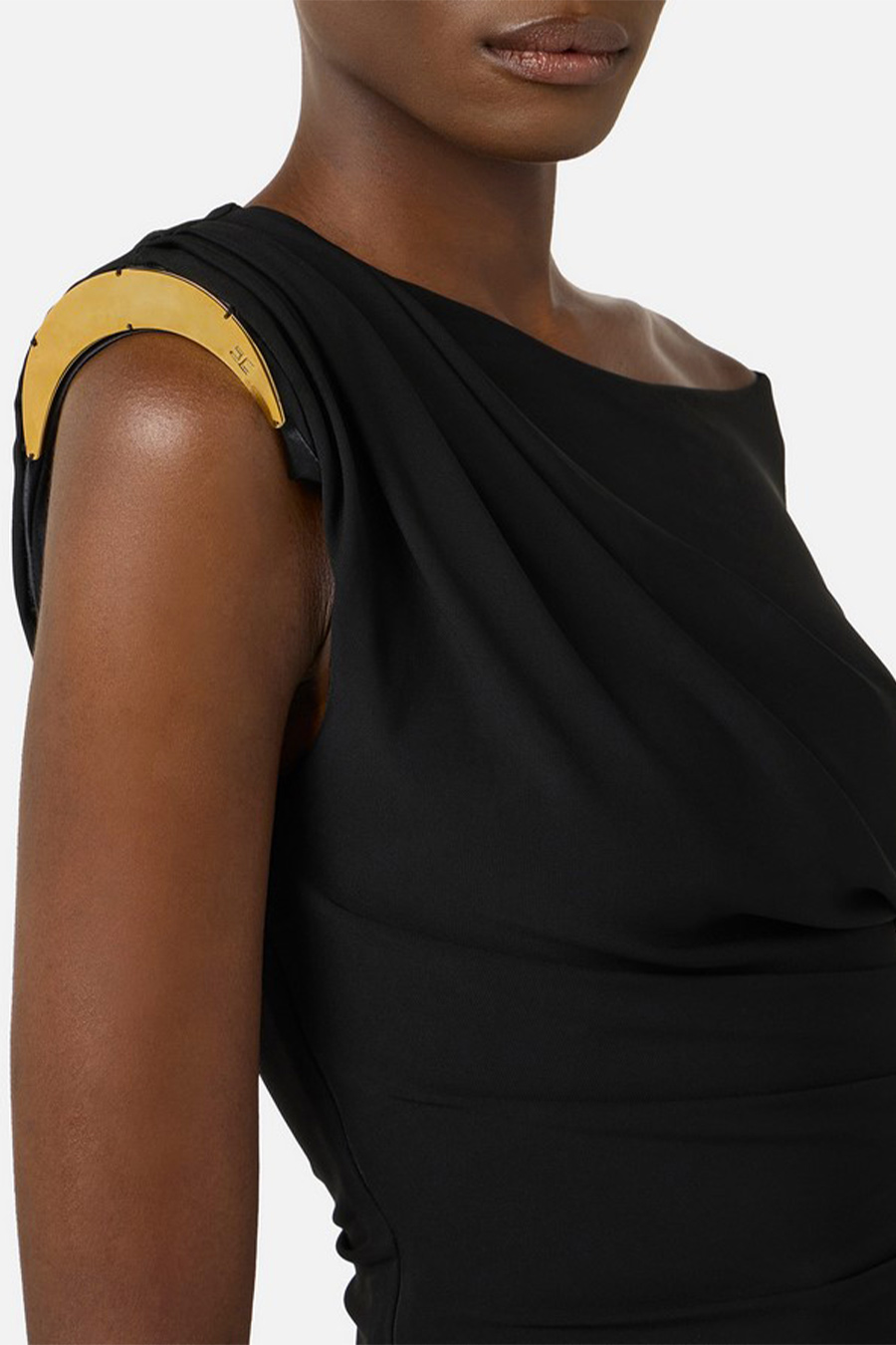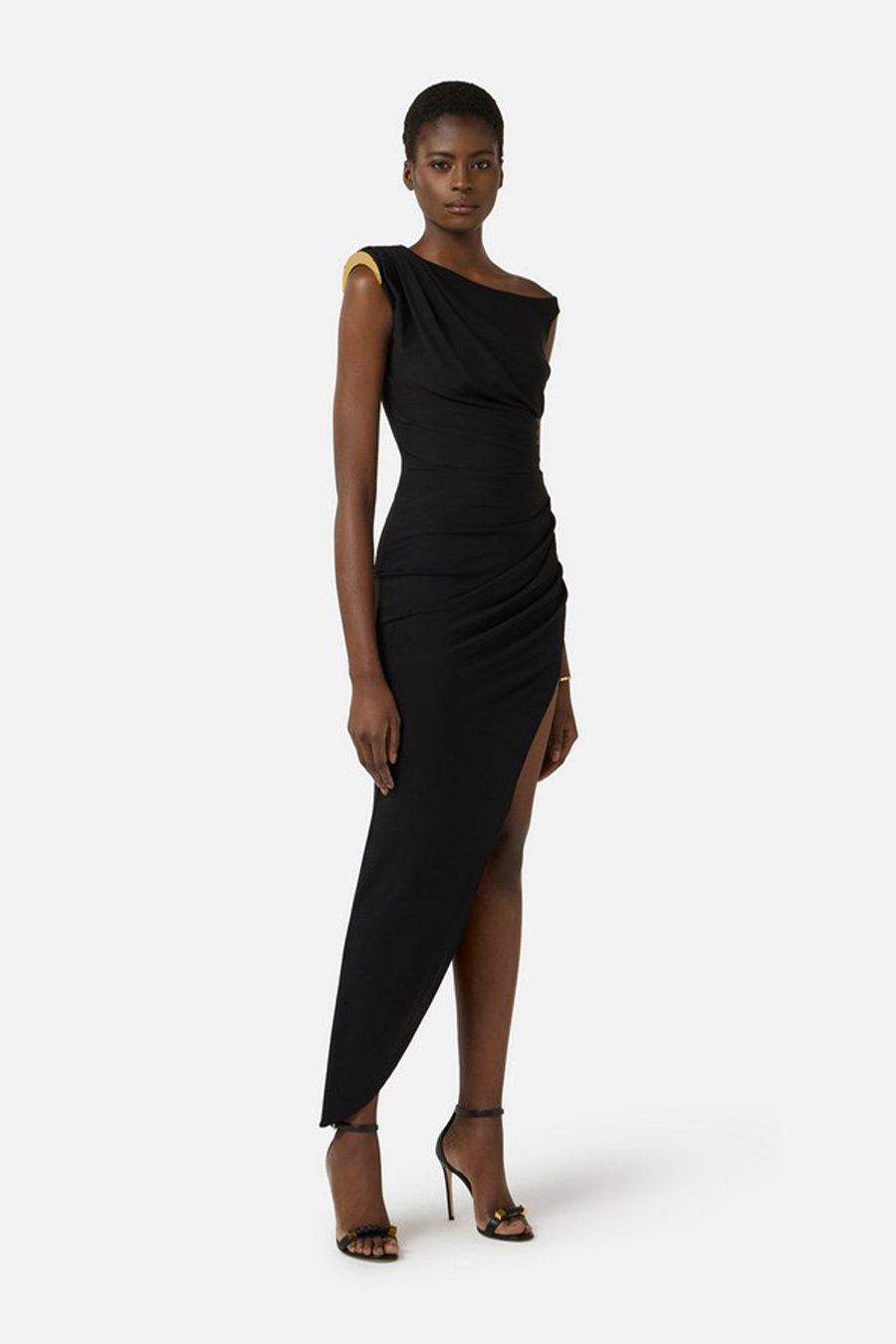 Elisabetta Franchi dress in crêpe jersey with structured one-shoulder jewelled strap fastened with a gold metal half-moon clasp. The skirt has an asymmetrical cut, enhanced by a deep side slit for a seductive touch.