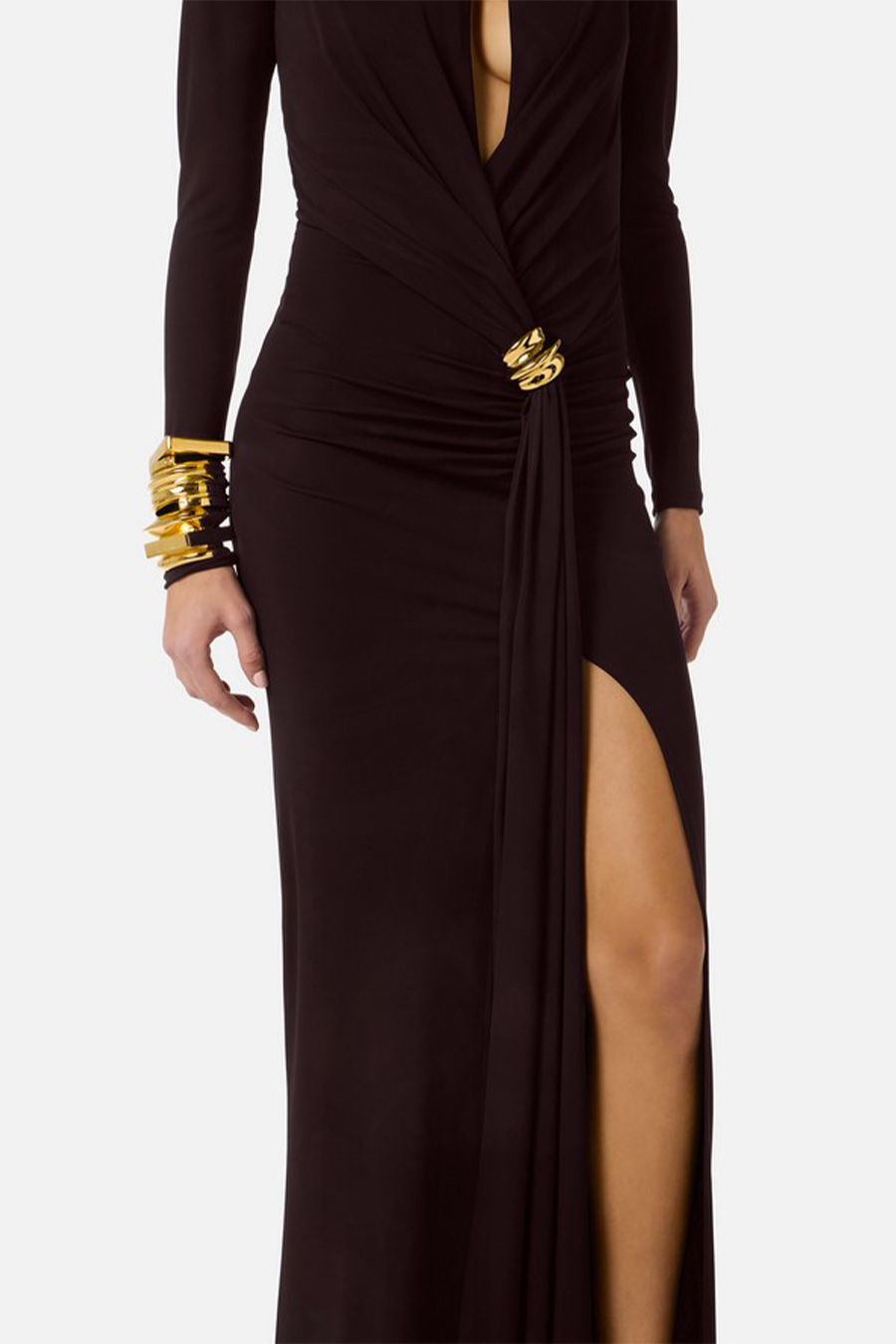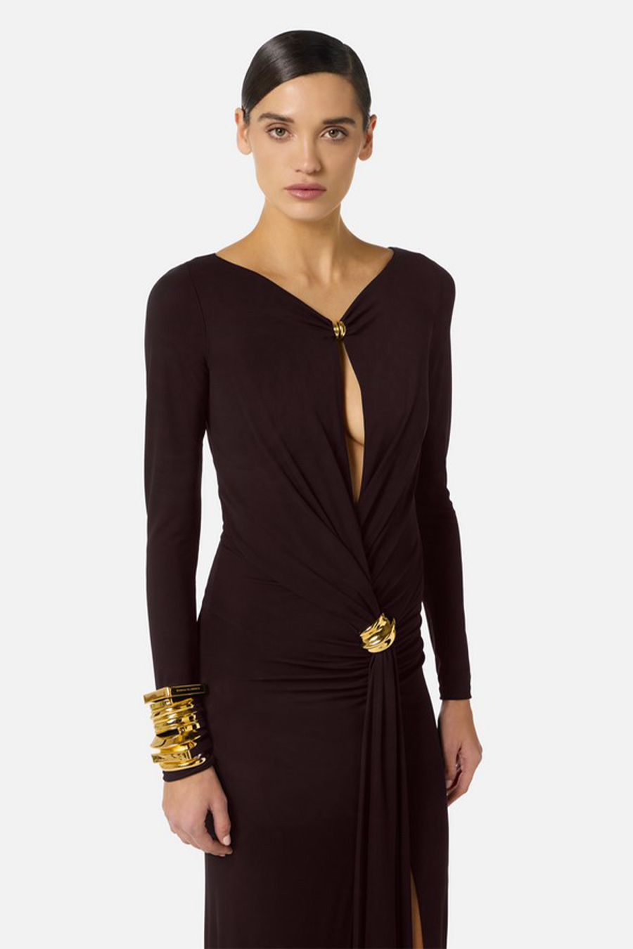 Elisabetta Franchi red carpet dress with jewelled details in crêpe jersey, distinguished by the cut-out on the bust, held in place by jewelled fasteners that add sparkle.