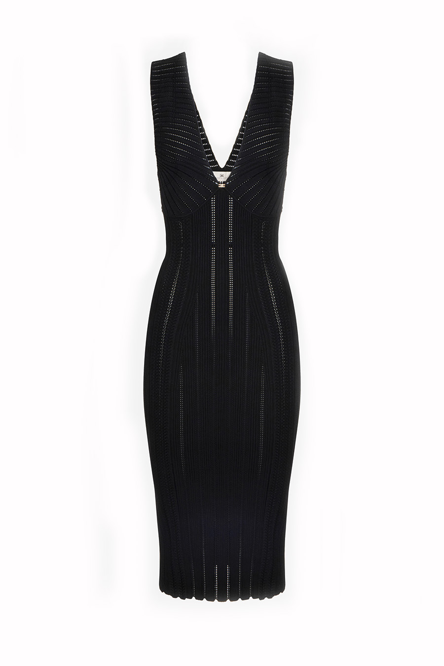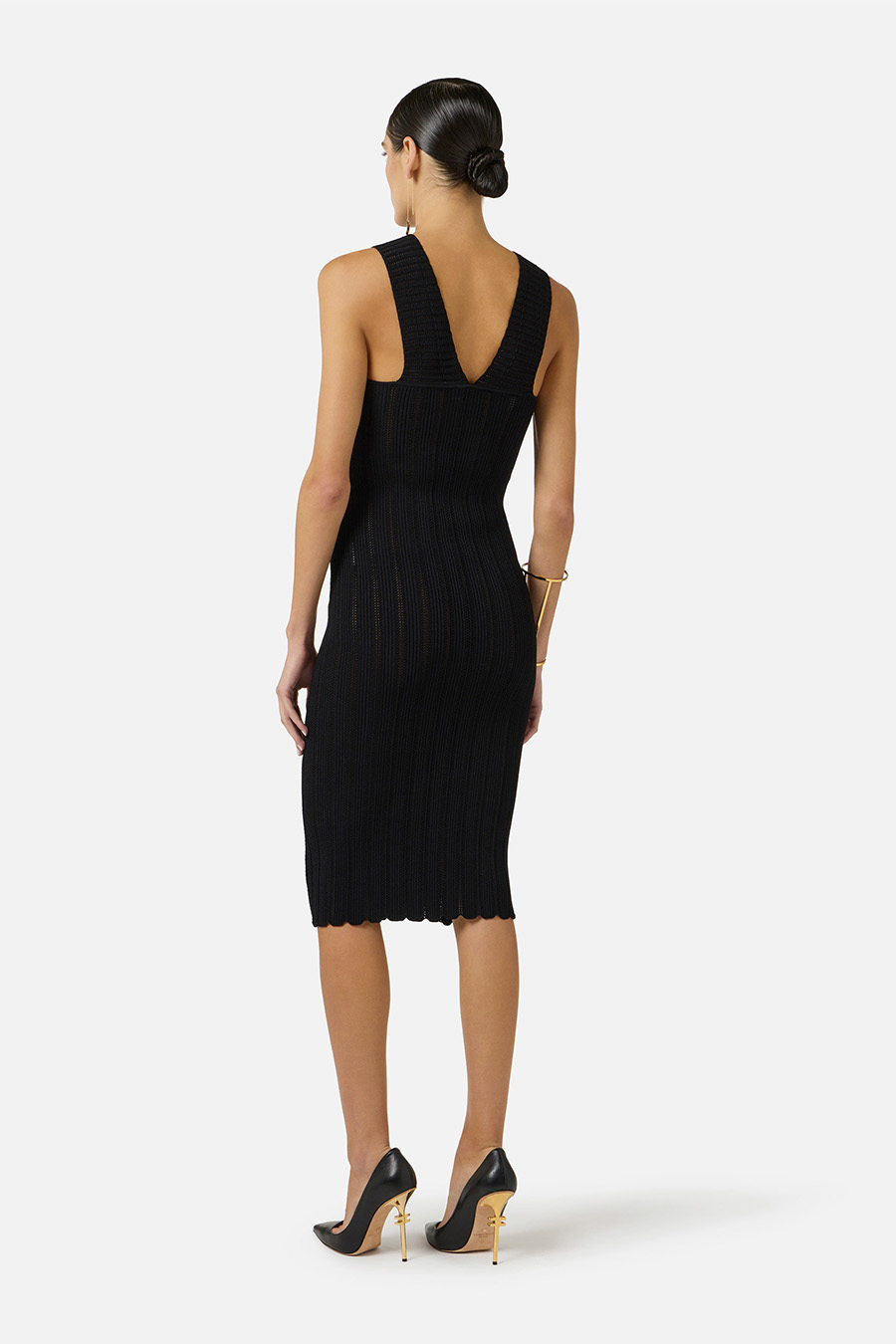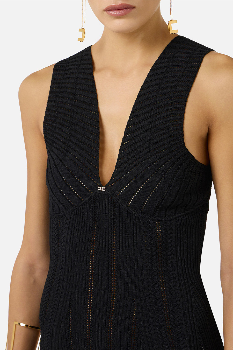 Elisabetta Franchi openwork knit dress with V-neckline and midi skirt, logo detail on the bust embellished with rhinestones.
