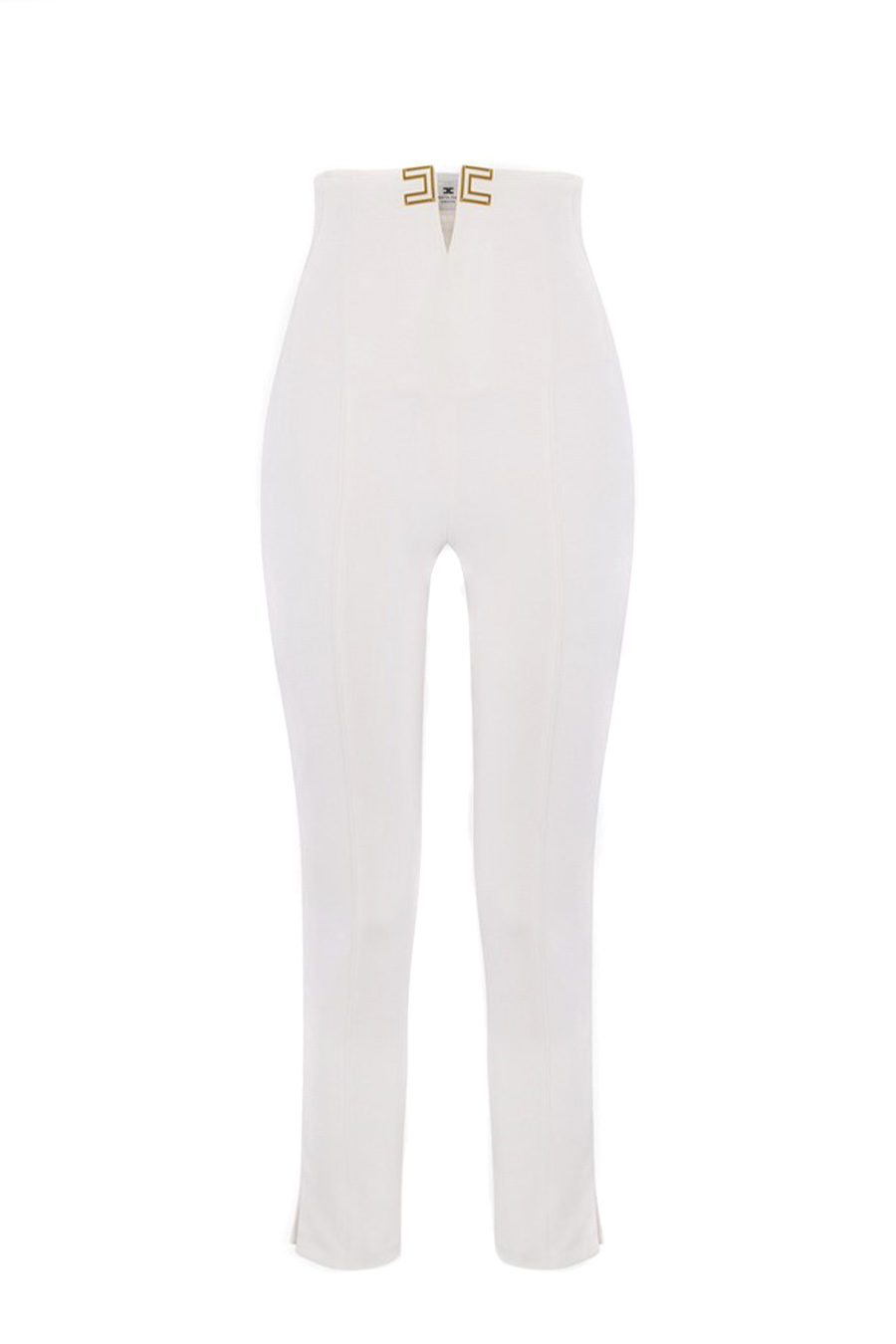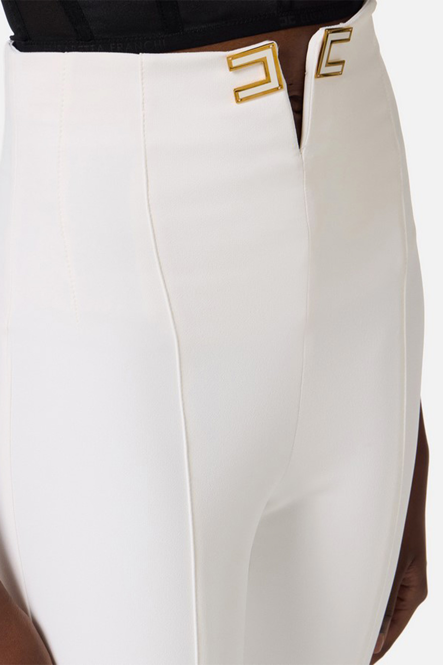 Elisabetta Franchi double stretch crepe trousers, featuring a central V-shaped opening at the waist, embellished with gold metal logo details and enamelled on the inside, with side slits at the bottom of the leg.