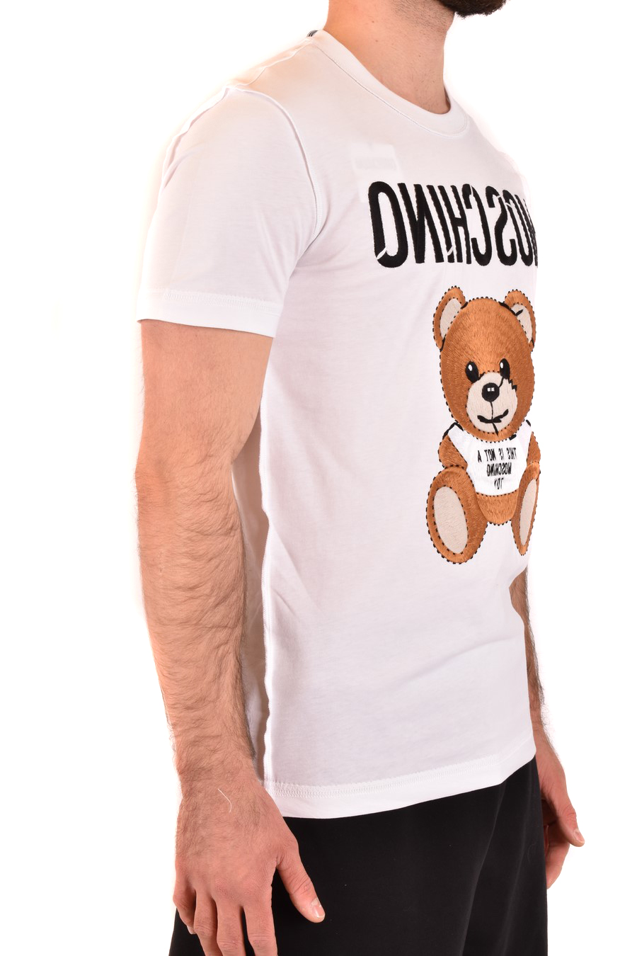 white cotton t-shirt from Moschino featuring rounde neck, short sleeves, logo and teddy bear embroidered to the front, straight hem