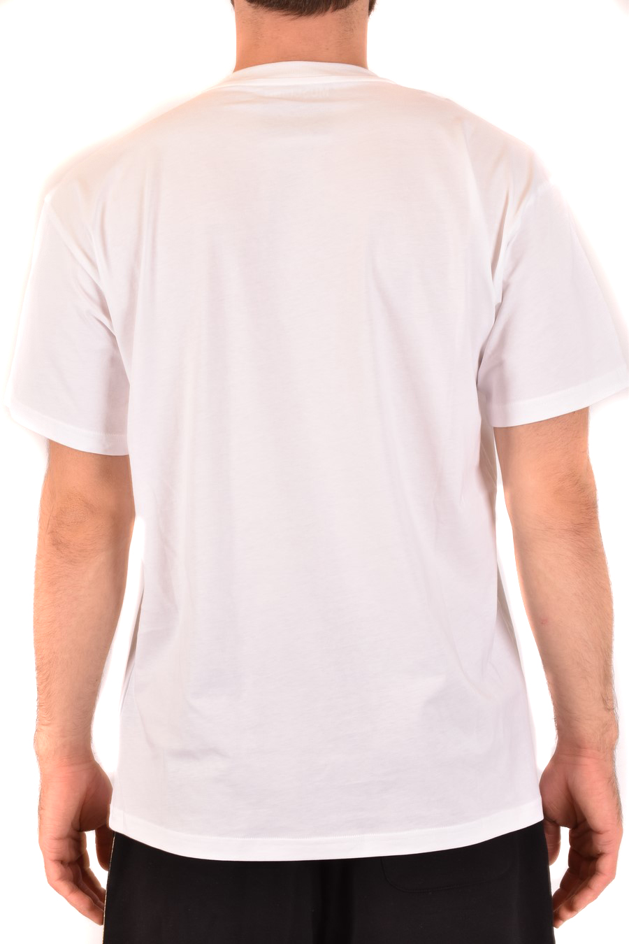 white cotton t-shirt from Moschino featuring round neck, short sleeves, patch gold-tone logo at the front, straight hem