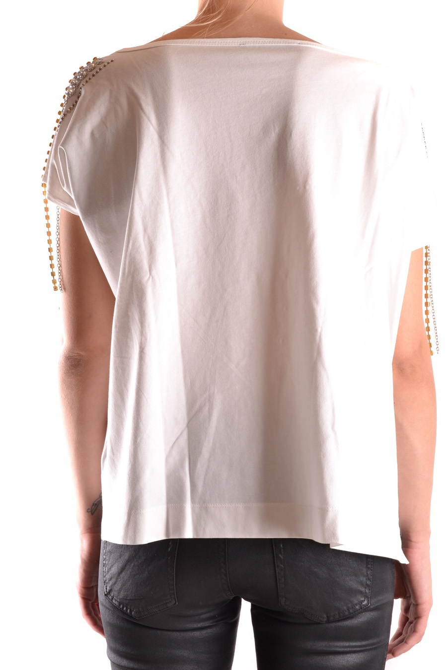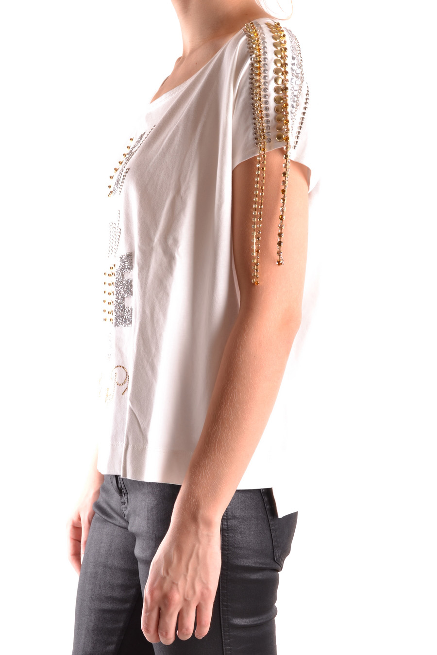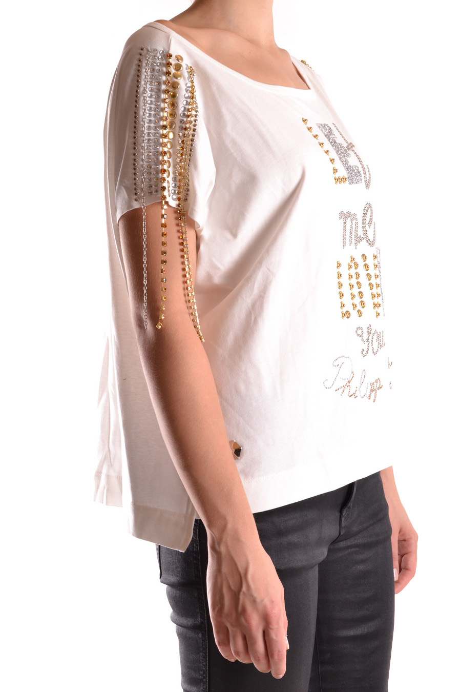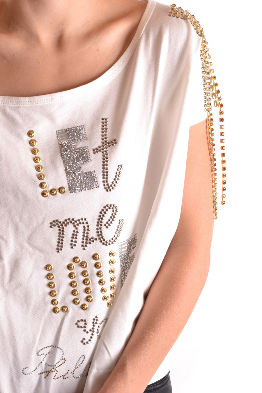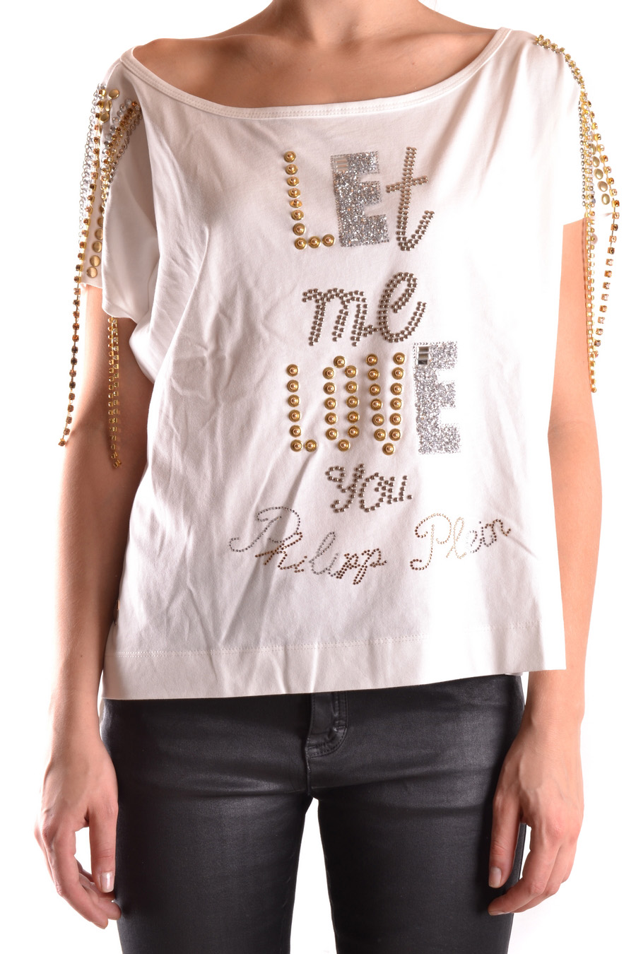 pleasem - over size wide round neck t-shirt decorated in front and on the shoulder with studs and metallic chain