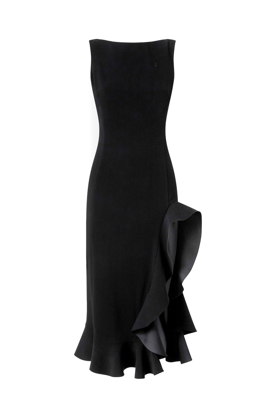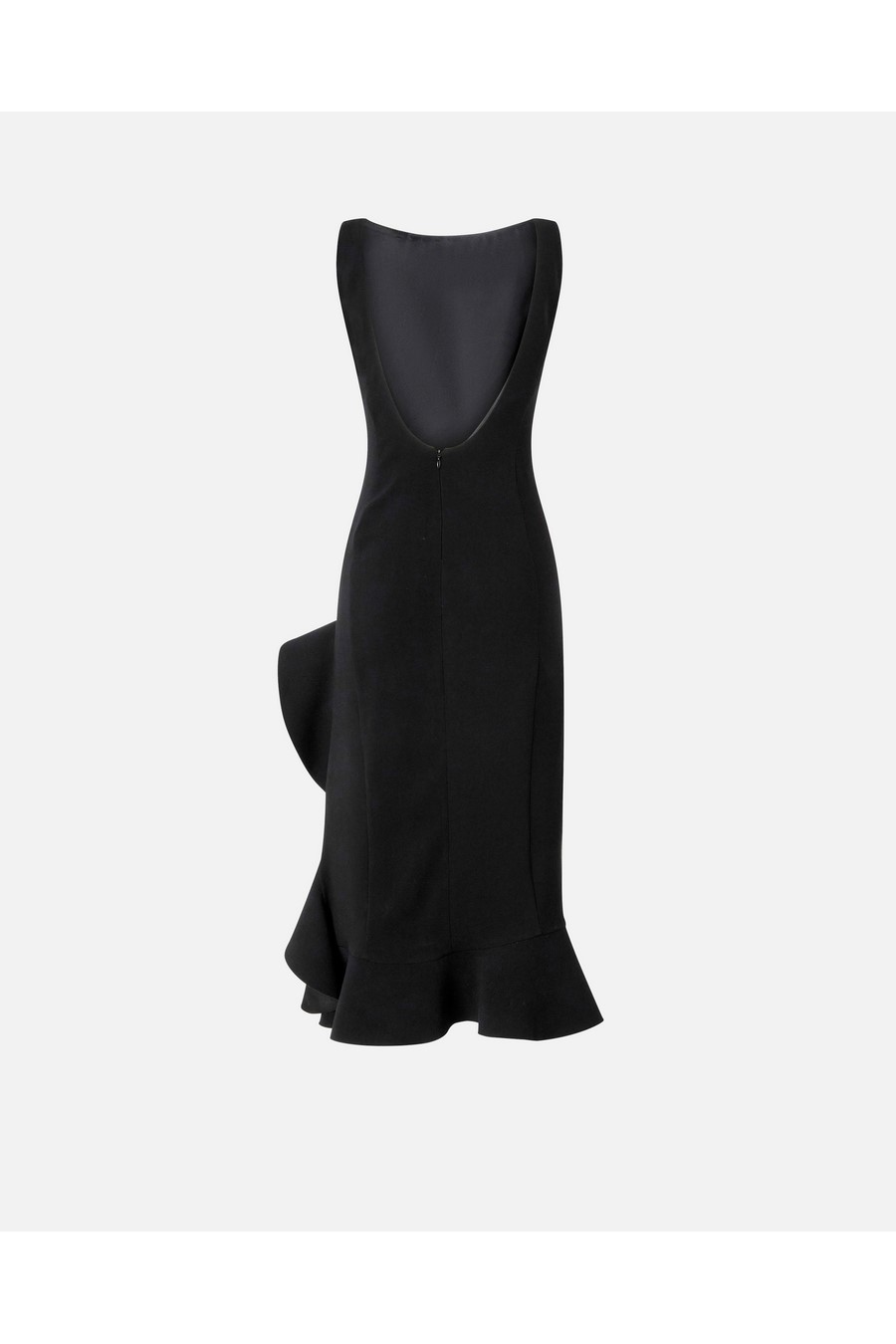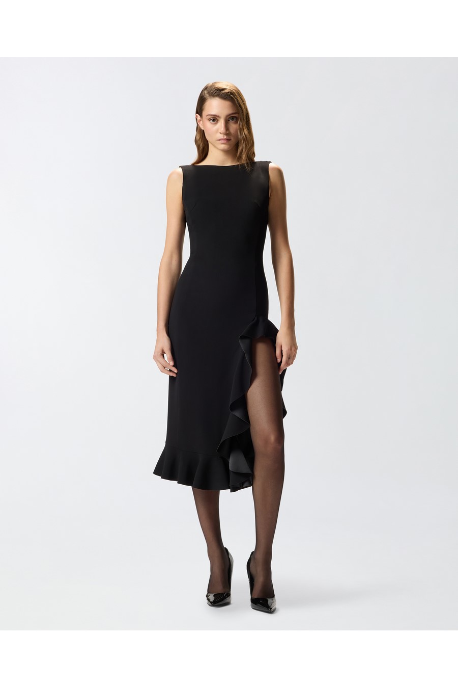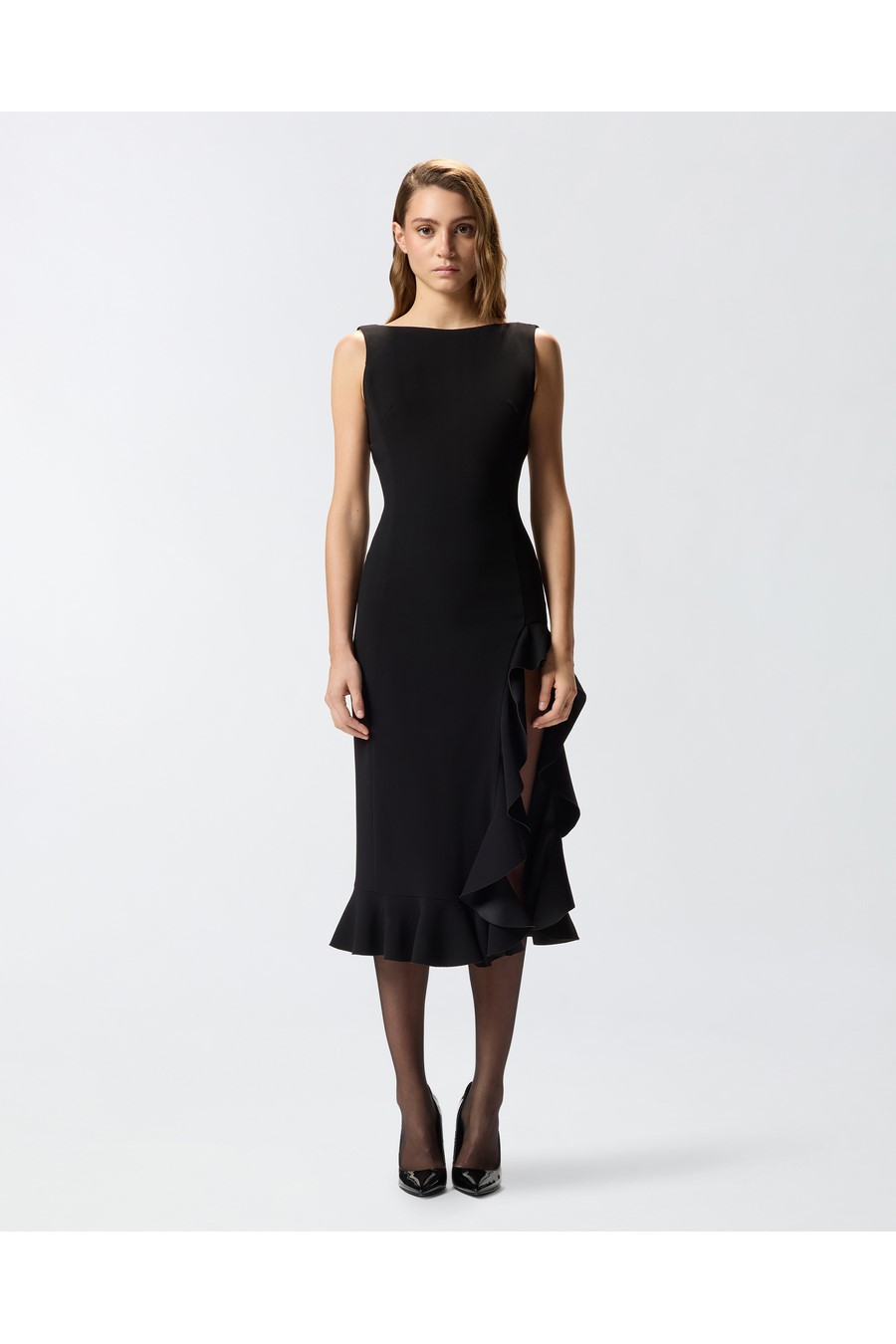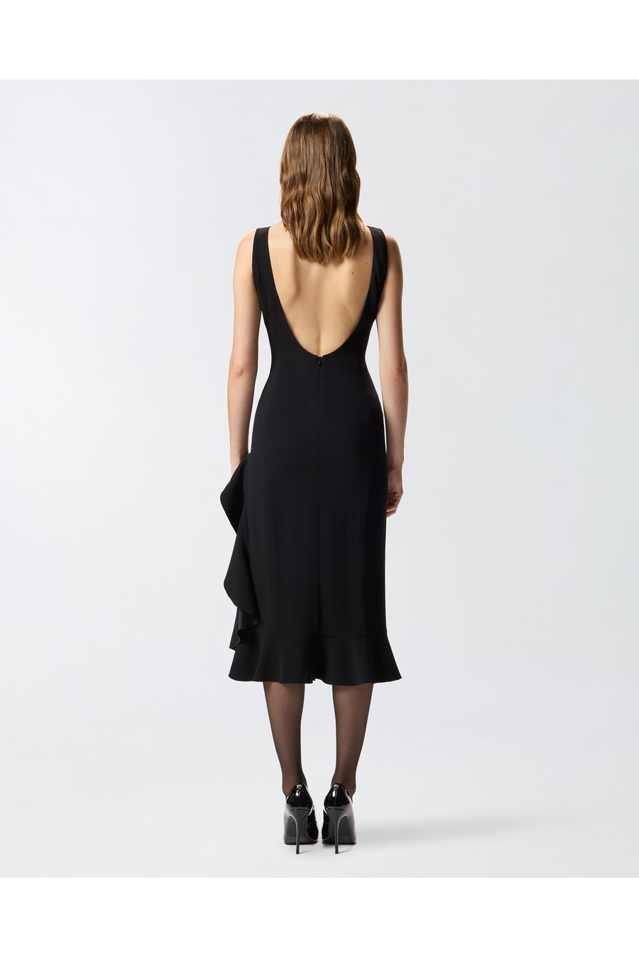 Pinko sleeveless maxi dress with a plunging back neckline, made from stretch viscose fabric for an optimal fit. The laser-cut spiral ruffles paired with satin create a contrast between shiny and matte that enhances the texture of the fabric.