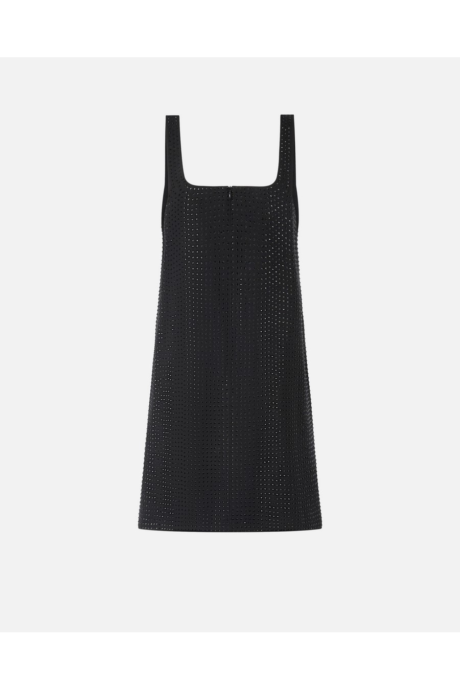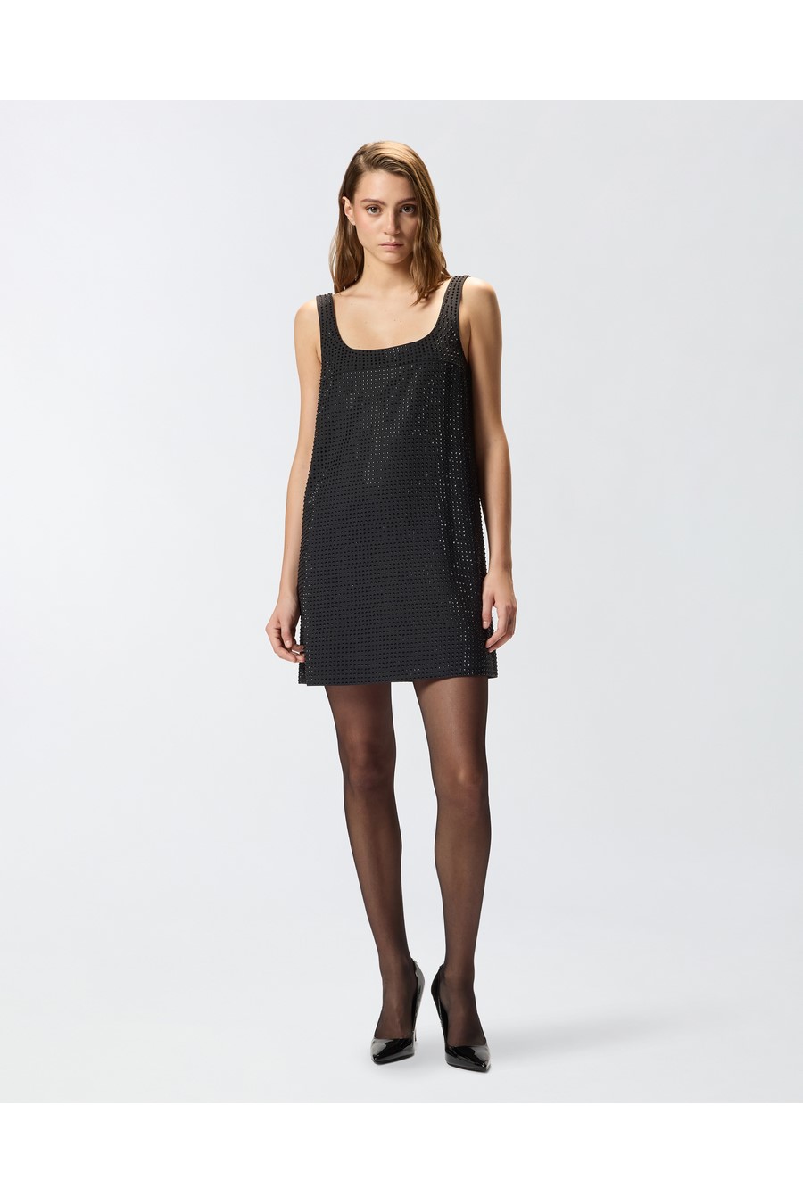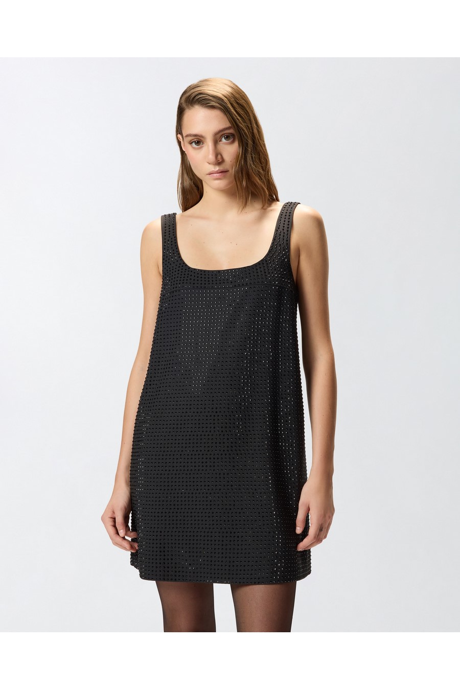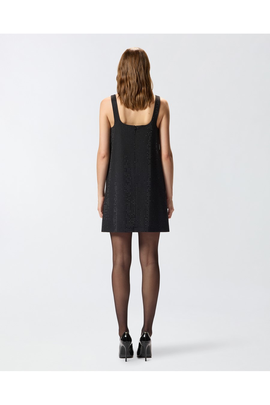 Pinko short dress with rhinestones, slightly flared silhouette with straps, square neckline and zip at the back, with countless matching rhinestones.
